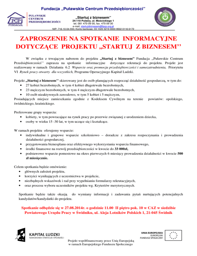 Fundacja „Puławskie Centrum Przedsiębiorczości” „Startuj z biznesem” 24-110 Puławy, ul. Mościckiego 1 tel. 081 470 09 00, fax. 470 09 30 e-mail: [email protected] NIP: 716-10-04-550; Konto bankowe: 03 1020 3219 0000 9502 0116 6172 ZAPROSZENIE NA SPOTKANIE INFORMACYJNE DOTYCZĄCE PROJEKTU ,,STARTUJ Z BIZNESEM’’ W związku z trwającym naborem do projektu „Startuj z biznesem” Fundacja ,,Puławskie Centrum Przedsiębiorczości’’ zaprasza na spotkanie informacyjne dotyczące rekrutacji do projektu. Projekt jest realizowany w ramach Działania 6.2 Wsparcie oraz promocja przedsiębiorczości i samozatrudnienia, Priorytetu VI Rynek pracy otwarty dla wszystkich, Programu Operacyjnego Kapitał Ludzki. Projekt ,,Startuj z biznesem’’ skierowany jest do osób planujących rozpocząć działalność gospodarczą, w tym do: • 27 kobiet bezrobotnych, w tym 4 kobiet długotrwale bezrobotnych, • 23 mężczyzn bezrobotnych, w tym 4 mężczyzn długotrwale bezrobotnych, • 10 osób nieaktywnych zawodowo, w tym 5 kobiet i 5 mężczyzn, Posiadających miejsce zamieszkania zgodnie z Kodeksem Cywilnym na terenie powiatów: opolskiego, świdnickiego, kraśnickiego. Preferowane grupy wsparcia: • kobiety, w tym powracające na rynek pracy po przerwie związanej z urodzeniem dziecka, • osoby w wieku 15 -30 lat, w tym uczące się i kształcące. W ramach projektu oferujemy wsparcie: • indywidualne i grupowe wsparcie szkoleniowo – doradcze z zakresu rozpoczynania i prowadzenia działalności gospodarczej, • przygotowania biznesplanu oraz efektywnego wykorzystania wsparcia finansowego, • środki finansowe na rozwój przedsiębiorczości w kwocie do 33 000zł, • podstawowe wsparcie pomostowe na okres pierwszych 6 miesięcy prowadzenia działalności w kwocie 500 zł miesięcznie. Celem spotkania będzie omówienie: • głównych założeń projektu, • korzyści wynikających z uczestnictwa w projekcie, • niezbędnych wskazówek i rad przy wypełnianiu formularzy rekrutacyjnych, • oraz procesu wyboru uczestników projektu wg. Kryteriów merytorycznych. Spotkanie będzie także okazją do wymiany informacji i zadawania pytań nurtujących potencjalnych kandydatów/kandydatki do projektu. Spotkanie odbędzie się w 27.08.2014r. o godzinie 11.00 II piętro pok. 10 w CAZ w siedzibie Powiatowego Urzędu Pracy w Świdniku, ul. Aleja Lotników Polskich 1, 21-045 Świdnik Projekt współfinansowany przez Unię Europejską w ramach Europejskiego Funduszu Społecznego