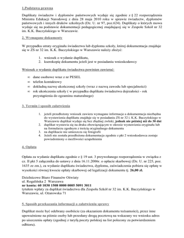 1.Podstawa prawna Duplikaty świadectw i dyplomów państwowych wydaje się zgodnie z § 22 rozporządzenia Ministra Edukacji Narodowej z dnia 28 maja 2010 roku w sprawie świadectw, dyplomów państwowych i innych druków szkolnych (Dz. U. nr 97, poz.624). Duplikaty o których mowa wydaje się na podstawie dokumentacji pedagogicznej znajdującej się w Zespole Szkół nr 32 im. K.K. Baczyńskiego w Warszawie. 2. Wymagane dokumenty W przypadku utraty oryginału świadectwa lub dyplomu szkoły, której dokumentacja znajduje się w ZS nr 32 im. K.K. Baczyńskiego w Warszawie należy złożyć: 1. wniosek o wydanie duplikatu, 2. kserokopię dokumentu jeżeli jest w posiadaniu wnioskodawcy Wniosek o wydanie duplikatu świadectwa powinien zawierać: • • • • dane osobowe wraz z nr PESEL telefon kontaktowy dokładną nazwę ukończonej szkoły (wraz z nazwą zawodu lub specjalności) rok ukończenia szkoły ( w przypadku duplikatu świadectwa dojrzałości - rok przystąpienia do egzaminu maturalnego) 3. Termin i sposób załatwienia 1. jeżeli przedłożony wniosek zawiera wymagane informacje a dokumentacja niezbędna do wystawienia duplikatu znajduje się w posiadaniu ZS nr 32 i. K.K. Baczyńskiego w Warszawie duplikat wydaje się bez zbędnej zwłoki, jednak nie później niż do 30 dni 2. duplikat wystawia się na druku obowiązującym w okresie wystawienia oryginału lub na formularzu zgodnym z treścią oryginalnego dokumentu 3. na duplikacie nie umieszcza się fotografii 4. Jeżeli nie została przedłożona dokumentacja zgodnie z pkt 2 wnioskodawca zostaje powiadomiony o możliwości uzupełnienia 4. Opłata Opłata za wydanie duplikatu zgodnie z § 19 ust. 3 przywołanego rozporządzenia w związku z cz. II pkt 5 załącznika do ustawy z dnia 16.11.2006r. o opłacie skarbowej (Dz. U. nr 225, poz. 1635 ze zm.), za wydanie duplikatu świadectwa, dyplomu, zaświadczenia pobiera się opłatę w wysokości równej kwocie opłaty skarbowej od legalizacji dokumentu tj. 26,00 zł. Dzielnicowe Biuro Finansów Oświaty ul. Rogalińska 2 Warszawa nr konta: 60 1030 1508 0000 0005 5091 3011 tytułem wpłaty za duplikat świadectwa dla Zespołu Szkół nr 32 im. K.K. Baczyńskiego w Warszawie, ul. Ożarowska 71 5. Sposób przekazania informacji o załatwieniu sprawy Duplikat może być odebrany osobiście (za okazaniem dokumentu tożsamości), przez inne upoważnione na piśmie osoby lub przesłany drogą pocztową na wskazany we wniosku adres po uiszczeniu opłaty (zgodnej z taryfą poczty polskiej na list polecony za potwierdzeniem odbioru).