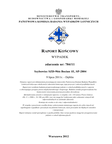 MINISTERSTWO TRANSPORTU, BUDOWNICTWA i GOSPODARKI MORSKIEJ PAŃSTWOWA KOMISJA BADANIA WYPADKÓW LOTNICZYCH RAPORT KOŃCOWY WYPADEK zdarzenie nr: 784/11 Szybowiec SZD-9bis Bocian 1E, SP-2804 9 lipca 2011r. - Dęblin Niniejszy raport jest dokumentem prezentującym stanowisko Państwowej Komisji Badania Wypadków Lotniczych dotyczące okoliczności zdarzenia lotniczego, jego przyczyn i zaleceń profilaktycznych. Raport jest wynikiem badania przeprowadzonego jedynie w celach profilaktycznych w oparciu o obowiązujące przepisy prawa międzynarodowego i krajowego. Badanie zostało przeprowadzone bez konieczności stosowania prawnej procedury dowodowej. Sformułowania zawarte w niniejszym raporcie, w związku z Art. 134 ustawy Prawo lotnicze (Dz. U. z 2006 r., Nr 100, poz.696 z zm.) nie mogą być traktowane jako wskazanie winnych lub odpowiedzialnych za zaistniałe zdarzenie. Komisja nie orzeka co do winy i odpowiedzialności. W związku z powyższym wszelkie formy wykorzystania niniejszego raportu do celów innych niż zapobieganie wypadkom i poważnym incydentom lotniczym, może prowadzić do błędnych wniosków i interpretacji. Raport niniejszy został sporządzony w języku polskim. Inne wersje językowe mogą być przygotowywane jedynie w celach informacyjnych. Warszawa 2012 Państwowa Komisja Badania Wypadków Lotniczych Szybowiec SZD-9bis Bocian 1E SP-2804, data 9 lipca 2011 r., miejscowość Dęblin SPIS TREŚCI Informacje ogólne ........................................................................................................................................ 3 Streszczenie ................................................................................................................................................. 3 1. INFORMACJE FAKTYCZNE. ........................................................................................................... 5 1.1. Historia lotu. ................................................................................................................................. 5 1.2. Obrażenia osób. ............................................................................................................................ 5 1.3. Uszkodzenia statku powietrznego ................................................................................................. 5 1.4. Inne uszkodzenia. .......................................................................................................................... 6 1.5. Informacje o składzie osobowym (dane o załodze). ..................................................................... 6 1.6. Informacje o statku powietrznym. ................................................................................................ 6 1.7. Informacje meteorologiczne. ........................................................................................................ 7 1.8. Pomoce nawigacyjne. ................................................................................................................... 7 1.9. Łączność. ...................................................................................................................................... 7 1.10. Informacje o miejscu zdarzenia. ................................................................................................. 7 1.11. Rejestratory pokładowe. ............................................................................................................. 8 1.12. Informacje o szczątkach i zderzeniu. .......................................................................................... 8 1.13.Informacje medyczne i patologiczne. .......................................................................................... 8 1.14. Pożar. .......................................................................................................................................... 8 1.15. Czynniki przeżycia...................................................................................................................... 8 1.16. Badania i ekspertyzy. .................................................................................................................. 8 1.17. Informacje o organizacjach i działalności administracyjnej. ...................................................... 8 1.18. Informacje uzupełniające. ........................................................................................................... 9 1.19. Użyteczne lub efektywne metody badań. .................................................................................... 9 2. ANALIZA. ........................................................................................................................................... 9 3.WNIOSKI KOŃCOWE. ..................................................................................................................... 11 3.1. Ustalenia komisji. ....................................................................................................................... 11 3.2. Przyczyna wypadku .................................................................................................................... 12 4. ZALECENIA DOTYCZĄCE BEZPIECZEŃSTWA. ....................................................................... 13 5.ZAŁĄCZNIKI. ................................................................................................................................... 13 RAPORT KOŃCOWY Strona 2 z 13 Państwowa Komisja Badania Wypadków Lotniczych Szybowiec SZD-9bis Bocian 1E SP-2804, data 9 lipca 2011 r., miejscowość Dęblin INFORMACJE OGÓLNE Rodzaj zdarzenia: Rodzaj i typ statku powietrznego: Znaki rozpoznawcze statku powietrznego: Dowódca statku powietrznego: Wypadek Szybowiec SZD-9bis Bocian 1E SP-2804 Uczeń-pilot szybowcowy Organizator lotów/skoków: Aeroklub Orląt w Dęblinie Użytkownik statku powietrznego: Aeroklub Orląt w Dęblinie Właściciel statku powietrznego: Aeroklub Orląt w Dęblinie Miejsce zdarze