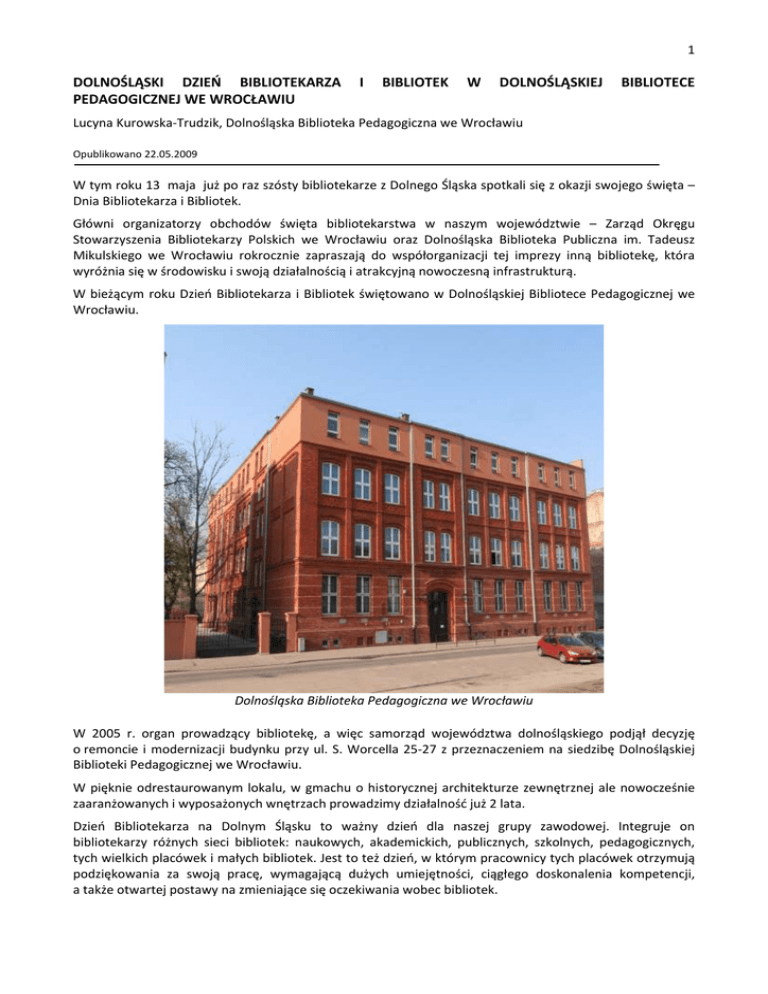 1 DOLNOŚLĄSKI DZIEŃ BIBLIOTEKARZA PEDAGOGICZNEJ WE WROCŁAWIU I BIBLIOTEK W DOLNOŚLĄSKIEJ BIBLIOTECE Lucyna Kurowska-Trudzik, Dolnośląska Biblioteka Pedagogiczna we Wrocławiu Opublikowano 22.05.2009 W tym roku 13 maja już po raz szósty bibliotekarze z Dolnego Śląska spotkali się z okazji swojego święta – Dnia Bibliotekarza i Bibliotek. Główni organizatorzy obchodów święta bibliotekarstwa w naszym województwie – Zarząd Okręgu Stowarzyszenia Bibliotekarzy Polskich we Wrocławiu oraz Dolnośląska Biblioteka Publiczna im. Tadeusz Mikulskiego we Wrocławiu rokrocznie zapraszają do współorganizacji tej imprezy inną bibliotekę, która wyróżnia się w środowisku i swoją działalnością i atrakcyjną nowoczesną infrastrukturą. W bieżącym roku Dzień Bibliotekarza i Bibliotek świętowano w Dolnośląskiej Bibliotece Pedagogicznej we Wrocławiu. Dolnośląska Biblioteka Pedagogiczna we Wrocławiu W 2005 r. organ prowadzący bibliotekę, a więc samorząd województwa dolnośląskiego podjął decyzję o remoncie i modernizacji budynku przy ul. S. Worcella 25-27 z przeznaczeniem na siedzibę Dolnośląskiej Biblioteki Pedagogicznej we Wrocławiu. W pięknie odrestaurowanym lokalu, w gmachu o historycznej architekturze zewnętrznej ale nowocześnie zaaranżowanych i wyposażonych wnętrzach prowadzimy działalność już 2 lata. Dzień Bibliotekarza na Dolnym Śląsku to ważny dzień dla naszej grupy zawodowej. Integruje on bibliotekarzy różnych sieci bibliotek: naukowych, akademickich, publicznych, szkolnych, pedagogicznych, tych wielkich placówek i małych bibliotek. Jest to też dzień, w którym pracownicy tych placówek otrzymują podziękowania za swoją pracę, wymagającą dużych umiejętności, ciągłego doskonalenia kompetencji, a także otwartej postawy na zmieniające się oczekiwania wobec bibliotek. 2 Powitanie gości Tegoroczne obchody Dnia Bibliotekarza i Bibliotek były wyjątkowo uroczyste, a rangę tego święta podniosło połączenie oficjalnych obchodów, które w ubiegłych latach odbywały się w formie odrębnych uroczystości miejskich i wojewódzkich. Toteż w tym roku gościliśmy w Dolnośląskiej Bibliotece Pedagogicznej we Wrocławiu wyjątkowo dużo bibliotekarzy przybyłych z całego województwa. Wśród szanownych gości był marszałek województwa dolnośląskiego Piotr Borys, dyrektor Departamentu Spraw Społecznych w Urzędzie Miejskim Dominik Golema, dyrektor Wydziału Edukacji i Nauki w Urzędzie Marszałkowskim Województwa Dolnośląskiego Grzegorz Łyczko, dyrektor Wydziału Kultury w Urzędzie Marszałkowskim Województwa Dolnośląskiego Jacek Gawroński, członek Zarządu Głównego SBP Ryszard Turkiewicz. Na obchodach tego święta nie zabrakło członków Zarządu Okręgu SBP we Wrocławiu i przewodniczących Zarządów Oddziałów SBP – wrocławskiego, kłodzkiego, jeleniogórskiego, legnickiego, wałbrzyskiego oraz dyrektorów wielu bibliotek dolnośląskiej sieci. Niezwykle miłym akcentem obchodów tegorocznego święta było wręczenie przez marszałka województwa wszystkim paniom bibliotekarkom po pięknej ciemnoczerwonej róży, a gospodyniom Biblioteki wspaniałych bukietów. Po okolicznościowych przemówieniach szanownych gości, rozpoczęto wręczanie bibliotekarzom indywidualnych nagród pieniężnych, medali i wyróżnień. Tradycyjnie Marszałek Województwa Dolnośląskiego przyznał bibliotekarzom „Nagrody Marszałka Województwa Dolnośląskiego za szczególne osiągnięcia w dziedzinie kultury”. W roku bieżącym nagrody te otrzymali: Joanna Broniarczyk z Jeleniogórskiego Jentrum Informacji i Edukacji Regionalnej Książnica Karkonoska oraz Iwona Gawrońska-Paluszkiewicz z Dolnośląskiej Biblioteki Pedagogicznej we Wrocławiu. 3 Marszałek Piotr Borys wręcza nagrodę Iwonie Gawrońskiej-Paluszkiewicz Również tradycyjnie w Dniu Bibliotekarza i Bibliotek nagrody swoje przyznaje pracownikom bibliotek Prezydent Miasta Wrocławia. W roku bieżącym nagrody te otrzymali: Maria Jolanta Szulc z Ośrodka Szkolno- Wychowawczego dla Dzieci Niewidomych we Wrocławiu, Anna Uniejowska z Biblioteki Głównej Politechniki Wrocławskiej oraz pracownicy Miejskiej Biblioteki Publicznej we Wrocławiu : Joanna Matej Szymanowska, Agnieszka Siwochowicz, Anna Tomaszewicz, Joanna Zachwajewska i Stanisław Witkowski. W bieżącym roku Zarząd Główny SBP przyznał medale za szczególne zasługi na rzecz bibliotekarstwa polskiego, czytelnictwa i Stowarzyszenia Bibliotekarstwa Polskiego. Medalami „W Dowód Uznania” zostali uhonorowani : Jan Bronś – burmistrz Oleśnicy, Zenon Tagowski z Urządu Marszałkowskiego Województwa Dolnośląskiego we Wrocławiu, Danuta Skibińska z Dolnośląskiej Biblioteki Pedagogicznej we Wrocławiu, Mirosława Gorczyńska i Mariola Michalska z Miejskiej Biblioteki Publicznej we Wrocławiu, Ewa Bubień oraz Mariola Golińczak z Gminnej Biblioteki Publicznej w Długołęce, Teresa Budziar i Małgorzata Markiewicz z Gminnej Biblioteki Publicznej w Św. Katarzynie oraz Małgorzata Godyś, Lidia Putz, Jolanta Bojakowska, Anna Łabuńska oraz Krystyna Szumejło z Powiatowej i Miejskiej Biblioteki Publicznej w Oleśnicy. Nagrodą Zarządu Okręgu SBP „Dolnośląski Bibliotekarz Roku” w tym roku uhonorowana została Dorota Kucharska z Miejskiej Biblioteki Publicznej w Dzierżoniowie, nagrodę Zarządu Oddziału SBP we Wrocławiu otrzymała Mariola Golińczak z Gminnej Biblioteki Publicznej w Długołęce. Zarząd Oddziału SBP przyznał również wyróżnienia - dyplomy oraz książki. W tym roku wyróżniona została praca: Beaty Baranowskiej z Miejskiej Biblioteki Publicznej we Wrocławiu, Renaty Bińkowskiej z Powiatowej i Miejskiej Biblioteki Publicznej w Oleśnicy Kazimiery Haby z Gminnej Biblioteki Publicznej w Długołęce, Wandy Biechowiak z Gminnej Biblioteki Publicznej w Św. Katarzynie, Izabeli Jeżyk-Herbuś z Biblioteki Politechniki Wrocławskiej, Doroty 