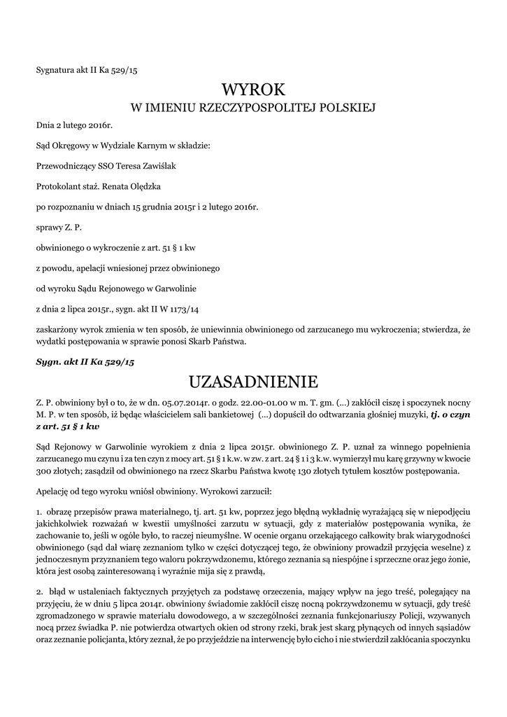 Sygnatura akt II Ka 529/15 WYROK W IMIENIU RZECZYPOSPOLITEJ POLSKIEJ Dnia 2 lutego 2016r. Sąd Okręgowy w Wydziale Karnym w składzie: Przewodniczący SSO Teresa Zawiślak Protokolant staż. Renata Olędzka po rozpoznaniu w dniach 15 grudnia 2015r i 2 lutego 2016r. sprawy Z. P. obwinionego o wykroczenie z art. 51 § 1 kw z powodu, apelacji wniesionej przez obwinionego od wyroku Sądu Rejonowego w Garwolinie z dnia 2 lipca 2015r., sygn. akt II W 1173/14 zaskarżony wyrok zmienia w ten sposób, że uniewinnia obwinionego od zarzucanego mu wykroczenia; stwierdza, że wydatki postępowania w sprawie ponosi Skarb Państwa. Sygn. akt II Ka 529/15 UZASADNIENIE Z. P. obwiniony był o to, że w dn. 05.07.2014r. o godz. 22.00-01.00 w m. T. gm. (...) zakłócił ciszę i spoczynek nocny M. P. w ten sposób, iż będąc właścicielem sali bankietowej (...) dopuścił do odtwarzania głośniej muzyki, tj. o czyn z art. 51 § 1 kw Sąd Rejonowy w Garwolinie wyrokiem z dnia 2 lipca 2015r. obwinionego Z. P. uznał za winnego popełnienia zarzucanego mu czynu i za ten czyn z mocy art. 51 § 1 k.w. w zw. z art. 24 § 1 i 3 k.w. wymierzył mu karę grzywny w kwocie 300 złotych; zasądził od obwinionego na rzecz Skarbu Państwa kwotę 130 złotych tytułem kosztów postępowania. Apelację od tego wyroku wniósł obwiniony. Wyrokowi zarzucił: 1. obrazę przepisów prawa materialnego, tj. art. 51 kw, poprzez jego błędną wykładnię wyrażającą się w niepodjęciu jakichkolwiek rozważań w kwestii umyślności zarzutu w sytuacji, gdy z materiałów postępowania wynika, że zachowanie to, jeśli w ogóle było, to raczej nieumyślne. W ocenie organu orzekającego całkowity brak wiarygodności obwinionego (sąd dał wiarę zeznaniom tylko w części dotyczącej tego, że obwiniony prowadził przyjęcia weselne) z jednoczesnym przyznaniem tego waloru pokrzywdzonemu, którego zeznania są niespójne i sprzeczne oraz jego żonie, która jest osobą zainteresowaną i wyraźnie mija się z prawdą, 2. błąd w ustaleniach faktycznych przyjętych za podstawę orzeczenia, mający wpływ na jego treść, polegający na przyjęciu, że w dniu 5 lipca 2014r. obwiniony świadomie zakłócił ciszę nocną pokrzywdzonemu w sytuacji, gdy treść zgromadzonego w sprawie materiału dowodowego, a w szczególności zeznania funkcjonariuszy Policji, wzywanych nocą przez świadka P. nie potwierdza otwartych okien od strony rzeki, brak jest skarg płynących od innych sąsiadów oraz zeznanie policjanta, który zeznał, że po przyjeździe na interwencję było cicho i nie stwierdził zakłócania spoczynku nocnego. Nie było możliwości zamknięcia okien, gdyż okna od strony, gdzie mieszka świadek P. zostały pozbawione klamek rok wcześniej, 3. brak powołania w uzasadnieniu wyroku jakiekolwiek dowodu, że popełnione zostało wykroczenie, gdyż postępowanie takich dowodów nie dostarczyło. Podnosząc powyższe zarzuty skarżący wniósł o uchylenie zaskarżonego wyroku i przekazanie sprawy Sądowi I instancji do ponownego rozpoznania, ewentualnie o zmianę zaskarżonego wyroku i uniewinnienie obwinionego od popełnienia zarzuconego mu czynu. Sąd Okręgowy zważył, co następuje: Apelacji obwinionego Z. P. nie można odmówić słuszności i dlatego wniosek o zmianę wyroku i uniewinnienie obwinionego od zarzucanego mu wykroczenia należało uwzględnić. Przede wszystkim należy podkreślić, że obowiązkiem Sądu I instancji, jak wynikało z postanowienia Sądu Okręgowego z dnia 18 grudnia 2014r. o uchyleniu zaskarżonego w tej sprawie postanowienia o odmowie wszczęcia postępowania i przekazaniu sprawy do ponownego rozpoznania, było ustalenie w drodze procesowej, czy obwiniony faktycznie dopuścił się w sposób umyślny do nadmiernego rozprzestrzenienia się hałasu zakłócającego spoczynek nocny pokrzywdzonego i innych mieszkańców tej wsi i czy takie ewentualne zakłócenie porządku stanowiło wybryk w rozumieniu art. 51 kw. Sąd I instancji w toku tego postępowania przesłuchał zarówno obwinionego, jak też M. P. i H. K., a także policjantów interweniujących w tym dniu na miejscu zdarzenia oraz ujawnił na rozprawie kserokopię mapy geodezyjnej obejmującej działkę oskarżyciela posiłkowego i obwinionego, wydruk połączeń telefonicznych i wydruki dotyczące klimatyzacji oraz instalacji ogrzewania. Zdaniem Sądu Odwoławczego, Sąd Rejonowy niezbyt wnikliwie przeanalizował i ocenił powyższe dowody, a nadto nie przeprowadził wszystkich możliwych dowodów zmierzających do wyjaśnienia okoliczności przedmiotowego wykroczenia. Zważywszy, że obwiniony od początku tego postępowania stanowczo twierdził, iż dokładał wszelkich starań, by jego działalność gospodarcza w postaci prowadzenia domu weselnego nie utrudniała życia mieszkańcom wsi poprzez np. nadmierny hałas i w jego przekonaniu nie zakłócił spokoju pokrzywdzonemu i jego żonie w dniu 5 lipca 2014 r., zaś pokrzywdzony i jego żona H. K. twierdzili przeciwnie tj. że tej nocy obwiniony zakłócał ciszę nocną hałasem i nie reagował na prośby ściszenia muzyki i zamknięcia okien od strony rzeki, Sąd Rejonowy przesłuchał na tę okoliczność interweniujących wówczas policjantów tj. A. G. i M. S.. Sąd w uzasadnieniu zaskarżonego wyroku stwierdził, że świadkowie ci pouczyli Z. P., aby przyciszył muzykę i pozamykał okna. Sąd nie rozważył jednak, że A. G. zeznał, że jakkolwiek przekazał obwinionemu takie polecenia, to jednak nie sprawdzał, czy faktycznie okna w sali weselnej były otwarte. Twierdził, że słychać było muzykę przy sali weselnej, ale nie potwierdził, by ją słyszał na działce pokrzywdzonego choć w tym czasie siedział w radiowozie. Świadek M. S. zeznał natomiast, że kiedy tam dojechali, muzyki nie słyszeli, było cicho, bo były oczepiny. Obwiniony przedstawił też wydruki fotografii klimatyzacji sali oraz wydruk danych klimatyzatora i instalacji ogrzewania