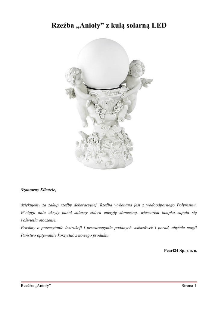 Rzeźba „Anioły” z kulą solarną LED Szanowny Kliencie, dziękujemy za zakup rzeźby dekoracyjnej. Rzeźba wykonana jest z wodoodpornego Polyresinu. W ciągu dnia ukryty panel solarny zbiera energię słoneczną, wieczorem lampka zapala się i oświetla otoczenie. Prosimy o przeczytanie instrukcji i przestrzeganie podanych wskazówek i porad, abyście mogli Państwo optymalnie korzystać z nowego produktu. Pearl24 Sp. z o. o. Rzeźba „Anioły” Strona 1 Zawartość zestawu: • Dekoracja ogrodowa • Panel solarny z baterią typu AA (1,2 V) • Instrukcja obsługi. Wymiana akumulatora Wykręć 4 śruby na dole rzeźby. Wymień baterie typu AA (600 Ah, 1,2 V). Aby uzyskać najlepszą wydajność, należy wymieniać baterie raz na rok. Zastosowanie 1. Umieść rzeźbę w miejscu, gdzie ogniwo słoneczne może otrzymać maksymalną ilość światła słonecznego. Należy unikać miejsc pod drzewami lub takich, które są zacienione w ciągu dnia. Wewnętrzna bateria może inaczej nie ładować się prawidłowo. 2. Trzymaj ogniwo słoneczne zawsze czyste, aby jego funkcja nie została ograniczona. 3. Podczas zimy i jesieni, czas świecenia może być krótszy. 4. Lampa włącza się automatycznie, gdy zintegrowany czujnik światła wykrywa, że jest ciemno. Funkcja ta może mieć negatywny wpływ na pobliskie źródła światła, takie jak latarnie uliczne. Należy zwrócić uwagę na umieszczanie światła, aby uniknąć bliskość źródła światła nocnego. 5. Naciśnij przycisk ON/OFF na dole rzeźby i ustaw na ON. Lampa automatycznie włącza się o zmroku. 6. Jeśli nie chcesz korzystać z lampy, należy przełączyć urządzenie na OFF. Rzeźba „Anioły” Strona 2 Bezpieczeństwo • Niniejsza instrukcja ma na celu zapoznanie Państwa z zasadami prawidłowego korzystania z produktu. Zaleca się przechowywanie instrukcji w łatwo dostępnym miejscu, aby w razie potrzeby mogli Państwo zweryfikować informacje. • Wszelkie modyfikacje produktu obniżają poziom jego bezpieczeństwa. UWAGA! Istnieje ryzyko obrażeń! • Nie należy rozkładać (oprócz wymiany baterii) ani naprawiać urządzenia samodzielnie! • Zaleca się ostrożne obchodzenie się z produktem. Produkt może ulec uszkodzeniu w wyniku uderzenia, wstrząsów lub upadku nawet z niewielkiej wysokości. • Produkt należy trzymać z dala od wysokiej temperatury. • Nie należy zanurzać urządzenia w wodzie oraz innych płynach. • Nie należy umieszczać lampy w zagłębieniach lub na miękkim podłożu, gdzie może zatonąć w deszczu. • Dioda LED nie może być wymieniana. • Wszelkie prawa do wprowadzania zmian technicznych oraz eliminacji błędów są zastrzeżone. Ważne wskazówki dotyczące utylizacji Urządzenia elektrycznego nie zalicza się do odpadów gospodarstwa domowego. W celu właściwej utylizacji urządzenia należy skontaktować się z organizacją odpowiedzialną za zbiórkę elektroodpadów w wybranej miejscowości. Rzeźba „Anioły” Strona 3 Ważne wskazówki dotyczące baterii i ich utylizacji Baterii nie zalicza się do odpadów gospodarstwa domowego. Jako konsumenci są Państwo zobowiązani do właściwej utylizacji zużytych baterii. Zużyte baterie należy wyrzucić do przeznaczonego do tego celu pojemnika lub zwrócić do sklepu, w którym baterie są sprzedawane. • Akumulatory mają niższe napięcie wyjściowe niż baterie. Powoduje to, że niektóre urządzenia do działania potrzebują baterii, a nie akumulatora. • Nie należy dawać baterii dzieciom. • Baterie, z których wylewa się ciesz są niebezpieczne. Należy ich dotykać tylko w odpowiednich rękawiczkach. • Nie wolno otwierać baterii i wrzucać ich do ognia. • Zaleca się wyjmowanie baterii z urządzenia, jeśli pozostaje nieużywane przez dłuższy czas. • Zwykłe baterie nie mogą być ładowane. UWAGA! Istnieje ryzyko wybuchu! • Należy używać zawsze razem baterii tego samego typu i wymieniać wszystkie baterie w urządzeniu w tym samym czasie! Deklaracja zgodności PEARL.GmbH oświadcza, że produkt NC-6872 jest zgodny z dyrektywą EMV 2004/108/EG i dyrektywą RoHS 2011/65/UE. Rzeźba „Anioły” Strona 4