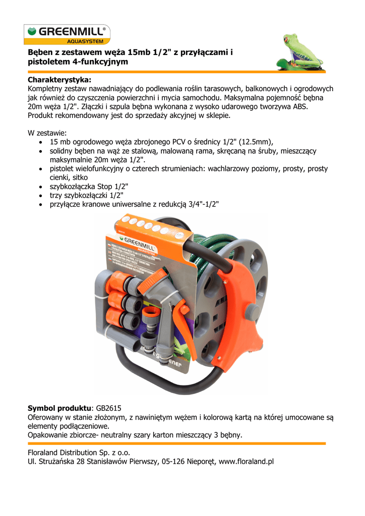 Bęben z zestawem węża 15mb 1/2" z przyłączami i pistoletem 4-funkcyjnym Charakterystyka: Kompletny zestaw nawadniający do podlewania roślin tarasowych, balkonowych i ogrodowych jak również do czyszczenia powierzchni i mycia samochodu. Maksymalna pojemność bębna 20m węża 1/2". Złączki i szpula bębna wykonana z wysoko udarowego tworzywa ABS. Produkt rekomendowany jest do sprzedaży akcyjnej w sklepie. W zestawie: 15 mb ogrodowego węża zbrojonego PCV o średnicy 1/2" (12.5mm), solidny bęben na wąż ze stalową, malowaną rama, skręcaną na śruby, mieszczący maksymalnie 20m węża 1/2". pistolet wielofunkcyjny o czterech strumieniach: wachlarzowy poziomy, prosty, prosty cienki, sitko szybkozłączka Stop 1/2" trzy szybkozłączki 1/2" przyłącze kranowe uniwersalne z redukcją 3/4"-1/2" Symbol produktu: GB2615 Oferowany w stanie złożonym, z nawiniętym wężem i kolorową kartą na której umocowane są elementy podłączeniowe. Opakowanie zbiorcze- neutralny szary karton mieszczący 3 bębny. Floraland Distribution Sp. z o.o. Ul. Strużańska 28 Stanisławów Pierwszy, 05-126 Nieporęt, www.floraland.pl