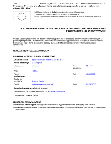1/ 14 ENOTICES_zim1222 17/06/2010- ID:2010-077372 Formularz standardowy 14 — PL Promocja Projektu pn. ,,Zapewnienie prawidłowej gospodarki wodno – ściekowej miasta Mikołów” Publikacja Suplementu do Dziennika Urzędowego Unii Europejskiej 2, rue Mercier, L-2985 Luksemburg Faks (352) 29 29-42670 E-mail: [email protected] Informacje i formularze on-line: http://simap.europa.eu OGŁOSZENIE DODATKOWYCH INFORMACJI, INFORMACJE O NIEKOMPLETNEJ PROCEDURZE LUB SPROSTOWANIE Uwaga: Jeżeli sprostowanie lub dodanie informacji prowadzi do znaczącej zmiany warunków określonych w pierwotnym ogłoszeniu o zamówieniu, konieczne może okazać się przedłużenie początkowo przewidzianych terminów ze względu na zachowanie zasady równego traktowania oraz warunków konkurencyjności zamówienia. SEKCJA I: INSTYTUCJA ZAMAWIAJĄCA I.1) NAZWA, ADRESY I PUNKTY KONTAKTOWE Oficjalna nazwa: Zakład Inżynierii Miejskiej Sp. z o.o. Adres pocztowy: ul. Kolejowa 4 Miejscowość: Mikołów Kraj: Polska Punkt kontaktowy: Osoba do kontaktów: Joanna Franiel E-mail: [email protected] Kod pocztowy: 43 - 190 Tel.: 0322180551 Faks: 0322180553 Adres(y) internetowy(e) (jeżeli dotyczy) Ogólny adres instytucji zamawiającej (URL): www.zim.com.pl Adres profilu nabywcy (URL): I.2) RODZAJ ZAMAWIAJĄCEGO Instytucja zamawiająca (w przypadku zamówienia objętego przepisami dyrektywy 2004/18/WE) Podmiot zamawiający (w przypadku zamówienia objętego przepisami dyrektywy 2004/17/WE – Zamówienia sektorowe) 2/ 14 ENOTICES_zim1222 17/06/2010- ID:2010-077372 Formularz standardowy 14 — PL Promocja Projektu pn. ,,Zapewnienie prawidłowej gospodarki wodno – ściekowej miasta Mikołów” SEKCJA II: PRZEDMIOT ZAMÓWIENIA II.1) OPIS II.1.1) Nazwa nadana zamówieniu przez instytucję zamawiającą (podano w pierwotnym ogłoszeniu) Promocja Projektu pn. ,,Zapewnienie prawidłowej gospodarki wodno – ściekowej miasta Mikołów” II.1.2) Krôtki opis (podano w pierwotnym ogłoszeniu) Przedmiotem zamówienia są dostawy i usługi w ramach promocji Projektu pn. ,,Zapewnienie prawidłowej gospodarki wodno – ściekowej miasta Mikołów” na lata 2010 – 2013. Wszystkie działania promocyjne muszą być zgodne z zasadami promocji Programu Infrastruktura i Środowisko przedstawionym na stronie internetowej www.pois.gov.pl, a w szczególności z zasadami Księga Identyfikacji Wizualnej, zamieszczonej w zakładce ,,dokumenty”, plik „Strategia komunikacji Funduszy Europejskich na lata 2007-2013 (dokument zaakceptowany przez Komisję Europejską 15 października 2008 r.) zał nr 1 „Narodowa Strategia Spójności Księga Identyfikacji Wizualnej 2007/2008”. Część I – dostawa gadżetów reklamowych z logo UE wraz z odwołaniem słownym do UE, odwołanie słowne do Funduszu Spójności, logo ZIM Sp. z o.o. i POIiŚ a) Długopisy – wymiary: min 12cm max 16cm, wykończenie: długopis automatyczny, korpus metalowy, końcówka dolna metalowa przykręcana, uchwyt mocujący metalowy, mechanizm przyciskany, gumka pod palce, wkład cienko piszący w kolorze niebieskim długość linii min. 1km, końcówka wkładu z kulką irydową zabezpieczającą przed wylaniem, o grubości 0,3 – max. 0,4mm, kolor: srebrny korpus, srebrny przycisk i klip, nadruk: grawer laserowy: po lewej - 500szt na rok b) Pendrive – min. 2GB, w obrotowej obudowie bez zatyczki, w pudełku tekturowym z logo, ze smyczą w tym grawer dwustronny – 500szt na rok c) Kubki ceramiczne białe z uchem (kształt wg wzoru nr 1) w pudełeczku ozdobnym - pojemność 250ml – 100szt na rok d) Kalendarz trójdzielny, ścienny, z numerem Projektu, dwa rodzaje wydań na rok 2011, 2012 i 2013 w ilości po 200szt ( 100szt jeden rodzaj kalendarzy + 100szt drugi rodzaj kalendarzy) na rok. e) Kalendarz biurowy - format kalendarza – 29 x 13 cm (+/- 1 cm), stojący poziomo z odwracanymi kartami, kalendarium w jęz. polskim - 1 tydzień na stronie, papier: środek – offset min. 80 g/m2, okładka - jednostronna kreda bielona błysk 150 g/m2, stojak (podstawka) o profilu trójkątnym - karton jednostronnie bielony 325 g/m2 (Pankabrite); introligatorka: biała oprawa spiralowa grzbietu (umożliwiająca swobodny obrót kartek); druk: środek - dwustronny, dwukolorowy; okładka - jednostronny, barwny + lakier offsetowy, promujący Projekt, dwa rodzaje wydań na rok 2011, 2012 i 2013 w ilości po 200szt, ( 100szt jeden rodzaj kalendarzy + 100szt drugi rodzaj kalendarzy) na rok f) Parasol – wykończony drewnianą rączką zagiętą, metalowe druty wzmocnione, gruby metalowy czubek, średnica otwarcia parasola min.115cm, długość parasola po złożeniu min.89cm, czasza parasola rozkładana automatycznie, zapięcie na rzep, pokrycie poliester 100%, Metalowy Kij - 200szt na rok (wg wzoru nr 2) g) Karty do gry – talia, prostokątne karty o wymiarach ok. 63 x 89 mm, laminowane dwustronnie, zaokrąglone narożniki z jednej strony loga i nazwa Projektu, 50 talii na rok h) Torby na materiały – rozmiar: ok.25cm x 15cm x 30 cm i mniejsze ok. 16 cm x 16 cm x 6cm, tworzywo: 100% papier, kolor beżowy, papierowe skręcane uchwyty nadruk jednostronnie – sitodruk – 200szt,( 100szt mniejszych i 100szt większych) na rok i ) Torba ekologiczna – wykonana z 100% bawełny do wielorazowego użytku, , uszy wszyte długość ucha ok. 20cm, rozmiar torby ok. 41cm x 38 cm nadruk na jednej stronie – 200szt na rok j) Notes - kołonotatnik z metalową podwójną spiralą liniatura: kratka; strony z marginesem z twardą oprawą, strony perforowane, dziurkowane ( możliwość wpięcia do segregatora) A4 100kartkowy – 200szt i B5 100 kartkowy – 100szt na rok k) Roll up – 3 szt – (2szt ok. 90x200cm a 1 szt ok.344 x 244) mechanizm w aluminiowej z klipem kasecie podstawa bez elementów ruchomych, zadruk – laminowany, jednostronny, możliwość wymiany pola zadrukowanego na nowe, torba na potrzeby przechowywania i transportu (wg wzoru nr 3) Część II Zaprojektowanie, wykonanie, 
