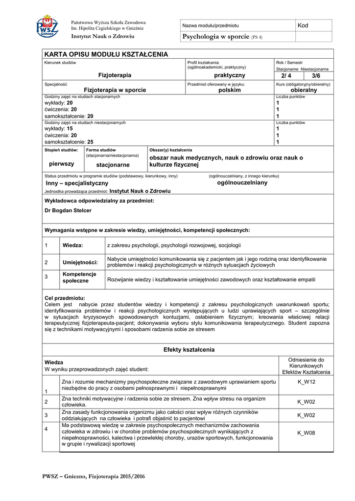 PWSZ – Gniezno, Fizjoterapia 2015/2016