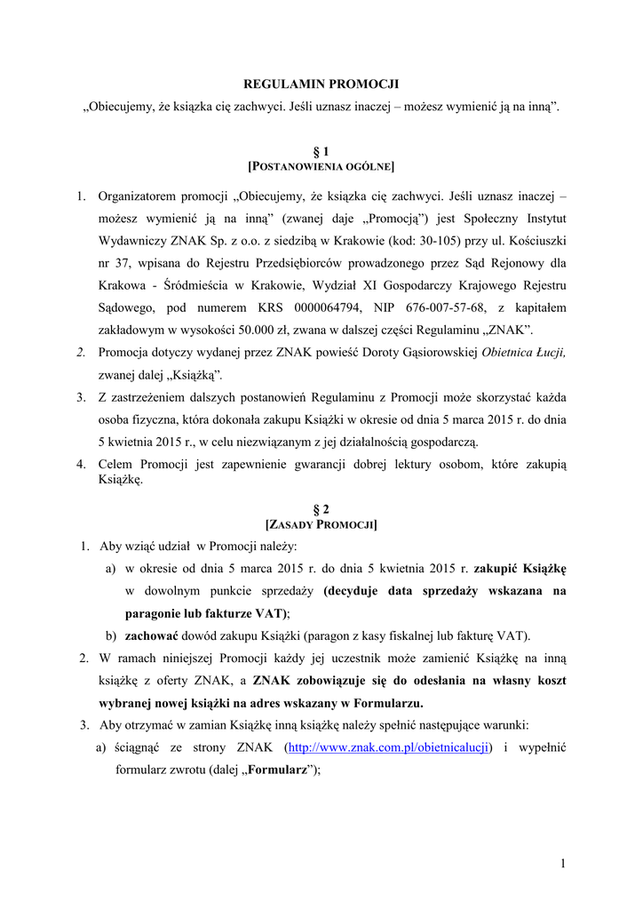 REGULAMIN PROMOCJI „Obiecujemy, Ŝe ksiązka cię zachwyci. Jeśli uznasz inaczej – moŜesz wymienić ją na inną”. §1 [POSTANOWIENIA OGÓLNE] 1. Organizatorem promocji „Obiecujemy, Ŝe ksiązka cię zachwyci. Jeśli uznasz inaczej – moŜesz wymienić ją na inną” (zwanej daje „Promocją”) jest Społeczny Instytut Wydawniczy ZNAK Sp. z o.o. z siedzibą w Krakowie (kod: 30-105) przy ul. Kościuszki nr 37, wpisana do Rejestru Przedsiębiorców prowadzonego przez Sąd Rejonowy dla Krakowa - Śródmieścia w Krakowie, Wydział XI Gospodarczy Krajowego Rejestru Sądowego, pod numerem KRS 0000064794, NIP 676-007-57-68, z kapitałem zakładowym w wysokości 50.000 zł, zwana w dalszej części Regulaminu „ZNAK”. 2. Promocja dotyczy wydanej przez ZNAK powieść Doroty Gąsiorowskiej Obietnica Łucji, zwanej dalej „KsiąŜką”. 3. Z zastrzeŜeniem dalszych postanowień Regulaminu z Promocji moŜe skorzystać kaŜda osoba fizyczna, która dokonała zakupu KsiąŜki w okresie od dnia 5 marca 2015 r. do dnia 5 kwietnia 2015 r., w celu niezwiązanym z jej działalnością gospodarczą. 4. Celem Promocji jest zapewnienie gwarancji dobrej lektury osobom, które zakupią KsiąŜkę. §2 [ZASADY PROMOCJI] 1. Aby wziąć udział w Promocji naleŜy: a) w okresie od dnia 5 marca 2015 r. do dnia 5 kwietnia 2015 r. zakupić KsiąŜkę w dowolnym punkcie sprzedaŜy (decyduje data sprzedaŜy wskazana na paragonie lub fakturze VAT); b) zachować dowód zakupu KsiąŜki (paragon z kasy fiskalnej lub fakturę VAT). 2. W ramach niniejszej Promocji kaŜdy jej uczestnik moŜe zamienić KsiąŜkę na inną ksiąŜkę z oferty ZNAK, a ZNAK zobowiązuje się do odesłania na własny koszt wybranej nowej ksiąŜki na adres wskazany w Formularzu. 3. Aby otrzymać w zamian KsiąŜkę inną ksiąŜkę naleŜy spełnić następujące warunki: a) ściągnąć ze strony ZNAK (http://www.znak.com.pl/obietnicalucji) i wypełnić formularz zwrotu (dalej „Formularz”); 1 b) wysłać, w terminie 30 dni od dnia dokonania zakupu (decyduje data stempla pocztowego) na adres: Społeczny Instytut Wydawniczy ZNAK Sp. z o.o., ul. Kościuszki 37, 30-105 Kraków, z dopiskiem OBIETNICA ŁUCJI): I. II. III. ksiąŜkę, dowód zakupu KsiąŜki (lub wyraźną kopię tego dowodu), uzupełniony Formularz; c) nowa ksiąŜka wybrana przez uczestnika Promocji musi znajdować się w aktualnej ofercie księgarni internetowej ZNAK (http://www.znak.com.pl) a jej cena nie moŜe przekraczać kwoty 34,90 zł. d) dana osoba moŜe skorzystać z Promocji tylko raz. §3 [DODATKOWE POSTANOWIENIA] 1. Koszty odesłania KsiąŜki do ZNAK pokrywa wysyłający. 2. Koszty wysyłki nowej (wymienionej) ksiąŜki pokrywa ZNAK. 3. W ramach Promocji nie ma moŜliwości wymiany KsiąŜki na droŜszą (nawet z dopłatą). 4. Skorzystanie z uprawnień wynikających z Promocji moŜliwe jest wyłącznie w sposób opisany w niniejszym Regulaminie tj. jedynie u Organizatora na warunkach opisanych w § 2 Regulaminu. Nie ma moŜliwości wymiany KsiąŜki na zasadach określonych w Regulaminie w księgarni lub innym miejscu, w którym dokonano zakupu KsiąŜki. 5. W celu wykonania Promocji strony zawierają umowę zamiany ksiąŜek o tej samej wartości rynkowej. 6. Organizator Promocji zastrzega, Ŝe nie będzie wysyłał nowych ksiąŜek, ani odsyłał nadesłanych do siebie KsiąŜek w przypadku, gdy: (i) do przesłanych KsiąŜek nie dołączono dowodu zakupu (jego czytelnej kserokopii) lub Formularza, względnie (ii) przesłany z KsiąŜką Formularz został wypełniony w sposób uniemoŜliwiając wykonanie przez ZNAK zobowiązania wynikającego z Promocji (w szczególności nieczytelny), jak równieŜ (iii) w przypadku wybrania nowej ksiąŜki, która nie odpowiada wymaganiom określonym w § 2 ust. 3 lit c Regulaminu oraz w przypadku (iv) gdy nastąpi zwrot przesyłki zawierającej nową ksiąŜkę. 2
