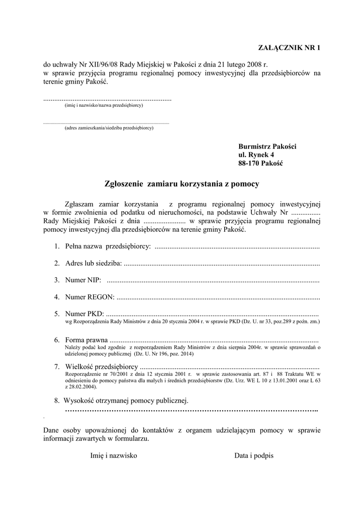 ZAŁĄCZNIK NR 1 do uchwały Nr XII/96/08 Rady Miejskiej w Pakości z dnia 21 lutego 2008 r. w sprawie przyjęcia programu regionalnej pomocy inwestycyjnej dla przedsiębiorców na terenie gminy Pakość. ...................................................................... (imię i nazwisko/nazwa przedsiębiorcy) ....................................................................................................... (adres zamieszkania/siedziba przedsiębiorcy) Burmistrz Pakości ul. Rynek 4 88-170 Pakość Zgłoszenie zamiaru korzystania z pomocy Zgłaszam zamiar korzystania z programu regionalnej pomocy inwestycyjnej w formie zwolnienia od podatku od nieruchomości, na podstawie Uchwały Nr ................ Rady Miejskiej Pakości z dnia ....................... w sprawie przyjęcia programu regionalnej pomocy inwestycyjnej dla przedsiębiorców na terenie gminy Pakość. 1. Pełna nazwa przedsiębiorcy: .......................................................................................... 2. Adres lub siedziba: ........................................................................................................... 3. Numer NIP: .................................................................................................................... 4. Numer REGON: ............................................................................................................... 5. Numer PKD: .................................................................................................................... wg Rozporządzenia Rady Ministrów z dnia 20 stycznia 2004 r. w sprawie PKD (Dz. U. nr 33, poz.289 z poźn. zm.) 6. Forma prawna .................................................................................................................. Należy podać kod zgodnie z rozporządzeniem Rady Ministrów z dnia sierpnia 2004r. w sprawie sprawozdań o udzielonej pomocy publicznej (Dz. U. Nr 196, poz. 2014) 7. Wielkość przedsiębiorcy .................................................................................................. Rozporządzenie nr 70/2001 z dnia 12 stycznia 2001 r. w sprawie zastosowania art. 87 i 88 Traktatu WE w odniesieniu do pomocy państwa dla małych i średnich przedsiębiorstw (Dz. Urz. WE L 10 z 13.01.2001 oraz L 63 z 28.02.2004). 8. Wysokość otrzymanej pomocy publicznej. ………………………………………………………………………………………….. . Dane osoby upoważnionej do kontaktów z organem udzielającym pomocy w sprawie informacji zawartych w formularzu. Imię i nazwisko Data i podpis ZAŁĄCZNIK NR 2 do uchwały Nr XII/96/08 Rady Miejskiej w Pakości z dnia21 lutego 2008 r. w sprawie przyjęcia programu regionalnej pomocy inwestycyjnej dla przedsiębiorców na terenie gminy Pakość. ...................................................................... (imię i nazwisko/nazwa przedsiębiorcy) ....................................................................................................... (adres zamieszkania/siedziba przedsiębiorcy) Burmistrz Pakości ul. Rynek 4 88-170 Pakość Deklaracja W wykonaniu obowiązku wynikającego z § 22 pkt 7 uchwały w sprawie programu regionalnej pomocy dla przedsiębiorców na terenie miasta i gminy Pakość Zobowiązuję się do utrzymania nowej inwestycji przez okres co najmniej 5 lat, a w ∗ przypadku MŚP co najmniej 3 lat, od dnia zakończenia jej realizacji.∗ (∗ zaznacz lata utrzymania inwestycji zgodnie z wielkością przedsiębiorcy) ……………………………….. data …………………………………………… podpis przedsiębiorcy lub osoby upoważnionej ZAŁĄCZNIK NR 3 do uchwały Nr XII/96/08 Rady Miejskiej w Pakości z dnia 21 lutego 2008 r. w sprawie przyjęcia programu regionalnej pomocy inwestycyjnej dla przedsiębiorców na terenie gminy Pakość. ...................................................................... (imię i nazwisko/nazwa przedsiębiorcy) ....................................................................................................... (adres zamieszkania/siedziba przedsiębiorcy) Burmistrz Pakości ul. Rynek 4 88-170 Pakość Oświadczenie W wykonywaniu obowiązku wynikającego z § 23 pkt 2 uchwały w sprawie programu regionalnej pomocy dla przedsiębiorców na terenie miasta i gminy Pakość Oświadczam, że wartość nowej inwestycji, o której mowa w § 10 uchwały wynosi łącznie ………………….zł. Koszty kwalifikujące się do objęcia pomocą publiczną wynoszą łącznie ……………..zł, (w załączeniu wyszczególnienie poszczególnych grup kosztów, o których mowa w § 14 uchwały). Udział własny wynosi …………………….. zł, co stanowi ………………….. % wartości inwestycji. Kwota wskazana w oświadczeniu dotyczy kosztów inwestycyjnych poniesionych po dniu złożenia wniosku o pomoc publiczną. Oświadczam, że jest mi znana treść art. 233 ustawy z dnia 6 czerwca 1997 roku - Kodeks karny (Dz. U. Nr 88, poz. 533 z późn. zm.) o odpowiedzialności karnej za składanie fałszywych oświadczeń. …………………………….. data ………………………………………….. podpis przedsiębiorcy lub osoby upoważnionej ZAŁĄCZNIK NR 4 do uchwały Nr XII/96/08 Rady Miejskiej w Pakości z dnia 21 lutego 2008 r. w sprawie przyjęcia programu regionalnej pomocy inwestycyjnej dla przedsiębiorców na terenie gminy Pakość. ...................................................................... (imię i nazwisko/nazwa przedsiębiorcy) ....................................................................................................... (adres zamieszkania/siedziba przedsiębiorcy) Burmistrz Pakości ul. Rynek 4 88-170 Pakość Oświadczenie W wykonywaniu obowiązku wynikającego z § 24 uchwały w sprawie przyjęcia programu regionalnej pomocy inwestycyjnej dla przedsiębiorców na terenie miasta i gminy Pakość Oświadczam, że wysokość nakładów inwestyc