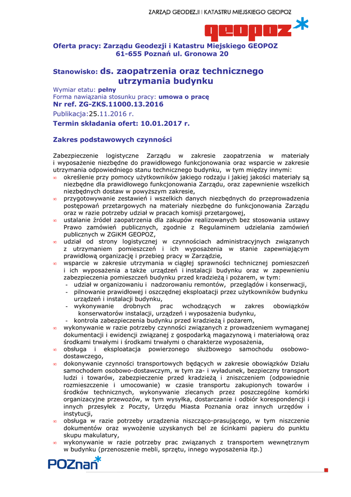 Oferta pracy: Zarządu Geodezji i Katastru Miejskiego GEOPOZ 61-655 Poznań ul. Gronowa 20 Stanowisko: ds. zaopatrzenia oraz technicznego utrzymania budynku Wymiar etatu: pełny Forma nawiązania stosunku pracy: umowa o pracę Nr ref. ZG-ZKS.11000.13.2016 Publikacja:25.11.2016 r. Termin składania ofert: 10.01.2017 r. Zakres podstawowych czynności Zabezpieczenie logistyczne Zarządu w zakresie zaopatrzenia w materiały i wyposaŜenie niezbędne do prawidłowego funkcjonowania oraz wsparcie w zakresie utrzymania odpowiedniego stanu technicznego budynku, w tym między innymi: • określenie przy pomocy uŜytkowników jakiego rodzaju i jakiej jakości materiały są niezbędne dla prawidłowego funkcjonowania Zarządu, oraz zapewnienie wszelkich niezbędnych dostaw w powyŜszym zakresie, • przygotowywanie zestawień i wszelkich danych niezbędnych do przeprowadzenia postępowań przetargowych na materiały niezbędne do funkcjonowania Zarządu oraz w razie potrzeby udział w pracach komisji przetargowej, • ustalanie źródeł zaopatrzenia dla zakupów realizowanych bez stosowania ustawy Prawo zamówień publicznych, zgodnie z Regulaminem udzielania zamówień publicznych w ZGiKM GEOPOZ, • udział od strony logistycznej w czynnościach administracyjnych związanych z utrzymaniem pomieszczeń i ich wyposaŜenia w stanie zapewniającym prawidłową organizację i przebieg pracy w Zarządzie, • wsparcie w zakresie utrzymania w ciągłej sprawności technicznej pomieszczeń i ich wyposaŜenia a takŜe urządzeń i instalacji budynku oraz w zapewnieniu zabezpieczenia pomieszczeń budynku przed kradzieŜą i poŜarem, w tym: - udział w organizowaniu i nadzorowaniu remontów, przeglądów i konserwacji, - pilnowanie prawidłowej i oszczędnej eksploatacji przez uŜytkowników budynku urządzeń i instalacji budynku, - wykonywanie drobnych prac wchodzących w zakres obowiązków konserwatorów instalacji, urządzeń i wyposaŜenia budynku, - kontrola zabezpieczenia budynku przed kradzieŜą i poŜarem, • wykonywanie w razie potrzeby czynności związanych z prowadzeniem wymaganej dokumentacji i ewidencji związanej z gospodarką magazynową i materiałową oraz środkami trwałymi i środkami trwałymi o charakterze wyposaŜenia, • obsługa i eksploatacja powierzonego słuŜbowego samochodu osobowodostawczego, • dokonywanie czynności transportowych będących w zakresie obowiązków Działu samochodem osobowo-dostawczym, w tym za- i wyładunek, bezpieczny transport ludzi i towarów, zabezpieczenie przed kradzieŜą i zniszczeniem (odpowiednie rozmieszczenie i umocowanie) w czasie transportu zakupionych towarów i środków technicznych, wykonywanie zlecanych przez poszczególne komórki organizacyjne przewozów, w tym wysyłka, dostarczanie i odbiór korespondencji i innych przesyłek z Poczty, Urzędu Miasta Poznania oraz innych urzędów i instytucji, • obsługa w razie potrzeby urządzenia niszcząco-prasującego, w tym niszczenie dokumentów oraz wywoŜenie uzyskanych bel ze ścinkami papieru do punktu skupu makulatury, • wykonywanie w razie potrzeby prac związanych z transportem wewnętrznym w budynku (przenoszenie mebli, sprzętu, innego wyposaŜenia itp.) Wymagania niezbędne • • pełna zdolność do czynności prawnych i korzystanie z pełni praw publicznych brak skazania prawomocnym wyrokiem sądu za umyślne przestępstwo ścigane z oskarŜenia publicznego lub umyślne przestępstwo skarbowe nieposzlakowana opinia wykształcenie: wyŜsze z co najmniej 2-letniem doświadczenie zawodowym, w tym co najmniej rocznym związanym z logistyką lub technicznym utrzymaniem budynku lub wykształcenie średnie z co najmniej 4 letnim doświadczeniem zawodowym, w tym co najmniej rocznym związanym z logistyką lub technicznym utrzymaniem budynku • • • • • wiedza w zakresie potrzeb zakupowych i prac utrzymaniowych związanych z obsługą techniczną budynku oraz funkcjonowaniem urządzeń biurowych, prawo jazdy kat B znajomość obsługi komputera (Pakiet Office, poczta elektroniczna, Internet Wymagania dodatkowe • wykształcenie wyŜsze kierunek/specjalność budownictwo • ukończone technikum budowlane lub specjalistyczne kursy i szkolenia z zakresu realizowanych zadań (eksploatacja i utrzymanie obiektów budowlanych, logistyka itp.) co najmniej roczne doświadczenie zawodowe związane z logistyką lub technicznym utrzymaniem budynku w jednostkach administracji publicznej, • • znajomość hurtowej i detalicznej sieci handlowej Poznania i okolic w zakresie realizacji zakupów związanych z obsługą techniczną budynku oraz materiałów i urządzeń biurowych, • podstawowa znajomość Prawa zamówień publicznych • podstawowa znajomość zagadnień gospodarki magazynowej i materiałowej • umiejętność obsługi komputera w zakresie programów do obsługi gospodarki magazynowej i materiałowej, • dobra znajomość i umiejętność stosowania przepisów prawa o ruchu drogowym oraz podstawowa znajomość budowy i oceny stanu technicznego pojazdu, • komunikatywność, takt i kultura osobista • asertywność. Warunki pracy • Stanowisko pracy mieści się w wielokondygnacyjnym budynku wyposaŜonym w windy (windy przystosowane dla osób niepełnosprawnych). • Oświetlenie stanowiska pracy naturalne i sztuczne • Praca z przewagą wysiłku umysłowego • Charakter wykonywanych czynności wymaga: - sprawności ruchowej pozwalającej na realizację prac magazynowych i transportowych, − przemieszczania się wewnątrz wielokondygnacyjnego budynku, − wysiłku fizycznego (przenoszenie materiałów, załadunek i wyładunek towarów-zgodnie z obowiązującymi normami) − korzystania z samochodu słuŜbowego (do 3,5 tony) - praca na wysokości do 3 m. • Podczas pracy wykorzystuje się komputer LCD, obsługuje drukarkę, telefon, urządzenia wielofunkcyjne, korzysta z materiałów biurowych, prowadzi samochód słuŜbowy Informacje dodatkowe Wskaźni