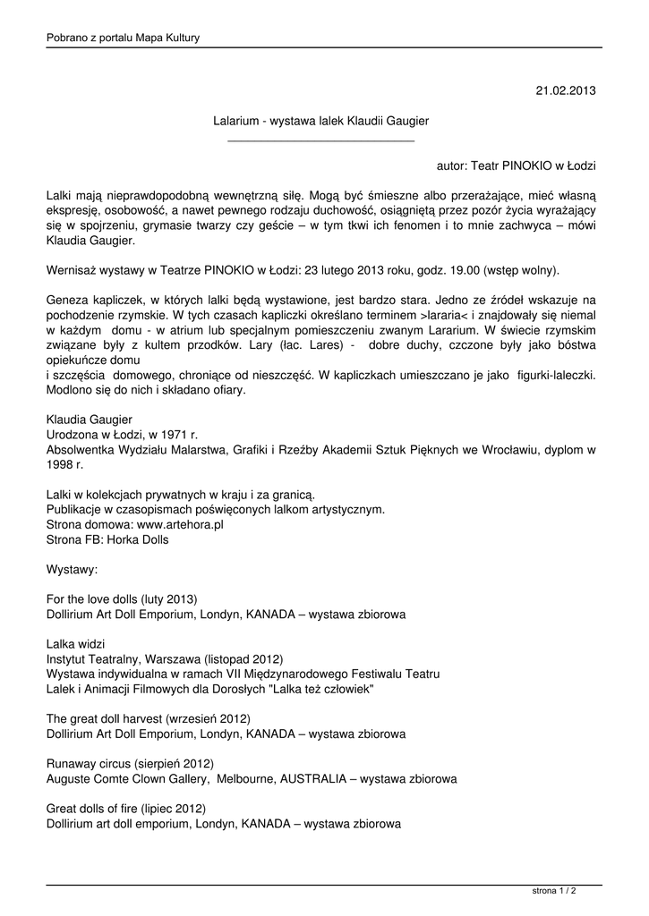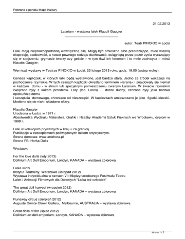 Pobrano z portalu Mapa Kultury 21.02.2013 Lalarium - wystawa lalek Klaudii Gaugier ____________________________ autor: Teatr PINOKIO w Łodzi Lalki mają nieprawdopodobną wewnętrzną siłę. Mogą być śmieszne albo przerażające, mieć własną ekspresję, osobowość, a nawet pewnego rodzaju duchowość, osiągniętą przez pozór życia wyrażający się w spojrzeniu, grymasie twarzy czy geście – w tym tkwi ich fenomen i to mnie zachwyca – mówi Klaudia Gaugier. Wernisaż wystawy w Teatrze PINOKIO w Łodzi: 23 lutego 2013 roku, godz. 19.00 (wstęp wolny). Geneza kapliczek, w których lalki będą wystawione, jest bardzo stara. Jedno ze źródeł wskazuje na pochodzenie rzymskie. W tych czasach kapliczki określano terminem >lararia< i znajdowały się niemal w każdym domu - w atrium lub specjalnym pomieszczeniu zwanym Lararium. W świecie rzymskim związane były z kultem przodków. Lary (łac. Lares) - dobre duchy, czczone były jako bóstwa opiekuńcze domu i szczęścia domowego, chroniące od nieszczęść. W kapliczkach umieszczano je jako figurki-laleczki. Modlono się do nich i składano ofiary. Klaudia Gaugier Urodzona w Łodzi, w 1971 r. Absolwentka Wydziału Malarstwa, Grafiki i Rzeźby Akademii Sztuk Pięknych we Wrocławiu, dyplom w 1998 r. Lalki w kolekcjach prywatnych w kraju i za granicą. Publikacje w czasopismach poświęconych lalkom artystycznym. Strona domowa: www.artehora.pl Strona FB: Horka Dolls Wystawy: For the love dolls (luty 2013) Dollirium Art Doll Emporium, Londyn, KANADA – wystawa zbiorowa Lalka widzi Instytut Teatralny, Warszawa (listopad 2012) Wystawa indywidualna w ramach VII Międzynarodowego Festiwalu Teatru Lalek i Animacji Filmowych dla Dorosłych "Lalka też człowiek" The great doll harvest (wrzesień 2012) Dollirium Art Doll Emporium, Londyn, KANADA – wystawa zbiorowa Runaway circus (sierpień 2012) Auguste Comte Clown Gallery, Melbourne, AUSTRALIA – wystawa zbiorowa Great dolls of fire (lipiec 2012) Dollirium art doll emporium, Londyn, KANADA – wystawa zbiorowa strona 1 / 2 Pobrano z portalu Mapa Kultury Horskie toy story (luty 2012) Muzeum Ślężańskie, Sobótka – wystawa indywidualna Wystawa czynna w dniach: 24.02 w godz. 10.00-13.00 25-26.02 w godz. 8.00-13.45 27.02-03.03 w godz. 8.00-13.45 oraz 17.00-19.00 28.02-01.03 w godz. 8.00-13.45 oraz 18.00-20.00 02.03 w godz. 17.00-19.00 03.03 w godz. 10.00-13.00 oraz 17.00-19.00 04.03-08.03 w godz. 8.00-13.45 10.03 w godz. 10.00-13.00 oraz 17.00-19.00 11-15.03 w godz. 8.00-13.45 17.03 w godz. 10.00-13.00 18-22.03 w godz. 8.00-13.45 24.03 w godz. 10.00-16.00 (finisaż wystawy) Bilety dla widzów indywidualnych 5 zł. Istnieje możliwość zwiedzania grupowego (od 10 osób) po wcześniejszym ustaleniu z Biurem Promocji i Upowszechniania Teatru, tel. 42 636 66 90, e-mail: [email protected] strona 2 / 2