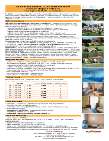 Boże Narodzenie 2016 nad morzem wczasy dojazd własny Poddąbie O.R.W. Słowiniec Poddąbie - sympatyczna, niewielka nadmorska miejscowość z dobrym mikroklimatem, zagubiona pośród wyjątkowych na polskim wybrzeżu, pięknych, obfitujących w grzyby i jagody lasów liściastoiglastych, pomiędzy Ustką a Rowami. Do Słupska jest 14 km, do Rowów 8 km. Do stacji PKP w Słupsku - 24 km. Zakwaterowanie Ośrodek Rehabilitacyjno-Wczasowy Słowiniec - położony jest w odległości około 250m od morza. Na parterze budynku głównego (z windą), mieści się baza zabiegowa posiadająca podjazd dla osób na wózkach: niewielki basen kryty (3,5 x 6 m) do ćwiczeń indywidualnych i grupowych gabinet fizykoterapii (diadynamic, pulsatronic, magnetronic, aparat do krioterapii) gabinet inhalacji (stanowiska wyposażone w inhalatory) gabinet masażu (łóżko do masażu klasycznego), lampa solux, bioptron, laser gabinet hydroterapii - kąpiele perełkowe sala kinezy terapii (gimnastyka, ćwiczenia siłowe) Do dyspozycji gości również: sala jadalna, świetlica, parking ogrodzony – zamykany na noc. Na terenie ośrodka znajdują się: plac zabaw dla dzieci, świetlica, biblioteka, boisko do badmintona, piłkarzyki, stoły do tenisa stołowego. Zakwaterowanie ośrodek dysponuje 267 miejscami noclegowymi: - 125 miejsc w nowym budynku Maraton z windą (pokoje 1-, 2-, 3 osobowe z łazienką i TV) - 35 miejsc na 1 piętrze budynku Słowiniec (pokoje 2-,3-,4- osobowe z łazienkami i TV) Wszystkie pokoje i domki wyposażone są w czajniki bezprzewodowe. Wyżywienie: 3 posiłki dziennie- domowe posiłki (śniadanie i kolacja w formie szwedzkiego stołu + obiad serwowany) pobyt zaczyna się kolacją a kończy śniadaniem, doba hotelowa od 17:00 do 11:00 Menu na kolację Wigilijną m. in: zupa grzybowa barszcz z uszkami karp smażony pstrąg smażony pstrąg w galarecie rolada z ryby ryba po grecku śledzie w pierzynce kapusta z grzybami kutia krokiety z grzybami i kapusta gołąbki w sosie koperkowym pierogi z kapusta i grzybami deski wędlin, serów, ryb wędzonych sałatka jarzynowa pieczywo ciasta (makowiec, sernik, jabłecznik) pieczarki faszerowane kompot z suszonych owoców itp. Program zawiera - gra terenowa na terenie ośrodka „Świąteczny czar Par” w dniu 23 grudnia 2016 - uroczystą Kolację Wigilijną - 24 grudnia 2016 godz.17.00 z oprawą muzyczna i kolędami - świąteczną choinkę i wizytę Mikołaja z symbolicznymi prezentami ( większe – dla dzieci rodzice przekazują samodzielnie) - świąteczne ucztowanie z zespołem muzycznym przy choince w dniu 25 grudnia 2016 godz. 19.30 - świąteczną grę dla dużych i małych „gdzie jesteś Święty Mikołaju” w dniu 26 grudnia 2016 godz.11:00 - program kulturalno-oświatowy z niespodziankami - pakiet zabiegów w zależności od długości pobytu Turnus i ceny First minute od VIII.2016 - dostępność miejsc i cena zawsze na potwierdzenie ! turnusy cena w PLN/os. dorosła zabiegi w cenie 24 - 26.12.2016 3 dni 340 2 23 - 26.12.2016 24 - 27.12.2016 4 dni 420 4 23 - 27.12.2016 5 dni 500 5 22 - 27.12.2016 6 dni 580 6 21 - 27.12.2016 7 dni 640 8 20 - 27.12.2016 8 dni 720 10 a Cena obejmuje - noclegi (2 - 7) w pokojach z łazienką i TV wg zakupionej opcji długości pobytu zabiegi (w zależności od długości pobytu) wyżywienie - 3 x dziennie (śniadania i kolacje w formie bufetu, obiady serwowane) udział w kolacji wigilijnej niespodziankę od Mikołaja i bardzo sympatyczną atmosferę, program wg przedstawionego grafiku korzystanie z sali gimnastycznej, basenu, siłowni itp. Cena nie obejmuje - opłata miejscowa 2 PLN/doba zniżki dla dzieci: do 2 lat - bezpłatnie; od 3-7 lat – 25 % taniej ; od 8-12 lat – 20 % taniej dopłaty opcjonalne: - dopłata do pokoju jednoosobowego - na zapytanie - opłata parkingowa - w zależności od długości pobytu - opłata za psa - za opłatą (wymagany kaganiec!) - w zależności od długości pobytu - gościom przyjeżdżającym pociągiem do Słupska Ośrodek oferuje pomoc w dotarciu do Poddąbia i odwiezienie w dniu wyjazdu za dodatkową odpłatnością w wysokości ok. 16 zł/os. (w 1 stronę). kontakt i rezerwacja: Biuro Podróży Busmarket ul. 3 Maja 36 40-097 Katowice e-mail: [email protected] tel./fax 32 253 86 34 tel. komórkowy 693 444 554 www.busmarket.turystyka.net