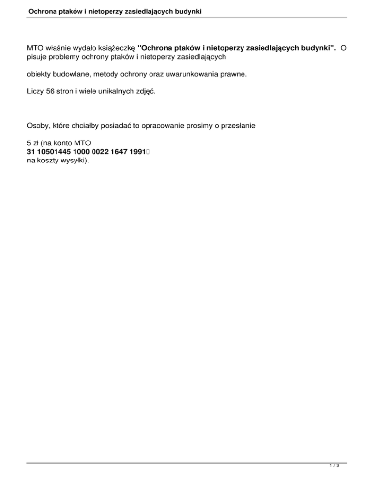 Ochrona ptaków i nietoperzy zasiedlających budynki MTO właśnie wydało książeczkę "Ochrona ptaków i nietoperzy zasiedlających budynki". O pisuje problemy ochrony ptaków i nietoperzy zasiedlających obiekty budowlane, metody ochrony oraz uwarunkowania prawne. Liczy 56 stron i wiele unikalnych zdjęć. Osoby, które chciałby posiadać to opracowanie prosimy o przesłanie 5 zł (na konto MTO 31 10501445 1000 0022 1647 1991 na koszty wysyłki). 1/3 Ochrona ptaków i nietoperzy zasiedlających budynki 2/3 Ochrona ptaków i nietoperzy zasiedlających budynki 3/3