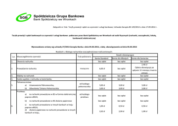 Załącznik nr 3 do Taryfy prowizji i opłat za czynności i usługi bankowe, Uchwała Zarządu BS 129/2012 z dnia 17.09.2012 r. Taryfa prowizji i opłat bankowych za czynności i usługi bankowe pobierane przez Bank Spółdzielczy we Wronkach od osób fizycznych (rachunki, oszczędności, lokaty, bankowość elektroniczna) Wprowadzono zmiany wg uchwały 27/2015 Zarządu Banku z dnia 04.03.2015, z datą obowiązywania od dnia 05.03.2015 Rozdział 1. Obsługa rachunków oszczędnościowo-rozliczeniowych: L.p. Wyszczególnienie czynności Tryb pobierania 1. Otwarcie rachunku Stawki obowiązujące Konto Standard Konto dla Młodych Konto dla Seniorów bez opłat bez opłat 6,00 zł bez opłat 3. Wpłaty na rachunek bez opłat bez opłat bez opłat 2,40 zł Opłata obowiązuje po upływie 12 miesięcy trwania umowy bez opłat 4. Każda wypłata z rachunku w kasie banku Pełnomocnictwa 5. a) Ustanowienie Pełnomocnika, b) Odwołanie/ Zmiana Pełnomocnika Przelewy: a) na rachunki prowadzone w BS w formie elektronicznej poprzez eBS24, bez opłat bez opłat bez opłat 3,00 zł 3,00 zł 3,00 zł 3,00 zł 3,00 zł 3,00 zł bez opłat bez opłat bez opłat bez opłat bez opłat bez opłat 1,00 zł 0,50 zł 0,50 zł 3,50 zł 2,99 zł 1,99 zł 2. Prowadzenie rachunku b) na rachunki prowadzone w BS złożone papierowo 6. c) na rachunki prowadzone w innych bankach w kraju poprzez eBS24, d) złożone papierowo na rachunki prowadzone w innych bankach w kraju, miesięcznie od każdego pełnomocnika od każdego przelewu 6. e) złożone papierowo na rachunki prowadzone w innych bankach w kraju poprzez Sorbnet f) z rachunków założonych dla PKZP, Rad Rodziców Zlecenia stałe: 7. 8. 9. 20 20,00 zł 1,50 zł 1,50 zł 1,50 zł 2,00 zł 2,00 zł 2,00 zł 1,00 zł 1,00 zł 1,00 zł 2,00 zł 2,00 zł 2,00 zł 2,00 zł 2,00 zł 2,00 zł bez opłat bez opłat bez opłat bez opłat bez opłat bez opłat 2,00 zł 2,00 zł 2,00 zł 7,00 zł 7,00 zł 7,00 zł 5,00 zł 5,00 zł 5,00 zł - klient określił datę dokonania operacji, 10,00 zł 10,00 zł 10,00 zł - klient nie określił daty operacji 20,00 zł 20,00 zł 20,00 zł realizacja zlecenia stałego w terminie wskazanym przez klienta, Polecenie zapłaty: a) dyspozycji wykonania polecenia zapłaty, b) realizacja każdej operacji polecenia zapłaty ( opłata pobierana z rachunku klienta), c) odwołanie pojedynczego niezrealizowanego polecenia zapłaty albo aktualizacja treści zgody na korzystanie z polecenia zapłaty( za złożenie jednego odwołania zgody) d) za poinformowanie klienta przez bank o odmowie wykonania polecenia zapłaty z tytułu braku środków na rachunku Klienta Sporządzenie i wysłanie wyciągu bankowego: a) sporządzenie i odbiór wyciągu bankowego w placówce prowadzącej rachunek, b) sporządzenie i wysłanie 1 wyciągu bankowego w miesiącu, c) sporządzenie i wysłanie kolejnego wyciągu bankowego w miesiącu 20,00 zł bez opłat od każdej dyspozycji od każdej dyspozycji Sporządzenie: a) miesięcznego odpisu wyciągu rachunku bankowego (bez załączników) oraz historii rachunku 10. b) odpisu każdego załącznika do wyciągu, c) sporządzenia odpisu dokumentu pozostającego w archiwum Banku , w przypadku, gdy: od każdego odpisu Karty płatnicze VISA ELECTRON, MAESTRO ,Visa Elektron 11. młodzieżowa, MasterCard Debit Pay Pass, Master Card Debit Pay Pass Opłaty zgodnie z Taryfą prowizji i opłat bankowych za czynności i usługi bankowe pobierane przez Bank Spółdzielczy we Wronkach, związanych z funkcjonowaniem kart płatniczych) Opłaty zgodnie z Taryfą prowizji i opłat bankowych za czynności i usługi bankowe pobierane przez Bank Spółdzielczy we Wronkach, związanych z funkcjonowaniem kart płatniczych) Opłaty zgodnie z Taryfą prowizji i opłat bankowych za czynności i usługi bankowe pobierane przez Bank Spółdzielczy we Wronkach, związanych z funkcjonowaniem kart płatniczych) 12. Wydanie zaświadczenia o stanie oszczędności za każde zaświadczenie 8,00 zł 8,00 zł 8,00 zł Przyjęcie od posiadacza rachunku dyspozycji (oświadczenia), zmiany 13. lub odwołania w sprawie przeznaczenia wkładu na wypadek jego śmierci każdorazowo 15,00 zł 15,00 zł 15,00 zł 14. Realizacja dyspozycji na wypadek śmierci od każdego zapisobiorcy 10,00 zł 10,00 zł 10,00 zł od każdej osoby 10,00 zł 10,00 zł 10,00 zł od każdej dyspozycji 20,00 zł 20,00 zł 20,00 zł od każdego zlecenia 15,00 zł 20,00 zł * 15,00 zł 20,00 zł * 15,00 zł 20,00 zł * 15,00 zł 20,00 zł 15,00 zł 20,00 zł 15,00 zł 20,00 zł 15. Wypłata kosztów pogrzebu 16. Za zmianę rachunku ze wspólnego na indywidualny i odwrotnie Obsługa: a) przyjęcie zgłoszenia utraty czeku b) za blokadę środków *Uwaga! Klient ponosi dodatkowe opłaty za pośrednictwo zgodnie z tabelą SGB-Bank S.A.i na rzecz SGB-Bank S.A. Za wydanie odpisu/ kopii umowy rachunku: 18. a) aktualnej umowy b) pozostającej w archiwum banku 17. od każdego odpisu/ kopii 19. Likwidacja rachunku 20. Za sporządzenie i wysłanie listem poleconym za potwierdzeniem odbioru-upomnienia, wezwania do zapłaty lub monitu 21. Uzyskanie na hasło telefonicznej informacji o stanie rachunku bez opłat bez opłat bez opłat Za każdy, wysłany jeden raz w okresie rozliczeniowym 10,00 zł 10,00 zł 10,00 zł miesięcznie 6,00 zł 6,00 zł 6,00 zł Za przygotowanie gotówki na poczet wypłaty z rachunku ( w kwocie wymagającej awizowania, zgodnie z regulaminem prowadzenia naliczana od 22. rachunku: kwoty do wypłaty a) w przypadku podjęcia gotówki b) w przypadku niepodjęcia gotówki Zmiana pakietu ( w przypadku wyboru pakietu z niższą opłatą za 23. za każdą zmianę prowadzenie rachunku) bez opłat 0,05% bez opłat 0,05% bez opłat 0,05% 50,00 zł 50,00 zł 50,00 zł Rozdział 2. Obsługa rachunku oszczędnościowego (RO): L.p. Wyszczególnienie czynności Tryb pobierania Stawki obowiązujące 1. Otwarcie rachunku bez opłat 2. Prowadzenie rachunku bez opłat 3. Wpłaty gotówkowe na rac