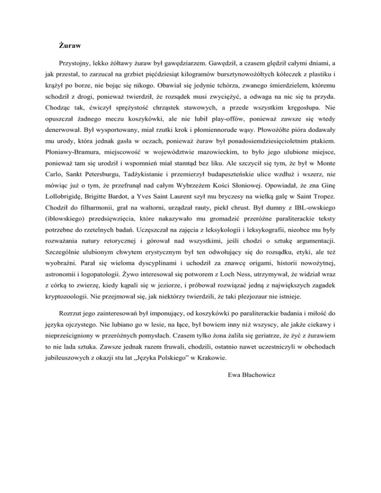 Żuraw Przystojny, lekko żółtawy żuraw był gawędziarzem. Gawędził, a czasem ględził całymi dniami, a jak przestał, to zarzucał na grzbiet pięćdziesiąt kilogramów bursztynowożółtych kółeczek z plastiku i krążył po borze, nie bojąc się nikogo. Obawiał się jedynie tchórza, zwanego śmierdzielem, któremu schodził z drogi, ponieważ twierdził, że rozsądek musi zwyciężyć, a odwaga na nic się tu przyda. Chodząc tak, ćwiczył sprężystość chrząstek stawowych, a przede wszystkim kręgosłupa. Nie opuszczał żadnego meczu koszykówki, ale nie lubił play-offów, ponieważ zawsze się wtedy denerwował. Był wysportowany, miał rzutki krok i płomiennorude wąsy. Płowożółte pióra dodawały mu urody, która jednak gasła w oczach, ponieważ żuraw był ponadosiemdziesięcioletnim ptakiem. Płoniawy-Bramura, miejscowość w województwie mazowieckim, to było jego ulubione miejsce, ponieważ tam się urodził i wspomnień miał stamtąd bez liku. Ale szczycił się tym, że był w Monte Carlo, Sankt Petersburgu, Tadżykistanie i przemierzył budapeszteńskie ulice wzdłuż i wszerz, nie mówiąc już o tym, że przefrunął nad całym Wybrzeżem Kości Słoniowej. Opowiadał, że zna Ginę Lollobrigidę, Brigitte Bardot, a Yves Saint Laurent szył mu bryczesy na wielką galę w Saint Tropez. Chodził do filharmonii, grał na waltorni, urządzał rauty, piekł chrust. Był dumny z IBL-owskiego (iblowskiego) przedsięwzięcia, które nakazywało mu gromadzić przeróżne paraliterackie teksty potrzebne do rzetelnych badań. Uczęszczał na zajęcia z leksykologii i leksykografii, nieobce mu były rozważania natury retorycznej i górował nad wszystkimi, jeśli chodzi o sztukę argumentacji. Szczególnie ulubionym chwytem erystycznym był ten odwołujący się do rozsądku, etyki, ale też wyobraźni. Parał się wieloma dyscyplinami i uchodził za znawcę origami, historii nowożytnej, astronomii i logopatologii. Żywo interesował się potworem z Loch Ness, utrzymywał, że widział wraz z córką to zwierzę, kiedy kąpali się w jeziorze, i próbował rozwiązać jedną z największych zagadek kryptozoologii. Nie przejmował się, jak niektórzy twierdzili, że taki plezjozaur nie istnieje. Rozrzut jego zainteresowań był imponujący, od koszykówki po paraliterackie badania i miłość do języka ojczystego. Nie lubiano go w lesie, na łące, był bowiem inny niż wszyscy, ale jakże ciekawy i nieprześcigniony w przeróżnych pomysłach. Czasem tylko żona żaliła się geriatrze, że żyć z żurawiem to nie lada sztuka. Zawsze jednak razem fruwali, chodzili, ostatnio nawet uczestniczyli w obchodach jubileuszowych z okazji stu lat „Języka Polskiego” w Krakowie. Ewa Błachowicz