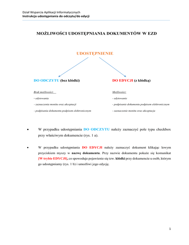 Dział Wsparcia Aplikacji Informatycznych Instrukcja udostępniania do odczytu/do edycji MOŻLIWOŚCI UDOSTĘPNIANIA DOKUMENTÓW W EZD UDOSTĘPNIENIE DO ODCZYTU (bez kłódki) DO EDYCJI (z kłódką) Brak możliwości: Możliwości: - edytowania - edytowanie - zaznaczenia monitu oraz akceptacji - podpisanie dokumentu podpisem elektronicznym - podpisania dokumentu podpisem elektronicznym - zaznaczenie monitu oraz akceptacja W przypadku udostępniania DO ODCZYTU należy zaznaczyć pole typu checkbox przy właściwym dokumencie (rys. 1 a). W przypadku udostępniania DO EDYCJI należy zaznaczyć dokument klikając lewym przyciskiem myszy w nazwę dokumentu. Przy nazwie dokumentu pokaże się komunikat [W trybie EDYCJI], co spowoduje pojawienie się tzw. kłódki przy dokumencie u osób, którym go udostępniamy (rys. 1 b) i umożliwi jego edycję. 1 Dział Wsparcia Aplikacji Informatycznych Instrukcja udostępniania do odczytu/do edycji Rys. 1 a, b 2