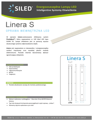 2 W oprawie Linera zastosowano efektywny system FluxAdjust™, który wyposażono w 120 diod LED typu DURIS E5. Lampa chłodzona jest za pomocą wysoce skutecznego systemu odprowadzania ciepła. Linera jest wyposażona w niezawodny i energooszczędny zasilacz impulsowy oraz wysokiej jakości moduły elektroniczne. Posiada również bezcieniowy dyfuzor ograniczający oślepianie. OBSZAR ZASTOSOWAŃ hale produkcyjne hipermarkety ciągi komunikacyjne garaże magazyny MONTAŻ Posiada wbudowane zaczepy do montażu podwieszanego. MATERIAŁY I WYKOŃCZENIA Dyfuzor wykonany z poliwęglanu – Macrolon firmy BAYER Material Science. Typ śrub służących do łączenia poszczególnych części oprawy -„imbus”. Elementy złączne wykonane są ze stali. SILED Sp. z o.o. • 83-011 Gdańsk, ul, Benzynowa 19, tel. + 48 58 322 28 35 • [email protected] • www.siled.pl PARAMETRY* Maksymalna moc znamionowa oprawy** Strumień z oprawy*** Liczba diod Typ LED Sugerowana wysokość montażu Waga Wymiary Napięcie znamionowe Częstotliwości sieci Współczynnik mocy (Power Factor) Współczynnik oddawania barw **** Temperatura otoczenia Trwałość źródła światła Klasa ochronności elektrycznej Stopień ochrony oprawy Odporność na uderzenia LINERA S-36 (3xP40M) 36 W LINERA S-53 (3xP40M) 53 W LINERA S-53 DALI (3xP40M) 53 W 3410 lm 120 DURIS E5 4680 lm 4680 lm 120 120 DURIS E5 DURIS E5 do 5 m 4,7 kg 860×163×57 mm 220–240 VAC 0/50/60Hz > 0,95 ≥ 80 -25°C ÷ +50°C Po 100.000h nie zarejestrowano spadku strumienia I IP 44 IK 05 *Wszystkie dane przedstawione w tabeli odnoszą się do kompletnej oprawy ** Moc znamionowa oprawy może być fabrycznie ustawiona z dokładnością do 1W w zakresie 20-100% mocy maksymalnej *** W związku z rozwojem technologii - wzrostem skuteczności świetlnych stosowanych diod LED, aktualne strumienie świetlne mogą być wyższe niż przedstawione w niniejszej tabeli. ****Na zamówienie inna wartość .***** Charakterystyki rozsyłu światła dla standardowej mocy i optyki. Możliwe jest uzyskanie innych wzorów dopasowanych do potrzeb klienta. FUNKCJE ADDwise™ Power Custom (zakres mocy) Constant Flux Czujnik ruchu / Czujnik światła DALI 1-10V Czujnik ruchu / Czujnik światła Standardowa barwa światła Dedykowana barwa światła Dedykowane bryły fotometryczne Odporność na przepięcia do 10 kV od 10 % do maksymalnej mocy znamionowej TAK - Opcja FluxAdjust™ 3000K Biała ciepła (warm white) / 4000K Biała neutralna (neutral white) TAK - Opcja