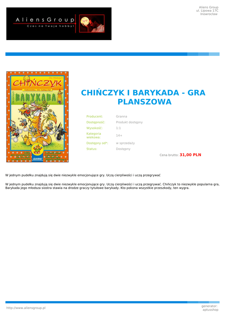 Aliens Group ul. Lipowa 17C Inowrocław CHIŃCZYK I BARYKADA - GRA PLANSZOWA Producent: Granna Dostępność: Produkt dostępny Wysokość: 1:1 Kategoria wiekowa: 14+ Dostępny od*: w sprzedaży Status: Dostępny Cena brutto: 31,00 PLN W jednym pudełku znajdują się dwie niezwykle emocjonujące gry. Uczą cierpliwości i uczą przegrywać W jednym pudełku znajdują się dwie niezwykle emocjonujące gry. Uczą cierpliwości i uczą przegrywać. Chińczyk to niezwykle popularna gra, Barykada jego młodsza siostra stawia na drodze graczy tytułowe barykady. Kto pokona wszystkie przeszkody, ten wygra. http://www.aliensgroup.pl generator: aptusshop