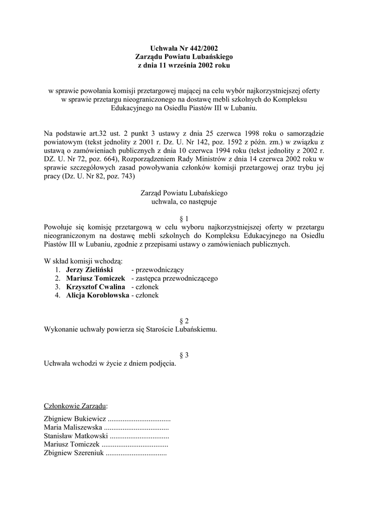 Uchwała Nr 442/2002 Zarządu Powiatu Lubańskiego z dnia 11 września 2002 roku w sprawie powołania komisji przetargowej mającej na celu wybór najkorzystniejszej oferty w sprawie przetargu nieograniczonego na dostawę mebli szkolnych do Kompleksu Edukacyjnego na Osiedlu Piastów III w Lubaniu. Na podstawie art.32 ust. 2 punkt 3 ustawy z dnia 25 czerwca 1998 roku o samorządzie powiatowym (tekst jednolity z 2001 r. Dz. U. Nr 142, poz. 1592 z późn. zm.) w związku z ustawą o zamówieniach publicznych z dnia 10 czerwca 1994 roku (tekst jednolity z 2002 r. DZ. U. Nr 72, poz. 664), Rozporządzeniem Rady Ministrów z dnia 14 czerwca 2002 roku w sprawie szczegółowych zasad powoływania członków komisji przetargowej oraz trybu jej pracy (Dz. U. Nr 82, poz. 743) Zarząd Powiatu Lubańskiego uchwala, co następuje §1 Powołuje się komisję przetargową w celu wyboru najkorzystniejszej oferty w przetargu nieograniczonym na dostawę mebli szkolnych do Kompleksu Edukacyjnego na Osiedlu Piastów III w Lubaniu, zgodnie z przepisami ustawy o zamówieniach publicznych. W skład komisji wchodzą: 1. Jerzy Zieliński - przewodniczący 2. Mariusz Tomiczek - zastępca przewodniczącego 3. Krzysztof Cwalina - członek 4. Alicja Koroblowska - członek §2 Wykonanie uchwały powierza się Staroście Lubańskiemu. §3 Uchwała wchodzi w życie z dniem podjęcia. Członkowie Zarządu: Zbigniew Bukiewicz .................................. Maria Maliszewska ................................... Stanisław Matkowski ................................ Mariusz Tomiczek .................................... Zbigniew Szereniuk .................................