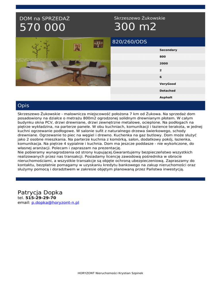 Skrzeszewo Żukowskie DOM na SPRZEDAŻ 300 m2 570 000 820/260/ODS Secondary 800 2000 2 6 VeryGood Detached Asphalt Opis Skrzeszewo Żukowskie - malownicza miejscowość położona 7 km od Żukowa. Na sprzedaż dom posadowiony na działce o metrażu 800m2 ogrodzonej solidnym drewnianym płotem. W całym budynku okna PCV, drzwi drewniane, drzwi zewnętrzne metalowe, ocieplone. Na podłogach na piętrze wykładzina, na parterze panele. W obu kuchniach, komunikacji i łazience terakota, w jednej kuchni ogrzewanie podłogowe. W salonie sufit z naturalnego drzewa świerkowego, schody drewniane. Ogrzewanie to piec na węgiel i drewno. Kuchenka na gaz butlowy. Dom może służyć jako 2 osobne mieszkania. Na parterze kuchnia z komórką, salon, dodatkowy pokój, łazienka, komunikacja. Na piętrze 4 sypialnie i kuchnia. Dom ma jeszcze poddasze - nie wykończone, do własnej aranżacji. Polecam i zapraszam na prezentację. Nie pobieramy wynagrodzenia od strony kupującej.Gwarantujemy bezpieczeństwo wszystkich realizowanych przez nas transakcji. Posiadamy licencję zawodową pośrednika w obrocie nieruchomościami, a wszystkie transakcje są objęte ochroną ubezpieczeniową. Zapraszamy do kontaktu, bezpłatnie pomagamy w uzyskaniu kredytu bankowego na zakup nieruchomości oraz służymy pomocą i doradztwem w zakresie objętym planowaną przez Państwa inwestycją. Patrycja Dopka tel. 515-29-29-70 email: [email protected] HORYZONT Nieruchomości Krystian Szpinek Powered by TCPDF (www.tcpdf.org)