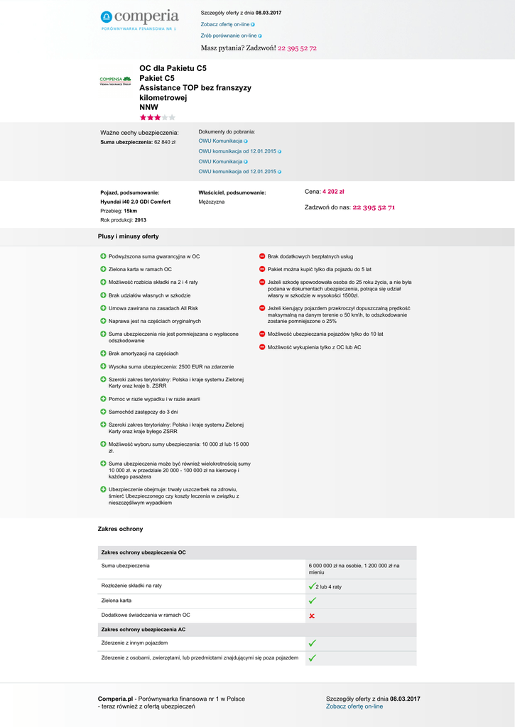 Szczegóły oferty z dnia 08.03.2017 Zobacz ofertę on-line Zrób porównanie on-line Masz pytania? Zadzwoń! 22 395 52 72 OC dla Pakietu C5 Pakiet C5 Assistance TOP bez franszyzy kilometrowej NNW Ważne cechy ubezpieczenia: Dokumenty do pobrania: Suma ubezpieczenia: 62 840 zł OWU Komunikacja OWU komunikacja od 12.01.2015 OWU Komunikacja OWU komunikacja od 12.01.2015 Pojazd, podsumowanie: Właściciel, podsumowanie: Hyundai i40 2.0 GDI Comfort Mężczyzna Cena: 4 202 zł Zadzwoń do nas: 22 395 52 71 Przebieg: 15km Rok produkcji: 2013 Plusy i minusy oferty Podwyższona suma gwarancyjna w OC Brak dodatkowych bezpłatnych usług Zielona karta w ramach OC Pakiet można kupić tylko dla pojazdu do 5 lat Możliwość rozbicia składki na 2 i 4 raty Jeżeli szkodę spowodowała osoba do 25 roku życia, a nie była podana w dokumentach ubezpieczenia, potrąca się udział własny w szkodzie w wysokości 1500zł. Brak udziałów własnych w szkodzie Umowa zawirana na zasadach All Risk Naprawa jest na częściach oryginalnych Suma ubezpieczenia nie jest pomniejszana o wypłacone odszkodowanie Jeżeli kierujący pojazdem przekroczył dopuszczalną prędkość maksymalną na danym terenie o 50 km\h, to odszkodowanie zostanie pomniejszone o 25% Możliwość ubezpieczania pojazdów tylko do 10 lat Możliwość wykupienia tylko z OC lub AC Brak amortyzacji na częściach Wysoka suma ubezpieczenia: 2500 EUR na zdarzenie Szeroki zakres terytorialny: Polska i kraje systemu Zielonej Karty oraz kraje b. ZSRR Pomoc w razie wypadku i w razie awarii Samochód zastępczy do 3 dni Szeroki zakres terytorialny: Polska i kraje systemu Zielonej Karty oraz kraje byłego ZSRR Możliwość wyboru sumy ubezpieczenia: 10 000 zł lub 15 000 zł. Suma ubezpieczenia może być również wielokrotnością sumy 10 000 zł. w przedziale 20 000 - 100 000 zł na kierowcę i każdego pasażera Ubezpieczenie obejmuje: trwały uszczerbek na zdrowiu, śmierć Ubezpieczonego czy koszty leczenia w związku z nieszczęśliwym wypadkiem Zakres ochrony Zakres ochrony ubezpieczenia OC Suma ubezpieczenia Rozłożenie składki na raty 6 000 000 zł na osobie, 1 200 000 zł na mieniu 2 lub 4 raty Zielona karta Dodatkowe świadczenia w ramach OC Zakres ochrony ubezpieczenia AC Zderzenie z innym pojazdem Zderzenie z osobami, zwierzętami, lub przedmiotami znajdującymi się poza pojazdem Comperia.pl - Porównywarka finansowa nr 1 w Polsce - teraz również z ofertą ubezpieczeń Szczegóły oferty z dnia 08.03.2017 Zobacz ofertę on-line Szczegóły oferty z dnia 08.03.2017 Zobacz ofertę on-line Zrób porównanie on-line Masz pytania? Zadzwoń! 22 395 52 72 Uszkodzenie przez osoby trzecie (wandalizm) Zamieszki, wewnętrzne niepokoje, wydarzenia wojenne Powstałych wskutek użycia pojazdu w związku z obowiązującymi świadczeniami na rzecz wojska i policji Wybuch Nagłe działanie czynnika termicznego lub chemicznego pochodzącego z zewnątrz pojazdu Powódź Lawina Osunięcie i zapadanie się ziemi Grad Uderzenie pioruna Huragan Trzęsienie ziemi Kradzież pojazdu (możliwość wyłączenia) Rabunek/Rozbój Upadek statku powietrznego Pożar Zakres ochrony Assistance Suma ubezpieczenia 2500 EUR na zdarzenie Zakres terytorialny Polska i Kraje systemu Zielonej Karty oraz kraje byłego ZSRR. Wiek pojazdu do którego można wykupić ubezpieczenie Możliwość wykupienia dla aut do 10 lat. Rodzaj pojazdu na który można wykupić ubezpieczenie samochód osobowy, inny pojazd wykonany przez adaptację pojazdu osobowego, pojazd wyprodukowany w karoserii samochodu osobowego jako pojazd typu VAN niezależnie od sposobu zarejestrowania Ograniczenia ze względu na sposób użytkowania pojazdu (np. taxi, nauka jazdy, rent a car) Ubezpieczeniem nie sa objęte taksówki, nauka jazdy, rent a car, pojazdy kurierskie Opcje zawarcia Z OC lub AC Baza Usprawnienie pojazdu na miejscu zdarzenia Pomoc w razie awarii Pomoc w razie wypadku Limit odległości od miejsca zamieszkania Brak limitu Miejsce holowania Samochód zastępczy Złomowanie pojazdu Parkowanie pojazdu Transport zastępczy/przewóz osób Nocleg/zakwaterowanie Dodatkowe informacje Zakres ochrony NNW Suma ubezpieczenia 10 000 zł Wypłata świadczenia w razie śmierci 50% świadczenia Wsiadanie i wysiadanie z pojazdu Załadowanie lub wyładowanie pojazdu Comperia.pl - Porównywarka finansowa nr 1 w Polsce - teraz również z ofertą ubezpieczeń Szczegóły oferty z dnia 08.03.2017 Zobacz ofertę on-line Szczegóły oferty z dnia 08.03.2017 Zobacz ofertę on-line Zrób porównanie on-line Masz pytania? Zadzwoń! 22 395 52 72 Pożar, wybuch pojazdu Zatrzymanie, postój, naprawa pojazdu Podwójne świadczenie w przypadku 90% trwałego uszczerbku na zdrowiu Garażowanie pojazdu Terytorium ochrony Terytorium ochrony ubezpieczenia AC Kraje Unii Europejskiej Algeria Albania bez kradzieży i wyposażenia dodatkowego Libia Maroko Mołdawia bez kradzieży i wyposażenia dodatkowego Białoruś bez kradzieży i wyposażenia dodatkowego Rosja (część europejska) bez kradzieży i wyposażenia dodatkowego Czarnogóra Serbia Bośnia i Hercegowina Tunezja Iran Turcja w części europejskiej Izrael Ukraina bez kradzieży i wyposażenia dodatkowego Wyłączenia Wyłączenia ubezpieczenia AC Udział własny w szkodzie Zniesiony Amortyzacja za części Brak amortyzacji Rodzaj stacji naprawczej (ze względu na metodę naprawy) Faktura (opcja naprawy bez części alternatywnych)- serwis / Kosztorys (opcja naprawy z częściami alternatywnymi)- stacja naprawcza Rodzaj używanych części do naprawy Części oryginalne (przy naprawie bezgotówkowej) Okres eksploatacji pojazdu w jakim można wykupić polisę AutoCasco Do 5 lat Minimalna szkoda (franszyza integralna) 500 zł Szkoda została spowodowana wskutek rażącego niedbalstwa Nie wypłaci, chyba, że umowa lub OWU stanowią inaczej lub zapłata odszkodowania odpowiada w danych okolicznościach względom słuszności. Kierowanie pojazdem w stanie nietrzeźwości, po 