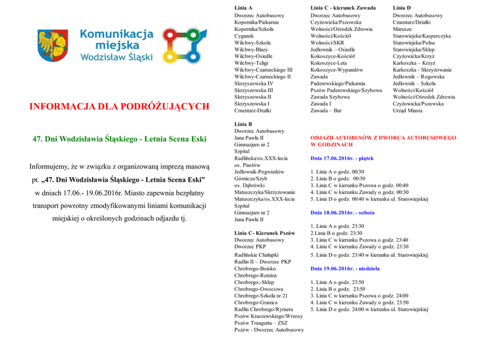 INFORMACJA DLA PODRÓŻUJĄCYCH 47. Dni Wodzisławia Śląskiego - Letnia Scena Eski Informujemy, że w związku z organizowaną imprezą masową pt. „47. Dni Wodzisławia Śląskiego - Letnia Scena Eski” w dniach 17.06.- 19.06.2016r. Miasto zapewnia bezpłatny transport powrotny zmodyfikowanymi liniami komunikacji miejskiej o określonych godzinach odjazdu tj. Linia A Dworzec Autobusowy Kopernika/Piekarnia Kopernika/Szkoła Cyganek Wilchwy-Szkoła Wilchwy-Blazy Wilchwy-Osiedle Wilchwy-Teligi Wilchwy-Czarneckiego III Wilchwy-Czarneckiego II Skrzyszowska IV Skrzyszowska III Skrzyszowska II Skrzyszowska I Cmentarz-Dzałki Linia B Dworzec Autobusowy Jana Pawła II Gimnazjum nr 2 Szpital Radlińska/os.XXX-lecia os. Piastów Jedłownik-Pogwizdów Górnicza/Szyb os. Dąbrówki Matuszczyka/Skrzyżowanie Matuszczyka/os.XXX-lecia Szpital Gimnazjum nr 2 Jana Pawła II Linia C- Kierunek Pszów Dworzec Autobusowy Dworzec PKP Radlińskie Chałupki Radlin II – Dworzec PKP Chrobrego-Boisko Chrobrego-Remiza Chrobrego;-Sklep Chrobrego-Owocowa Chrobrego-Szkoła nr 21 Chrobrego-Granica Radlin Chrobrego/Rymera Pszów Kraszewskiego/Wrzosy Pszów Traugutta – ZSZ Pszów - Dworzec Autobusowy Linia C - kierunek Zawada Dworzec Autobusowy Czyżowicka/Pszowska Wolności/Ośrodek Zdrowia Wolności/Kościół Wolności/SKR Jedłownik – Osiedle Kokoszyce-Kościół Kokoszyce-Leta Kokoszyce-Wypandów Zawada Paderewskiego/Piekarnia Pszów Paderewskiego/Szybowa Zawada Szybowa Zawada I Zawada – Bar Linia D Dworzec Autobusowy Cmentarz/Działki Marusze Starowiejska/Kasperczyka Starowiejska/Polna Starowiejska/Sklep Czyżowicka/Krzyż Karkoszka – Krzyż Karkoszka - Skrzyżowanie Jedłownik – Rogowska Jedłownik – Szkoła Wolności/Kościół Wolności/Ośrodek Zdrowia Czyżowicka/Pszowska Urząd Miasta ODJAZD AUTOBUSÓW Z DWORCA AUTOBUSOWEGO W GODZINACH Dnia 17.06.2016r. - piątek 1. Linia A o godz. 00:30 2. Linia B o godz. 00:30 3. Linia C w kierunku Pszowa o godz. 00:40 4. Linia C w kierunku Zawady o godz. 00:30 5. Linia D o godz. 00:40 w kierunku ul. Starowiejskiej Dnia 18.06.2016r. - sobota 1. Linia A o godz. 23:30 2.Linia B o godz. 23:30 3. Linia C w kierunku Pszowa o godz. 23:40 4. Linia C w kierunku Zawady o godz. 23:30 5. Linia D o godz. 23:40 w kierunku ul. Starowiejskiej Dnia 19.06.2016r. - niedziela 1. Linia A o godz. 23:50 2. Linia B o godz. 23:50 3. Linia C w kierunku Pszowa o godz. 24:00 4. Linia C w kierunku Zawady o godz. 23:50 5. Linia D o godz. 24:00 w kierunku ul. Starowiejskiej