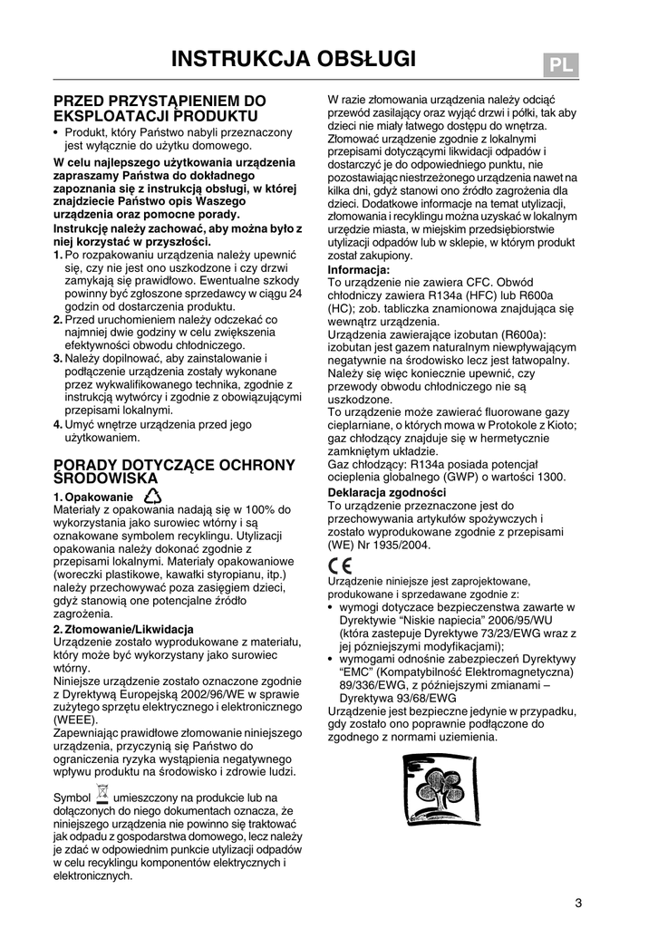 INSTRUKCJA OBSŁUGI PRZED PRZYSTĄPIENIEM DO EKSPLOATACJI PRODUKTU • Produkt, który Państwo nabyli przeznaczony jest wyłącznie do użytku domowego. W celu najlepszego użytkowania urządzenia zapraszamy Państwa do dokładnego zapoznania się z instrukcją obsługi, w której znajdziecie Państwo opis Waszego urządzenia oraz pomocne porady. Instrukcję należy zachować, aby można było z niej korzystać w przyszłości. 1. Po rozpakowaniu urządzenia należy upewnić się, czy nie jest ono uszkodzone i czy drzwi zamykają się prawidłowo. Ewentualne szkody powinny być zgłoszone sprzedawcy w ciągu 24 godzin od dostarczenia produktu. 2. Przed uruchomieniem należy odczekać co najmniej dwie godziny w celu zwiększenia efektywności obwodu chłodniczego. 3. Należy dopilnować, aby zainstalowanie i podłączenie urządzenia zostały wykonane przez wykwalifikowanego technika, zgodnie z instrukcją wytwórcy i zgodnie z obowiązującymi przepisami lokalnymi. 4. Umyć wnętrze urządzenia przed jego użytkowaniem. PORADY DOTYCZĄCE OCHRONY ŚRODOWISKA 1. Opakowanie Materiały z opakowania nadają się w 100% do wykorzystania jako surowiec wtórny i są oznakowane symbolem recyklingu. Utylizacji opakowania należy dokonać zgodnie z przepisami lokalnymi. Materiały opakowaniowe (woreczki plastikowe, kawałki styropianu, itp.) należy przechowywać poza zasięgiem dzieci, gdyż stanowią one potencjalne źródło zagrożenia. 2. Złomowanie/Likwidacja Urządzenie zostało wyprodukowane z materiału, który może być wykorzystany jako surowiec wtórny. Niniejsze urządzenie zostało oznaczone zgodnie z Dyrektywą Europejską 2002/96/WE w sprawie zużytego sprzętu elektrycznego i elektronicznego (WEEE). Zapewniając prawidłowe złomowanie niniejszego urządzenia, przyczynią się Państwo do ograniczenia ryzyka wystąpienia negatywnego wpływu produktu na środowisko i zdrowie ludzi. PL W razie złomowania urządzenia należy odciąć przewód zasilający oraz wyjąć drzwi i półki, tak aby dzieci nie miały łatwego dostępu do wnętrza. Złomować urządzenie zgodnie z lokalnymi przepisami dotyczącymi likwidacji odpadów i dostarczyć je do odpowiedniego punktu, nie pozostawiając niestrzeżonego urządzenia nawet na kilka dni, gdyż stanowi ono źródło zagrożenia dla dzieci. Dodatkowe informacje na temat utylizacji, złomowania i recyklingu można uzyskać w lokalnym urzędzie miasta, w miejskim przedsiębiorstwie utylizacji odpadów lub w sklepie, w którym produkt został zakupiony. Informacja: To urządzenie nie zawiera CFC. Obwód chłodniczy zawiera R134a (HFC) lub R600a (HC); zob. tabliczka znamionowa znajdująca się wewnątrz urządzenia. Urządzenia zawierające izobutan (R600a): izobutan jest gazem naturalnym niewpływającym negatywnie na środowisko lecz jest łatwopalny. Należy się więc koniecznie upewnić, czy przewody obwodu chłodniczego nie są uszkodzone. To urządzenie może zawierać fluorowane gazy cieplarniane, o których mowa w Protokole z Kioto; gaz chłodzący znajduje się w hermetycznie zamkniętym układzie. Gaz chłodzący: R134a posiada potencjał ocieplenia globalnego (GWP) o wartości 1300. Deklaracja zgodności To urządzenie przeznaczone jest do przechowywania artykułów spożywczych i zostało wyprodukowane zgodnie z przepisami (WE) Nr 1935/2004. Urządzenie niniejsze jest zaprojektowane, produkowane i sprzedawane zgodnie z: • wymogi dotyczace bezpieczenstwa zawarte w Dyrektywie “Niskie napiecia” 2006/95/WU (która zastepuje Dyrektywe 73/23/EWG wraz z jej pózniejszymi modyfikacjami); • wymogami odnośnie zabezpieczeń Dyrektywy “EMC” (Kompatybilność Elektromagnetyczna) 89/336/EWG, z późniejszymi zmianami – Dyrektywa 93/68/EWG Urządzenie jest bezpieczne jedynie w przypadku, gdy zostało ono poprawnie podłączone do zgodnego z normami uziemienia. Symbol umieszczony na produkcie lub na dołączonych do niego dokumentach oznacza, że niniejszego urządzenia nie powinno się traktować jak odpadu z gospodarstwa domowego, lecz należy je zdać w odpowiednim punkcie utylizacji odpadów w celu recyklingu komponentów elektrycznych i elektronicznych. 3 ŚRODKI OSTROŻNOŚCI I WSKAZÓWKI OGÓLNE INSTALACJA • Przemieszczanie oraz instalacja produktu muszą być wykonane przez dwie lub więcej osób. • Podczas przesuwania urządzenia należy uważać, aby nie uszkodzić posadzki (np. parkietu). • Podczas instalacji należy uważać, by produkt nie uszkodził kabla zasilającego. • Nie ustawiać urządzenia zbyt blisko źródła ciepła. • W celu zagwarantowania odpowiedniej wentylacji należy pozostawić trochę wolnej przestrzeni z obydwu stron urządzenia oraz nad nim lub postąpić według szczegółowej instrukcji. • Należy uważać, aby nie przykrywać ani nie zatykać otworów wentylacyjnych urządzenia. • Należy uważać, aby nie uszkodzić obiegu czynnika chłodniczego w urządzeniu. • Zainstalować i wypoziomować urządzenie na podłodze będącej w stanie utrzymać jego ciężar, w odpowiednim do jego wymiarów i przeznaczenia pomieszczeniu. • Urządzenie należy ustawić w miejscu suchym i dobrze wentylowanym. Urządzenie zostało przewidziane do funkcjonowania w środowisku, w którym temperatura zawiera się w następujących zakresach, zależnych od klasy klimatycznej podanej na tabliczce znamionowej: sprawność urządzenia może ulec pogorszeniu, w przypadku dłuższej eksploatacji w temperaturze wyższej lub niższej w stosunku do podanego przedziału. Klasa Klimatyczna SN N ST T Temp. Otocz. (°C) Od 10 do 32 Od 16 do 32 Od 16 do 38 Od 16 do 43 Temp. Otocz. (°F) Od 50 do 90 Od 61 do 90 Od 61 do 100 Od 61 do 110 • Sprawdzić czy napięcie zasilania podane na tabliczce znamionowej odpowiada napięciu sieci. • Nie używać ani prostych, ani wielokrotnych rozgałęźników lub przedłużaczy. • W celu podłączenia urządzenia do sieci wodnej użyć nowego przewodu rurowego należące