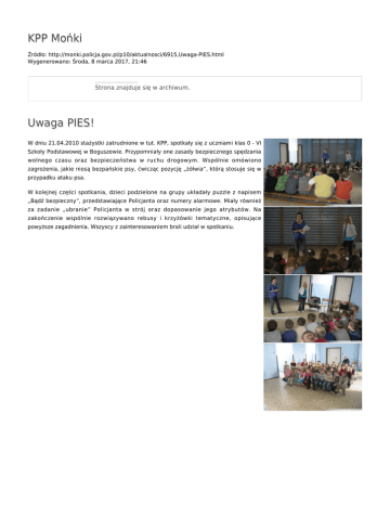 KPP Mońki Źródło: http://monki.policja.gov.pl/p10/aktualnosci/6915,Uwaga-PIES.html Wygenerowano: Środa, 8 marca 2017, 21:46 Strona znajduje się w archiwum. Uwaga PIES! W dniu 21.04.2010 stażystki zatrudnione w tut. KPP, spotkały się z uczniami klas 0 - VI Szkoły Podstawowej w Boguszewie. Przypomniały one zasady bezpiecznego spędzania wolnego czasu oraz bezpieczeństwa w ruchu drogowym. Wspólnie omówiono zagrożenia, jakie niosą bezpańskie psy, ćwicząc pozycję „żółwia”, którą stosuje się w przypadku ataku psa. W kolejnej części spotkania, dzieci podzielone na grupy układały puzzle z napisem „Bądź bezpieczny”, przedstawiające Policjanta oraz numery alarmowe. Miały również za zadanie „ubranie” Policjanta w strój oraz dopasowanie jego atrybutów. Na zakończenie wspólnie rozwiązywano rebusy i krzyżówki tematyczne, opisujące powyższe zagadnienia. Wszyscy z zainteresowaniem brali udział w spotkaniu. Ocena: 0/5 (0) Tweetnij