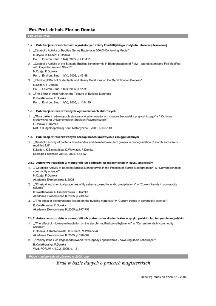 Em. Prof. dr hab. Florian Domka Publikacje 2005 1.a. Publikacje w czasopismach wyróżnionych z listy Filadelfijskiego Instytutu Informacji Naukowej 1. ,,Catabolic Activity of Bacillus Genus Bacteria in DDAO-Containing Media'' B.Brycki, K.Seifert, F.Domka Pol. J. Environ. Stud. 14(4), 2005, p.411-415 2. ,,Catabolic Activity of the Bacteria Bacillus licheniformis in Biodegradation of Poly( -caprolactam) and Foil Modified with Caprolactam and Starch'' N.Czaja, F.Domka Pol. J. Environ. Stud. 14(V), 2005, p.43-48 3. ,,Inhibiting Effect of Surfactants and Heavy Metal Ions on the Denitrification Process'' K.Seifert, F.Domka Pol. J. Environ. Stud. 14(1), 2005, p.87-93 4. ,,The Effect of Acid Rain on the Texture of Building Materials'' B.Kwiatkowska, F.Domka Pol. J. Environ. Stud. 14(V), 2005, p.115-119 1.c. Publikacje w recenzowanych wydawnictwach zbiorowych 1. ,,"Rola bakterii redukujących siarczany w zrównoważonym rozwoju środowiska przyrodniczego" w " Ochrona środowiska na Uniwersyteckich Studiach Przyrodniczych"'' L.Domka, F.Domka Mat. XIII Ogólnopolskiej Konf. Metodycznej , 2005, p.135-143 1.d. Publikacje w recenzowanych czasopismach krajowych o zasięgu lokalnym 1. ,,Catabolic activity of bacteria from bacillus and desulfotomaculum genera in biodegradation of starch and starchmodified foil'' K.Seifert, K.Szymańska, D.Wawrzak, F.Domka Ekologia i Technika XIII(2), 2005, p.47-52 2.a.2. Autorstwo rozdziału w monografii lub podręczniku akademickim w języku angielskim 1. ,,"Catabolic Activity of Bacteria Bacillus Licheniformis in the Process of Starch Biodegradation" w "Current trends in commodity science"'' N.Czaja, F.Domka Akademia Ekonomiczna I, 2005 2. ,,"Physical and chemical properties of fly ashes exposed to acidic precipitations" w "Current trends in commodity science"'' B.Kwiatkowska, R.Cierpiszewski, F.Domka Akademia Ekonomiczna II, 2005, p.739-746 3. ,,"The effect of environmental factors on the building materials" w "Current trends in commodity science"'' B.Kwiatkowska, F.Domka Akademia Ekonomiczna II, 2005, p.747-752 2.b.2. Autorstwo rozdziału w monografii lub podręczniku akademickim w języku polskim lub innym nie angielskim 1. ,,"The effect of microwave irradiation on the starch-modified polyethylene foil" w "Current trends in commodity science"'' F.Domka, A.Korzeniowski, H.Kubera, M.Walenciak Akademia Ekonomiczna II, 2005, p.656-662 2. ,,"Popioły lotne i ich zagospodarowanie" w "Odpady i opakowania - nowe regulacje i obowiązki"'' B.Kwiatkowska, F.Domka Wyd. FORUM 4/4.2.2, 2005, p.1-21 Prace magisterskie ukończone w 2005 roku Brak w bazie danych o pracach magisterskich Dane wg. stanu na dzień 5.12.2006