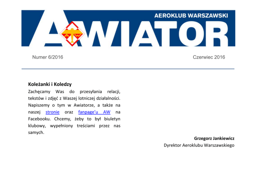Numer 6/2016 Czerwiec 2016 Koleżanki i Koledzy Zachęcamy Was do przesyłania relacji, tekstów i zdjęd z Waszej lotniczej działalności. Napiszemy o tym w Awiatorze, a także na naszej stronie oraz fanpage’u AW na Facebooku. Chcemy, żeby to był biuletyn klubowy, wypełniony treściami przez nas samych. Grzegorz Jankiewicz Dyrektor Aeroklubu Warszawskiego Sekcja Mikrolotowa. Reaktywacja Nasi „akrobaci” w Zielonej Górze 15 czerwca odbyło się zebranie reaktywowanej Sekcji Mikrolotowej, podczas którego wybrano jej Zarząd składzie: Alojzy Dernbach - Przewodniczący Grzegorz Kudłak - Skarbnik Mirosława Tomczyoska - Sekretarz Gratulujemy wyboru i życzymy owocnej pracy dla Sekcji. Na Mistrzostwach Polski w Akrobacji Samolotowej w klasie Advanced w Zielonej Górze reprezentowali nas: Marek Choim oraz Maciej Pospieszyoski. Dzieo Dziecka z Bogusiem Lotnikiem 3 czerwca 2016 r. odbyło się u nas lotniczo-czytelnicze spotkanie dzieci z pilotami i Bogusiem Niedźwiedziem Lotnikiem. Było mnóstwo atrakcji, a Boguś Lotnik odleciał od nas z odznaką – godłem Aeroklubu. Popatrzcie sami: https://www.aeroklub.waw.pl/6835/ddzien- dziecka-z-pilotami-i-bogusiem-niedzwiedziem-lotnikiem-waeroklubie-warszawskim/ Cobra lata! Nasza Cobra - odrestaurowana i przywrócona do latania dzięki zaangażowaniu naszych kolegów: Waldka Magnuszewskiego i Marcina Szaliłowa. Ależ to był skok! Skok tandemowy z 7000 m wylicytowany dla Wielkiej Orkiestry Świątecznej Pomocy! Prędkośd spadania ponad 270 km/h - była moc i niezapomniane wrażenia! Aeroklub na 200. Urodzinach Uniwersytetu Warszawskiego Aeroklub był partnerem obchodów 200. urodzin najstarszej warszawskiej uczelni. Lotniczą atrakcją tego wydarzenia była inscenizacja startu balonu Jordakiego Kuparenki oraz współczesne balony na skarpie uniwersyteckiej. Chod z powodu warunków pogodowych, daleko nie odleciały, przyciągnęły wielu zwiedzających, przede wszystkim dzieci, które mogły wsiąśd do kosza i unieśd się nieco nad ziemią. Oto relacja: https://www.aeroklub.waw.pl/6889/aeroklub-warszawskipartnerem-obchodow-200-urodzin-uniwersytetu-warszawskiego/ Targi Free Time Wraz z Aeromodelklubem Artbem uczestniczyliśmy w targach dla poszukujących pasji Free Time. Dla zwiedzających przygotowaliśmy m.in. pokazy akrobacji modeli samolotowych, wystawę ciekawych eksponatów, vouchery na loty samolotowe, szybowcowe i skoki spadochronowe. Tak wyglądało nasze stoisko:https://www.aeroklub.waw.pl/6928/aeroklubwarszawski-na-targach-free-time/ PW-5 Smyk atrakcją bemowskiego pikniku Na pikniku Bemowskiego Centrum Kultury nasz PW-5 „Smyk” był atrakcją numer 1. Każde dziecko chciało zasiąśd w kabinie i zrobid sobie pamiątkowe zdjęcie za sterami. Niektórzy do prawdziwego szybowca wsiadali z własnoręcznie wykonanym modelem „Smyka”. Popatrzcie: https://www.aeroklub.waw.pl/6952/pw-5-smyk-atrakcjabemowskiego-pikniku/ Fot. Jan Królik Chajzer w Puchaczu Urodzinowy pierwszy lot Popularny dziennikarz Filip Chajzer za sterami naszego Puchacza Wraz z ekipą TVN przyjechał na wywiad z Madkiem Pospieszyoskim. Przy okazji poprowadził na żywo realizację z lotu – można ją zobaczyd na naszym fanpage’u Naprawdę warto! Bartkowi Janczy, naszemu młodemu koledze, świeżo upieczonemu pilotowi, serdecznie gratulujemy pierwszego samodzielnego lotu wykonanego w dniu 16. urodzin! I życzymy wielu kolejnych fantastycznych lotniczych wrażeo. Trudniej do nas dojechad Specjalista poszukiwany Zatrudnimy Specjalistę ds. Zarządzania Ciągłą Zdatnością do Lotu. Podstawowe obowiązki na tym stanowisku to: kontakt z mechanikami oraz nadzór nad procesem obsługi samolotów i szybowców, opracowywanie dokumentacji, kontakt z nadzorami lotniczymi, a także producentami samolotów i podzespołów. CV można przesyład na adres: [email protected]. Przygotowała: Monika Gołębiowska [email protected] Od czerwca do połowy sierpnia utrudniony jest dojazd do Aeroklubu. Remontowana i zamknięta dla ruchu jest ul. Kwitnącej (na odcinku pomiędzy ul. Conrada a ul. Bogusławskiego). Objazd jest poprowadzony ulicami Conrada i Bogusławskiego.
