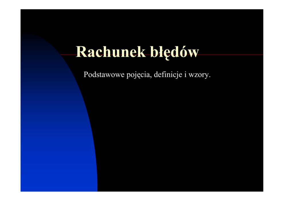 Rachunek błędów Podstawowe pojęcia, definicje i wzory. Wstęp Proces pomiarowy mający na celu poznanie obiektu badań prowadzi często do określenia wartości rzeczywistej badanej wielkości. Jednak wynik pomiarów może różnić się od wartości rzeczywistej wielkości mierzonej. Zatem ważną częścią tego procesu jest analiza popełnionych w trakcie pomiaru niedokładności. W tym celu wprowadza się pojęcie błędu pomiaru (nazywanego w przeszłości uchybem) oraz jego niepewności. Spotykamy się też z innymi pojęciami takimi jak: dokładność, klasa czy tolerancja 2 Podstawowe definicje Błąd pomiaru - niezgodność wyniku pomiaru z wartością rzeczywistą wielkości mierzonej ∆x = x − x δx = ∆x xR Błąd bezwzględny - jest to różnica między wynikiem pomiaru x i wartością rzeczywistą xR wielkości mierzonej i wyraża R się w tych samych jednostkach, co wielkość mierzona Błąd względny - jest ilorazem błędu bezwzględnego i wartości rzeczywistej (wyrażany głównie w procentach, dzięki temu jest przydatny przy porównywaniu jakości pomiarów różnych wielkości 100% 3 Wartość poprawna W metrologii wartość rzeczywista jest pojęciem teoretycznym, jej przybliżeniem jest wartość poprawna, czyli taka która określona jest wystarczająco dokładnie. Dlatego wprowadza się błąd poprawny ∆ P x = x − xP = − p p – poprawka p = − ∆ P x = xP − x Służy do poprawienia wyniku pomiaru xP = x + p W praktyce Î : δx = ∆x xR ≈ ∆Px xR ≈ ∆Px xP ≈ ∆Px x 4 Niepewność pomiaru Graniczny błąd pomiaru (niepewność pomiaru) jest to błąd bez znaku i określa przedział taki, że: x − ∆ g x ≤ xR ≤ x + ∆ g x xR = x ± ∆ g x δ g x = ∆g x xR ≈ ∆g x xP ≈ ∆g x x Niepewność zwykle jest szacowana, czyli określana z pewnym przybliżeniem co wynika z naszej niewiedzy na temat dokładnych wartości xR, xP, czy też zjawisk. 5 Zapis wyników pomiarów Ostateczny zapis wyników pomiarów musi mieć odpowiednią formę. W tym celu dokonuje się zaokrągleń w następujący sposób: błędy (∆ i δ) zaokrąglamy zawsze w górę, do jednej cyfry znaczącej liczbę przybliżoną (x) zaokrąglamy do tylu miejsc po przecinku, ile występuje w błędzie. Przykłady: x=2,494 i ∆x=±0,043 zapisujemy 2,49±0,05 x=237,465 i ∆x=±0,127 zapisujemy 237,5±0,2 x=123375 i ∆x=±678 zapisujemy 6 3 123400±700 lub (123,4 ±0,7) 10 Podział błędów ze względu ma ich charakter błędy systematyczne błędy przypadkowe błędy grube (nadmierne, omyłki) 7 Podział błędów ze względu na ich charakter Błąd systematyczny - jest to błąd, który przy wielokrotnym pomiarze danej wielkości w nie zmienionych praktycznie warunkach, pozostaje stały co do wartości i co do znaku, albo zmienia się według znanej zależności. Istotną cechą błędu systematycznego jest to, iż można w wielu wypadkach usunąć go z wyniku pomiaru wyznaczając poprawkę Błąd przypadkowy - jest to błąd zmieniający się w sposób przypadkowy zarówno co do wartości, jak i co do znaku przy wielokrotnym powtarzaniu pomiaru danej wielkości w praktycznie niezmiennych warunkach. Błąd nadmierny - Zwany też błędem grubym lub omyłką. Jest to rażąca odmienność wyniku pomiarowego od pozostałych. Jeśli jest to faktycznie omyłka, wtedy pomiar taki odrzucamy w przeciwnym razie wynik taki należy poddać wnikliwej analizie 8 Zmienne losowe Wynik pomiaru i błąd przypadkowy można traktować jak zmienne losowe. W dalszych rozważaniach zakładamy, że wynik pomiaru nie jest obciążony błędem systematycznym. Zmienna losowa X - jest to wielkość mierzalna, której wartości (x) zależą od przypadku. W wyniku pomiaru zmienna losowa (X) przyjmuje tylko jedną wartość (x) spośród wszystkich możliwych. f ( x) = dF ( x ) dx f(x) - funkcja gęstości prawdopodobieństwa (gęstość prawdopodobieństwa) F(x) - dystrybuanta zmiennej losowej x F ( x ) = P ( X ) = P ( −∞ < X < x ) = ∫ f (x )dx −∞ 9 Zmienne losowe c.d. ∞ F ( ∞ ) = P ( −∞ < X < ∞ ) = ∫ f (x )dx =1 −∞ P ( x1 < X < x 2 ) = x1 ∫ f (x )dx x2 ∞ E(X ) = ∫ xf (x )dx −∞ σ ∞ 2 = E [ X − E ( X )] 2 = 2 [ X − E ( X )] f ( x )dx ∫ −∞ P(x1<X<x2) - prawdopodobieństwo, że zmienna losowa przyjmie wartości pomiędzy x1 a x2. E(X) - wartość oczekiwana, jest miarą skupienia rozkładu σ2 - wariancja, jest miarą rozproszenia rozkładu. Wielkość σ jest odchyleniem standardowym (odchyleniem średnim 10 kwadratowym) Rozkład normalny Przy dużej liczbie pomiarów przyjmuje się że pomiary jako zmienne losowe mają rozkład normalny (rozkład Gaussa). −. 1 f ( x) = e σ 2π E ( X ) = xR ( x − E ( X )) 2 2σ 2 −. 1 = e σ 2π ( x − xR )2 2σ 2 f(x) σ1 < σ2 Wartości prawdopodobieństwa dla szczególnych przedziałów: σ2 P(xR-σ<x<xR+σ)=0,68 x P(xR-2σ<x<xR+2σ)=0,95 P(xR-3σ<x<xR+3σ)=0,9973 xR xR-σ xR+σ 11 Rozkład normalny c.d. xR ± ∆ g x ⇒ E ( X ) ± 3σ ∆ g x = 3σ takiej postaci wyniku oczekiwaliśmy, szukaliśmy graniczna niepewność wyniku pomiaru („reguła trzech sigm”). Jest to przedział ufności określony na wybranym poziomie ufności (istotności). 12 Praktyczna ocena błędów przypadkowych 1 E(X ) = x = n n ∑x i =1 E ( X ) = xR σ = 2 x σ 2 ⇒ n n s2 = ⇒ ∑ ( xi − x ) i ≈ xR oszacowanie wartości rzeczywistej. Tak liczona wartość jest też zmienną losową E ( x ) = xR σx = σ n n 2 ⇒ i =1 n −1 s x2 = 2 ( x − x ) ∑ i i =1 n ( n − 1) Ponowne oszacowanie wartości rzeczywistej i jej odchylenia standardowego dla n >30 ostateczny wynik to xR ± ∆ g x ⇒ E ( X ) ± 3σ ⇒ x ± 3s x 13 Praktyczna ocena błędów przypadkowych c.d. dla n <30 korzysta się z rozkładu t-Studenta xR ± ∆ g x ⇒ x ± tα s x Z tablic, dla określonej liczby stopni swobody k=n-1 i dla wybranego poziomu ufności α odczytuje się współczynnik tα. 14 Błędy w pomiarach pośrednich Pomiar be