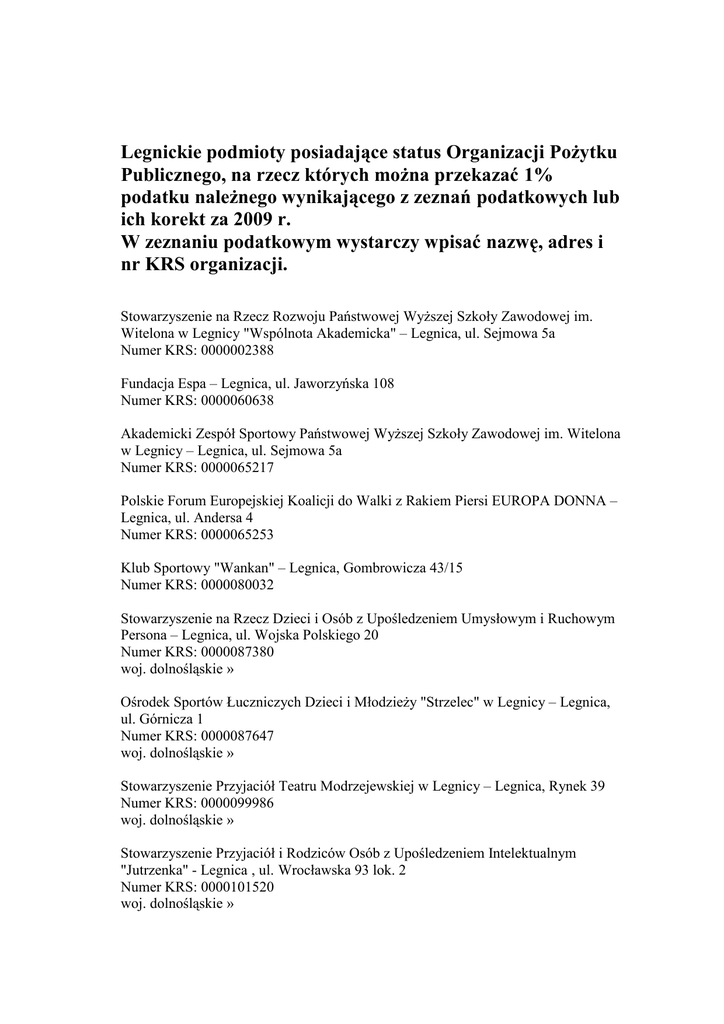 Legnickie podmioty posiadające status Organizacji PoŜytku Publicznego, na rzecz których moŜna przekazać 1% podatku naleŜnego wynikającego z zeznań podatkowych lub ich korekt za 2009 r. W zeznaniu podatkowym wystarczy wpisać nazwę, adres i nr KRS organizacji. Stowarzyszenie na Rzecz Rozwoju Państwowej WyŜszej Szkoły Zawodowej im. Witelona w Legnicy "Wspólnota Akademicka" – Legnica, ul. Sejmowa 5a Numer KRS: 0000002388 Fundacja Espa – Legnica, ul. Jaworzyńska 108 Numer KRS: 0000060638 Akademicki Zespół Sportowy Państwowej WyŜszej Szkoły Zawodowej im. Witelona w Legnicy – Legnica, ul. Sejmowa 5a Numer KRS: 0000065217 Polskie Forum Europejskiej Koalicji do Walki z Rakiem Piersi EUROPA DONNA – Legnica, ul. Andersa 4 Numer KRS: 0000065253 Klub Sportowy "Wankan" – Legnica, Gombrowicza 43/15 Numer KRS: 0000080032 Stowarzyszenie na Rzecz Dzieci i Osób z Upośledzeniem Umysłowym i Ruchowym Persona – Legnica, ul. Wojska Polskiego 20 Numer KRS: 0000087380 woj. dolnośląskie » Ośrodek Sportów Łuczniczych Dzieci i MłodzieŜy "Strzelec" w Legnicy – Legnica, ul. Górnicza 1 Numer KRS: 0000087647 woj. dolnośląskie » Stowarzyszenie Przyjaciół Teatru Modrzejewskiej w Legnicy – Legnica, Rynek 39 Numer KRS: 0000099986 woj. dolnośląskie » Stowarzyszenie Przyjaciół i Rodziców Osób z Upośledzeniem Intelektualnym "Jutrzenka" - Legnica , ul. Wrocławska 93 lok. 2 Numer KRS: 0000101520 woj. dolnośląskie » Ruch Kobiet Do Walki z Rakiem Piersi - Europa Donna Legnica – Legnica, ul. Andersa 40 Numer KRS: 0000101623 woj. dolnośląskie Fundacja na Rzecz Dzieci Zagłębia Miedziowego – Legnica, ul. Okrzei 10 The Foundation for Children From The Copper Basin Numer KRS: 0000107870 woj. dolnośląskie » Autonomiczna Sekcja Piłki NoŜnej "Miedź" – Legnica, śeglarska 5 Numer KRS: 0000114695 woj. dolnośląskie » Autonomiczna Sekcja Szachowa "Miedź" – Legnica, pl. Słowiański 1 p.313 Numer KRS: 0000122747 woj. dolnośląskie » Fundacja Ekologiczna "Zielona Akcja" – Legnica, Wrocławska 41 Numer KRS: 0000125740 woj. dolnośląskie » Klub Sportowy "Konfeks" Legnica – Legnica, ul. Grabskiego 24 Numer KRS: 0000132808 woj. dolnośląskie » Charytatywne Stowarzyszenie Niesienia Pomocy Osobom UzaleŜnionym od Alkoholu, Osobom WspółuzaleŜnionym oraz Ofiarom Przemocy "Nie Jesteś Sam" – Legnica, ul. Powstańców Śl.10 Numer KRS: 0000147232 woj. dolnośląskie » Muzeum Techniki i Motoryzacji – Legnica, ul. Torowa 42 /15 Numer KRS: 0000147456 woj. dolnośląskie » Data aktualizacji: 2009-07-01 Towarzystwo Miłośników Legnicy "Pro Legnica" – Legnica, ul. Rycerska 2 p.101 The Society of Friends of Legnica "Pro Legnica" Numer KRS: 0000155325 woj. dolnośląskie » Kiwanis Club Legnica – Legnica, Rynek 39 Numer KRS: 0000174511 woj. dolnośląskie » Legnickie Towarzystwo Lotnicze – Legnica, ul. Galaktyczna 8/11 Numer KRS: 0000213399 woj. dolnośląskie » Stowarzyszenie na Rzecz Wspierania i Rozwoju Integracji przy Zespole Szkół Integracyjnych w Legnicy "Uśmiech Dziecka" – Legnica, ul. Wierzyńskiego 1 Numer KRS: 0000214044 woj. dolnośląskie » Klub Sportowy "Olimpia" – Legnica, ul. Libana 12 Numer KRS: 0000217392 woj. dolnośląskie » Caritas Diecezji Legnickiej – Legnica, ul. Okrzei 12 Numer KRS: 0000221535 woj. dolnośląskie » Legnicki Klub Oyama Karate - Legnica , ul. Paderewskiego 4a Numer KRS: 0000227717 woj. dolnośląskie » Towarzystwo "Pro Sinfonica" – Legnica, ul. Chojnowska 2 Numer KRS: 0000232208 woj. dolnośląskie » Stowarzyszenie "Polski Program Rozwoju i Podnoszenia Świadomości - Promień Nadziei" – Legnica, ul. Pomorska 19 Polish Programme for Development and Awareness Raising - Ray of Hope Numer KRS: 0000233912 woj. dolnośląskie » Klub Sportowy "Ikar Legnica" – Legnica, ul. Piastowska 72 lok. 229 Numer KRS: 0000239656 woj. dolnośląskie » Stowarzyszenie "Rodzina" – Legnica, ul. Słubicka 6 Numer KRS: 0000270068 woj. dolnośląskie » Legnickie Stowarzyszenie Rodzin i Przyjaciół Dzieci z Zespołem Downa "Otwórz Serce" – Legnica, ul. Gumińskiego 6 lok. 1 Numer KRS: 0000285728 woj. dolnośląskie » Stowarzyszenie Pomocy Osobom Niepełnosprawnym - "Tetrusek" – Legnica, ul. Wileńska 7a lok. 3 Numer KRS: 0000304472 woj. dolnośląskie » Fundacja Euco Dzieciom – Legnica, ul. Kolbego 18 Numer KRS: 0000304686 woj. dolnośląskie » Fundacja "Na Ratunek Dzieciom Zagłębia Miedziowego" – Legnica, ul. Zagrodowa 7 lok. 6 Numer KRS: 0000305648 woj. dolnośląskie » Stowarzyszenie Rodziców i Przyjaciół MłodzieŜowej Orkiestry "Sursum Corda" w Legnicy – Legnica, ul. Jana Pawła II 1 Numer KRS: 0000317060 woj. dolnośląskie » Fundacja "Otwarte Serce" – Legnica, ul. Iwaszkiewicza 5 Numer KRS: 0000341502 woj. dolnośląskie » (baza organizacji poŜytku publicznego uprawnionych do otrzymywania 1% podatku w 2010 roku. utworzona jest na podstawie aktualizowanej listy organizacji poŜytku publicznego publikowanej w BIP Ministerstwa Pracy i Polityki Społecznej wg stanu nadzień 13.03.2010 r.