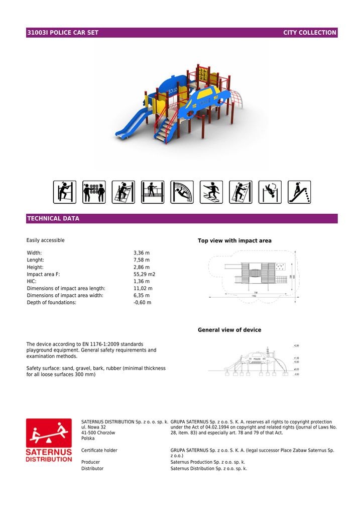 31003I POLICE CAR SET CITY COLLECTION TECHNICAL DATA Easily accessible Top view with impact area Width: Lenght: Height: Impact area F: HIC: Dimensions of impact area length: Dimensions of impact area width: Depth of foundations: 3,36 m 7,58 m 2,86 m 55,29 m2 1,36 m 11,02 m 6,35 m -0,60 m General view of device The device according to EN 1176-1:2009 standards playground equipment. General safety requirements and examination methods. Safety surface: sand, gravel, bark, rubber (minimal thickness for all loose surfaces 300 mm) SATERNUS DISTRIBUTION Sp. z o. o. sp. k. GRUPA SATERNUS Sp. z o.o. S. K. A. reserves all rights to copyright protection ul. Nowa 32 under the Act of 04.02.1994 on copyright and related rights (Journal of Laws No. 41-500 Chorzów 28, item. 83) and especially art. 78 and 79 of that Act. Polska Certificate holder Producer Distributor GRUPA SATERNUS Sp. z o.o. S. K. A. (legal successor Place Zabaw Saternus Sp. z o.o.) Saternus Production Sp. z o.o. sp. k. Saternus Distribution Sp. z o.o. sp. k. LIST OF ELEMENTS 'Tic Tac Toe' Interactive game: Arched entery ropenet 136 cm: Climbing wall 136cm: Coups set: Entry stairs 90cm: European emergency number: Flip tube: Police emergency number: Rope bridge: Slide 90 cm: Tower without roof, platform 136cm: Tower without roof, platform 90 cm: Vertical ladder: MATERIALS 1 1 1 2 1 2 2 2 1 1 3 6 2 Anchors: Caps: Chain: Climbing wall: Construction Legs: Foundations: Platforms, stairs: Roof elements: Ropes: Slide: Steel elements: Tic Tac Toe: bath-galvanized steel plastic bath-galvanized steel shuttering waterproof plywood, climbing grips made of material, based on resins made of three-layer laminated wood, varnish painted the color of dark walnut concret min. B-15 standard impregnated boards HDPE plate Polypropylene for steel braided interconnected by plastic connectors stainless steel bath-galvanized steel, powder painted Polypropylene rolls, painted in the screen printing technique SATERNUS DISTRIBUTION Sp. z o. o. sp. k. GRUPA SATERNUS Sp. z o.o. S. K. A. reserves all rights to copyright protection ul. Nowa 32 under the Act of 04.02.1994 on copyright and related rights (Journal of Laws No. 41-500 Chorzów 28, item. 83) and especially art. 78 and 79 of that Act. Polska Certificate holder Producer Distributor GRUPA SATERNUS Sp. z o.o. S. K. A. (legal successor Place Zabaw Saternus Sp. z o.o.) Saternus Production Sp. z o.o. sp. k. Saternus Distribution Sp. z o.o. sp. k.