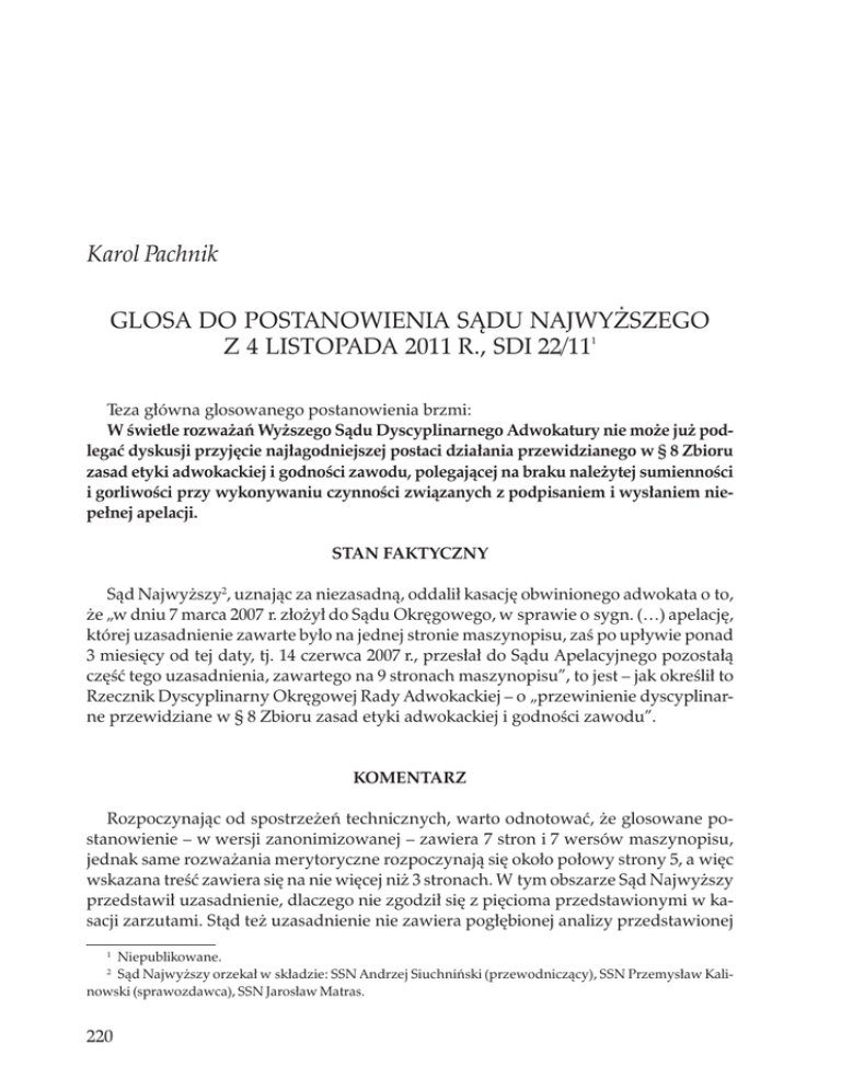 Karol Pachnik Glosa do postanowienia Sądu Najwyższego z 4 listopada 2011 r., SDI 22/11 Teza główna glosowanego postanowienia brzmi: W świetle rozważań Wyższego Sądu Dyscyplinarnego Adwokatury nie może już podlegać dyskusji przyjęcie najłagodniejszej postaci działania przewidzianego w § 8 Zbioru zasad etyki adwokackiej i godności zawodu, polegającej na braku należytej sumienności i gorliwości przy wykonywaniu czynności związanych z podpisaniem i wysłaniem niepełnej apelacji. Stan faktyczny Sąd Najwyższy, uznając za niezasadną, oddalił kasację obwinionego adwokata o to, że „w dniu 7 marca 2007 r. złożył do Sądu Okręgowego, w sprawie o sygn. (…) apelację, której uzasadnienie zawarte było na jednej stronie maszynopisu, zaś po upływie ponad 3 miesięcy od tej daty, tj. 14 czerwca 2007 r., przesłał do Sądu Apelacyjnego pozostałą część tego uzasadnienia, zawartego na 9 stronach maszynopisu”, to jest – jak określił to Rzecznik Dyscyplinarny Okręgowej Rady Adwokackiej – o „przewinienie dyscyplinarne przewidziane w § 8 Zbioru zasad etyki adwokackiej i godności zawodu”. Komentarz Rozpoczynając od spostrzeżeń technicznych, warto odnotować, że glosowane postanowienie – w wersji zanonimizowanej – zawiera 7 stron i 7 wersów maszynopisu, jednak same rozważania merytoryczne rozpoczynają się około połowy strony 5, a więc wskazana treść zawiera się na nie więcej niż 3 stronach. W tym obszarze Sąd Najwyższy przedstawił uzasadnienie, dlaczego nie zgodził się z pięcioma przedstawionymi w kasacji zarzutami. Stąd też uzasadnienie nie zawiera pogłębionej analizy przedstawionej Niepublikowane. Sąd Najwyższy orzekał w składzie: SSN Andrzej Siuchniński (przewodniczący), SSN Przemysław Kalinowski (sprawozdawca), SSN Jarosław Matras. 220 11–12/2013 Glosa do postanowienia... powyżej najistotniejszej tezy glosowanego postanowienia. Niemniej nie uniemożliwia to poczynienia potrzebnych rozważań. W orzeczeniu występują odniesienia do Zbioru zasad etyki adwokackiej i godności zawodu, co jest pewnym niepoprawnym skrótem myślowym – nie ma wewnętrznego aktu prawnego Adwokatury o takiej nazwie ani takiej formie – jest wszak uchwała NRA, jednak o innym tytule – Zbiór zasad etyki adwokackiej i godności zawodu (Kodeks etyki adwokackiej). Przechodząc do rozważań merytorycznych, zauważyć trzeba, że adwokat może ponosić odpowiedzialność dyscyplinarną za postępowanie sprzeczne z zasadami etyki lub godności zawodu, przy czym naruszeniem godności zawodu adwokackiego jest takie postępowanie adwokata, które mogłoby go poniżyć w opinii publicznej lub poderwać zaufanie do zawodu. Muszą więc wystąpić określone przesłanki kumulatywnie. Co więcej, ustawodawca odróżnił naruszenie zasad etyki od zasad godności, przy czym o ile przywoływany powyżej Zbiór zasad etyki adwokackiej i godności zawodu (Kodeks etyki adwokackiej) zawiera odniesienie do sytuacji naruszenia zasad godności zawodu (vide jego § 1 pkt 2), o tyle nie określa jednocześnie, czym jest naruszenie zasad etyki adwokackiej, wskazując jedynie, że zasady etyki adwokackiej wynikają z norm etycznych przystosowanych do zawodu adwokata, a więc wiążąc te normy z działalnością zawodową. W doktrynie ujawniono pogląd, że etyka to ogół ocen i norm moralnych przyjętych za obowiązujące przez społeczeństwo, a przedmiot etyki adwokata wynika z zastosowania do zawodu adwokata norm moralności ogólnej. Moralność adwokacka to po prostu zastosowanie ogólnych zasad etyki do konkretnych sytuacji wynikających ze specyfiki zawodu adwokackiego. Obwinionemu adwokatowi zarzucono naruszenie § 8 Zbioru zasad etyki adwokackiej i godności zawodu (Kodeksu etyki adwokackiej): adwokat powinien wykonywać czynności zawodowe według najlepszej woli i wiedzy, z należytą uczciwością, sumiennością i gorliwością. Obowiązkiem adwokata jest stałe podnoszenie kwalifikacji zawodowych i dążenie do utrzymania wysokiej sprawności zawodowej. Naruszenie miało się objawiać przesłaniem do sądu apelacji, której uzasadnienie zawarte było na jednej stronie maszynopisu, oraz dosłaniem po upływie ponad 3 miesięcy pozostałej części uzasadnienia, zawartego na 9 stronach maszynopisu. Adwokatowi nie zarzucono uchybień językowych, a trzeba też przypomnieć za E. Sindlewskim, że niechlujstwo językowe to przejaw braku właściwej postawy etycznej. Jak ocenił R. Tokarczyk, status zawodowy adwokata jest na tyle doniosły, że regulują go zwykle ustawy nie tylko państwowej władzy prawodawczej, ale i normy pochodzące od korporacji zawodowej adwokatów. O ile ustawy mają na celu głównie określenie właściwego miejsca adwokatury w całym systemie wymiaru sprawiedliwości, o tyle normy korporacji zawodowej adwokatów koncentrują się wokół zapewnienia niezależności adwokatów podczas wykonywania ich zadań. Uchwała Naczelnej Rady Adwokackiej z 10 października 1998 r., nr 2/XVIII/98 ze zm. Z. Krzemiński, Wokół etyki zawodowej adwokata, „Palestra” 1985, nr 7–8, s. 62. R. Tokarczyk, Zarys przedmiotu etyki adwokata, „Przegląd Sądowy” 2005, nr 7–8, s. 21. Z. Krzemiński, Nowy Zbiór zasad etyki adwokackiej i godności zawodu, „Palestra” 1970, nr 3, s. 4. E. Sindlewski, Przyczynki do kształtowania postaw etycznych adwokatów, „Palestra” 1975, nr 5–6, s. 23. R. Tokarczyk, Zarys przedmiotu, s. 20. 221 Karol Pachnik PALESTRA Można przywoływać, że historycznie już XVIII-wieczna palestra podlegała nie w pełni jeszcze wykształconym zasadom etycznym określonym przez sejm (konstytucje sejmowe) lub sądy (ordynacje sądowe). W pismach adwokaci musieli unikać przytaczania praw nieistniejących10. Jednocześnie aż do lat sześćdziesiątych XX wieku wśród palestry polskiej dominował pogląd, że uchwały samorządowych organów Adwokatury i orzecznictwo dyscyplinarne jej komisji dyscypli