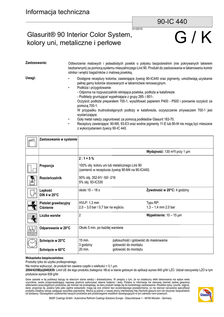 Informacja techniczna 90-IC 440 Glasurit® 90 Interior Color System, kolory uni, metaliczne i perłowe Zastosowanie: G/K 01/2015 Odtworzenie matowych i jedwabistych powłok o połysku bezpośrednim (nie pokrywanych lakierem bezbarwnym) za pomocą systemu mieszalniczego Linii 90. Produkt do zastosowania w lakierowaniu komór silnika i wnętrz bagażników z matową powłoką. Uwagi: • • • • Dostępne receptury kolorów, zawierające żywicę 90-IC440 oraz pigmenty, umożliwiają uzyskanie pełnej gamy kolorów stosowanych w lakiernictwie renowacyjnym. Podłoża i przygotowanie: - Odporna na rozpuszczalniki istniejąca powłoka, podłoża w kataforezie - Podkłady gruntujące/ wypełniające z grupy 285- i 801-. Oczyścić podłoże preparatem 700-1, wyszlifować papierem P400 - P500 i ponownie oczyścić za pomocą 700-1. W przypadku trudnodostępnych podłoży w kataforezie, oczyszczenie zmywaczem 700-1 jest wystarczające. Goły metal należy zagruntować za pomocą podkładów Glasurit 183-70. Receptury zawierające: 90-M5, 93-E3 oraz wodne pigmenty 11-E lub 80-M nie mogą być mieszane z wykorzystaniem żywicy 90-IC 440. Zastosowanie w systemie Wydajność: 130 m²/l przy 1 μm 2:1+5% Proporcja 100% obj. koloru uni lub metalicznego Linii 90 (zamienić w recepturze żywicę 90-M4 na 90-IC440) Rozcieńczalnik 50% obj. 352-91/ -50/ -216 5% obj. 93-IC330 Lepkość DIN 4 w 20°C około 15 – 18 s Żywotność w 20°C: 4 godziny Pistolet grawitacyjny Ciśnienie HVLP: 1,3 mm 2,0 – 3,0 bar / 0,7 bar na wyjściu Typu RP: 1,3 – 1,4 mm 2,0 bar Liczba warstw 2 Wypełnienie: 10 – 15 μm Odparowanie w 20°C Około 5 min. po każdej warstwie Schnięcie w 20°C Schnięcie w 60°C 15 min. 3 godziny 20 min. pyłosuchość i gotowość do maskowania gotowość do montażu gotowość do montażu Wskazówka bezpieczeństwa: Produkty tylko do użytku profesjonalnego. Nie można wykluczyć, że produkt ten zawiera cząstki o wielkości < 0,1 µm. 2004/42/IIB(e)(840)839: Limit UE dla tego produktu (kategoria: IIB.e) w stanie gotowym do aplikacji wynosi 840 g/litr LZO. Udział rzeczywisty LZO w tym produkcie wynosi 839 g/litr. Dane zawarte w tej publikacji bazują na obecnym stanie wiedzy i doświadczeniu. W związku z tym, że na ostateczny efekt lakierowania ma wpływ wiele czynników, osoba przeprowadzająca naprawę powinna wykonywać własne badania i testy. Podane tu informacje nie stanowią również żadnej gwarancji właściwości poszczególnych produktów, jak również nie przesądzają, że dany produkt nadaje się do konkretnego zastosowania. Wszelkie opisy, rysunki, zdjęcia, dane, proporcje itp. podano tylko jako ogólne wskazówki; mogą się one zmienić bez wcześniejszego powiadomienia, co nie stanowi naruszenia specyfikacji produktu.Ostatnia wersja zastępuje wszystkie poprzednie. Można ją pobrać z naszej strony internetowej http://techinfo.glasurit.com lub otrzymać bezpośrednio od dostawcy. Obowiązkiem użytkownika naszych produktów jest przestrzeganie wszelkich obowiązujących w tym zakresie norm prawnych. BASF Coatings GmbH - Automotive Refinish Coatings Solutions Europe - Glasuritstrasse 1 - 48165 Münster - Germany