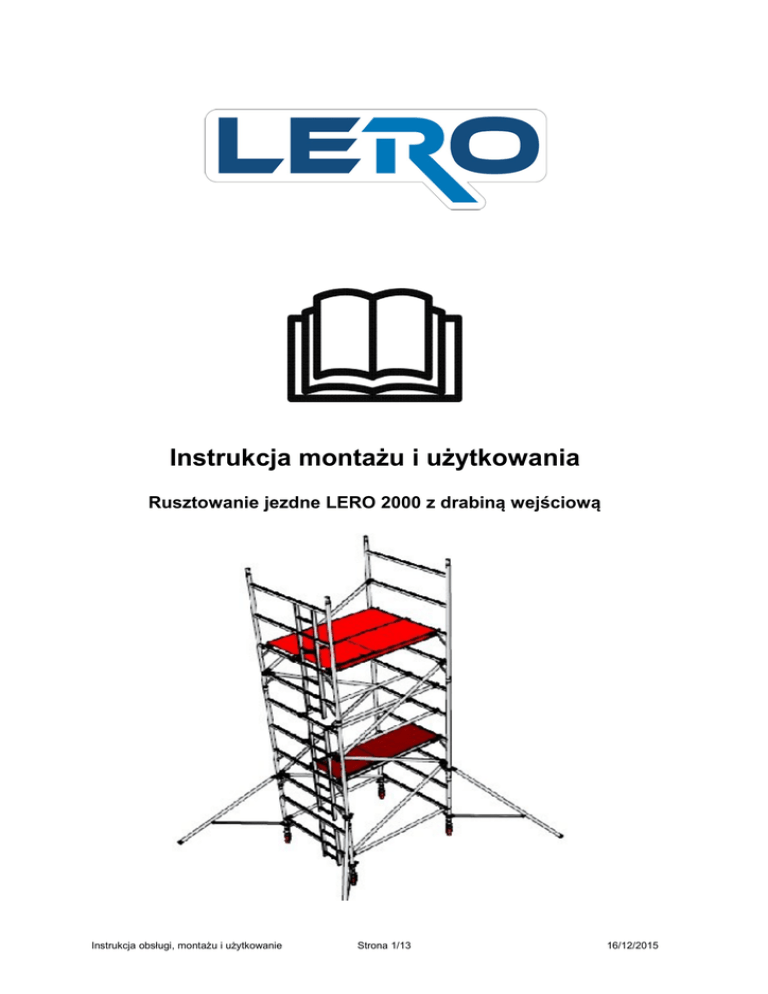 Instrukcja montażu i użytkowania Rusztowanie jezdne LERO 2000 z drabiną wejściową Instrukcja obsługi, montażu i użytkowanie Strona 1/13 16/12/2015 Copyright LERO © 2014 Wszelkie prawa zastrzeżone. Żaden fragment niniejszej publikacji nie może być powielany, przechowywany na automatycznym nośniku danych oraz rozpowszechniany w jakikolwiek sposób, zarówno metodą kserograficzną, elektroniczną bądź mechaniczną ani w jakikolwiek inny sposób bez wcześniejszej zgody LERO Lipno. Niniejsza publikacja przeznaczona jest wyłącznie dla produktów LERO. Wszelkie błędy w druku zastrzeżone. I Wstęp Niniejsza instrukcja jest przeznaczona wyłącznie do wykorzystania z konfiguracjami składanych i przejezdnych wież, zwanych dalej wieżą, opisanych w niniejszej instrukcji montażu i użytkowania, zwanej dalej instrukcją. Przed rozpoczęciem montażu wieży należy dokładnie przeczytać niniejszą instrukcję. Wieża powinna być zamontowana i używana zgodnie z instrukcją. Wszelkie zalecenia niniejszej instrukcji powinny być bezwzględnie przestrzegane. Nieprzestrzeganie zaleceń niniejszej instrukcji może prowadzić do wypadków podczas pracy. Firma Altrex nie może być pociągnięta do odpowiedzialności za jakiekolwiek straty powstałe podczas montażu, czy też użytkowania wieży LERO niezgodnego z instrukcją. Pracodawca, przełożony i użytkownik są odpowiedzialni za właściwe używanie wieży zgodne z niniejszą instrukcją oraz są zobligowani do udostępnienia instrukcji podczas trwania prac z użyciem wieży. II Uwagi ogólne Tabele konfiguracyjne zawarte w niniejszej instrukcji odnoszą się do wieży w standardowej konfiguracji. Wieże mogą być wyłącznie montowane, demontowane oraz modyfikowane pod nadzorem upoważnionej osoby i przez personel, który ukończył odpowiednie i szczegółowe szkolenie z zakresu danych prac, z uwzględnieniem specjalnego ryzyka w szczególności związanego z: • zrozumieniem montażu, demontażu lub planu przebudowy danej wieży; • bezpiecznym montażem, demontażem lub przebudową danej wieży; • środkami mającymi na celu uniknięcie zagrożeń dla pracowników i obiektów; • środkami bezpieczeństwa stosowanymi w przypadku zmiany warunków atmosferycznych, które mogłyby wpłynąć na bezpieczeństwo wieży; • dozwolonego obciążenia; • każdym innym ryzykiem, które mogłoby być wynikiem powyżej wspomnianego montażu, demontażu bądź przebudowy. Instrukcja obsługi, montażu i użytkowanie Strona 2/13 16/12/2015 Osoby odpowiedzialne za pracę oraz pracownicy wykonujący ją muszą mieć zapewniony dostępdo kopii tejże instrukcji. Tylko oryginalne części zamienne Altrex powinnybyć wykorzystywane podczas montażu. Maksymalna wysokość do pierwszego szczebla może wynosić 40 cm. Jeżeli wysokość ta jest większa niż 40 cm, obejma bądź podest są wymagane na pierwszym szczeblu. Standardowa konfiguracja wieży LERO spełnia przepisy europejskiej normy EN1004, grupa obciążeń 3 (w zakresie wytrzymałości i stabilności) oraz normy EN1298 (w zakresie instrukcji). Lokalne prawo i ustawodawstwo może zawierać dodatkowe przepisy do tych określonych w instrukcji. W miarę możliwości, i o ile może zostać to bezpiecznie zapewnione, dodatkowo dla własnego bezpieczeństwa monterzy powinni zabezpieczyć się poprzez połączenie ze stałą konstrukcją. Monterzy nie powinni zabezpieczać się poprzez połączenie z samą wieżą, chyba, że jest ona zakotwiona do ściany. II.I Użytkowanie Wieża LERO jest odpowiednia do pracy na wysokościach. Maksymalne obciążenie podestu wynosi 200 kg/m2. • Maksymalne obciążenie wieży (całościowo) wynosi 750 kg. • Przemieszczanie obciążeń przekraczających 30 kg w ramach prac wykonywanych na wieży jest zabronione. W przypadku znacznych obciążeń wieża powinna być zakotwiona do ściany. • Wieża może być użytkowana wyłącznie na poziomej, płaskiej i twardej powierzchni. • Użytkowanie wieży przy sile wiatru przekraczającej 14 m/s (maks. 6 stopni w skali Beauforta) jest zabronione. • Użytkowanie wieży podczas burzy, opadów śniegu, gradu, deszczu oraz wyładowań atmosferycznych jest zabronione. • Podnoszenie lub wciąganie wieży jest niedozwolone. • Wieża nie może być wykorzystywana do przedostawania się na inne konstrukcje. • Standardowe konfiguracje nie zostały skalkulowane z wykorzystaniem brezentu i/lub tablic reklamowych. • Wieża nie powinna ślizgać się ani przemieszczać, jeżeli nie było to zamierzone. Instrukcja obsługi, montażu i użytkowanie Strona 3/13 16/12/2015 II.II Dodatkowe wskazówki dotyczące użytkowania wież • Podczas pracy na wieżach należy nosić buty ochronne, rękawice robocze oraz kask ochrony. • Wchodzenie na wieżę od zewnątrz oraz stawanie na stężeniach jest zabronione. • Zabronione jest powiększanie wysokości roboczej wieży poprzez umieszczanie drabin, skrzynek itd. • Podstawowe parametry podestów nie powinny być w żaden sposób powiększane. • Używanie wysięgników na i do wieży jest niedozwolone; może to poważnie naruszyć stabilność. Części zamienne wież oraz narzędzia mogą być transportowane ręcznie z wykorzystaniem, na przykład, kosza i liny. • Jeżeli wieża wznoszona jest na miękkiej powierzchni, pod kółka powinny zostać podłożone podstawki zabezpieczające albo profile U. • Szczególną uwagę należy zwracać na siłę wiatru w miejscach narażonych na wiatr, na przykład w otwartych konstrukcjach i narożnikach budynków. W przypadku siły wiatru przekraczającej 14 m/s (maks. 6 stopni w skali Beauforta) oraz na zakończenie prac w danym dniu wieża przejezdna powinna zostać przemieszczona do bezwietrznego miejsca. • Żadne dodatkowe podesty robocze oraz inne przedmioty nie powinny być mocowane na zewnątrz standardowej wieży. • Umieszczanie pomostów pomiędzy wieżą, a budynkiem jest zabronione. • Mak