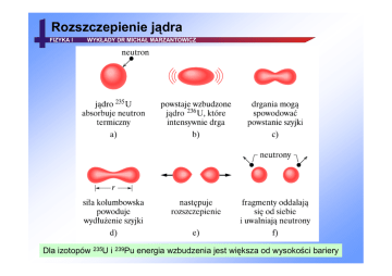 Rozszczepienie jądra Dla izotopów 235U i 239Pu energia wzbudzenia jest większa od wysokości bariery Reakcja łańcuchowa. Reaktor jądrowy U + n→ 236 U →140 Xe+ 94Sr + 2n 235 Izotopy nietrwałe (zawierają zbyt dużo neutronów) Wyzwalana energia około 200 MeV Problemy: -ucieczka neutronów z reaktora -neutrony z reakcji rozszczepienia są szybkie -wychwyt neutronów przez 238U Reaktor- bilans neutronów K - współczynnik mnożenia K= L. neutronów w danym pokoleniu L. neutronów w poprzednim pokoleniu K=1 – stan krytyczny K>1 – stan nadkrytyczny Masa krytyczna Reflektor neutronów Reaktor jądrowy - historia Reaktor w Chicago (1942) EBR – tzw. breeder (1951) Konwersja 238U do 239Pu Elektrownia z reaktorem ciśnieniowym PWR Bezpośredni obieg pary (BWR) Energetyka jądrowa http://www.npp.hu Synteza jądrowa (fuzja) Joint European Torus (JET) Bomba jądrowa (rozszczepienie) Mk-45 „Davy Crockett” na wyrzutni M-388 Bomba wodorowa (fuzja) Generator radioizotopowy RTG Sonda Voyager Rosyjskie RTG na złomowisku RTG i silnik Stirlinga Celka zawierająca 238Pu http://www.grc.nasa.gov/WWW/RT2002/5000/5490thieme.html