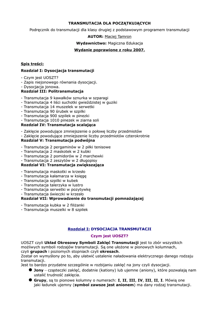 TRANSMUTACJA DLA POCZĄTKUJĄCYCH Podręcznik do transmutacji dla klasy drugiej z podstawowym programem transmutacji AUTOR: Maciej Tamron Wydawnictwo: Magiczna Edukacja Wydanie poprawione z roku 2007. Spis treści: Rozdział I: Dysocjacja transmutacji - Czym jest UOSZT? - Zapis niejonowego równania dysocjacji. - Dysocjacja jonowa. Rozdział III: Politransmutacja - Transmutacja 9 kawałków sznurka w szparagi - Transmutacja 4 liści suchotki gwieździstej w guziki - Transmutacja 14 muszelek w serwetki - Transmutacja 90 śrubek w szpilki - Transmutacja 900 szpilek w pinezki - Transmutacja 1010 pinezek w ziarna soli Rozdział IV: Transmutacja scalająca - Zaklęcie powodujące zmniejszenie o połowę liczby przedmiotów - Zaklęcie powodujące zmniejszenie liczby przedmiotów czterokrotnie Rozdział V: Transmutacja podwójna - Transmutacja 2 pergaminów w 2 piłki tenisowe - Transmutacja 2 maskotek w 2 kubki - Transmutacja 2 pomidorów w 2 marchewki - Transmutacja 2 zeszytów w 2 długopisy Rozdział VI: Transmutacja zwiększająca - Transmutacja maskotki w krzesło - Transmutacja kałamarza w księgę - Transmutacja szpilki w kubek - Transmutacja talerzyka w lustro - Transmutacja serwetki w pozytywkę - Transmutacja świeczki w krzesło Rozdział VII: Wprowadzenie do transmutacji pomnażającej - Transmutacja kubka w 2 filiżanki - Transmutacja muszelki w 8 szpilek Rozdział I: DYSOCJACJA TRANSMUTACJI Czym jest UOSZT? UOSZT czyli Układ Okresowy Symboli Zaklęć Transmutacji jest to zbór wszystkich możliwych symboli rodzajów transmutacji. Są one ułożone w pionowych kolumnach, czyli grupach i poziomych stopniach czyli okresach. Został on wymyślony po to, aby ułatwić ustalenie naładowania elektrycznego danego rodzaju transmutacji. Jest to bardzo przydatne szczególnie w rozbijaniu zaklęć na jony czyli dysocjacji. Jony – cząsteczki zaklęć, dodatnie (kationy) lub ujemne (aniony), które pozwalają nam ustalić trudność zaklęcia. Grupy, są to pionowe kolumny o numerach: I, II, III, IV, III, II, I. Mówią one jaki ładunek ujemny (symbol zawsze jest anionem) ma dany rodzaj transmutacji. Okresy, są to poziome układy symboli, mają one oznaczenia: A, B, C, D. Okresy mówią o kilku ważnych sprawach jak np.: masie symbolu (dokładniej o masach jego zaklęć), ale i o ilości iskier wystrzelających przy wkładaniu w zaklęcie zbyt dużej mocy. Zapis niejonowego równania dysocjacji Jak pamiętacie, istnieją równania reakcji transmutacji. Dotąd wiedzieliście tylko o istnieniu równań: 9 Kawałków Sznurka => 9 Szparagów Jednak istnieje jeszcze rodzaj zapisu równania, który nazywamy niejonowym równaniem dysocjacji. Otóż największa różnica między tym, a pierwotnym równaniem jest taka, że w naszym nowym nie występuje transmutant, a występują: symbol rodzaju transmutacji, zaklęcie i wynik transmutacji. Zapis jest bardzo prosty: Pl + Osterio => 1010 Ziaren Soli Wzór ogólny wygląda następująco: [symbol rodzaju] + [zaklęcie] => [wynik transmutacji] Przy tym zapisie zaklęć nie piszemy literami drukowanymi, a każdy wyraz wyniku z dużej litery. Dysocjacja jonowa Pl + Osterio => 1010 Ziaren Soli a) mamy już równanie, teraz musimy rozbić to na jony. Symbol zawsze jest ujemny, a więc możemy już dopisać ładowność tego symbolu (zwróćcie uwagę w jakiej grupie leży ten symbol): Pl 2- + Osterio => 1010 Ziaren Soli b) zaklęcie ma ładowność zawsze zależną od ilości swoich liter. Zaklęcia posiadające więcej niż 5 liter mają ładunek dodatni, a te, które mają mniej liter mają ładunek ujemny. Pl 2- + Osterio+ => 1010 Ziaren Soli c) prawie zawsze musimy dopisać czynnik stechiometryczny, czyli liczbę przed zaklęciem, symbolem etc. Dlaczego? Ponieważ zawsze, kiedy symbol jest ujemny i zaklęcie dodatnie (dysocjacja obojętna), wynik transmutacji musi mieć ładunek zerowy. Czyli plusów i minusów musi być tyle samo: Pl 2- + 2Osterio+ => 1010 Zairen Soli Rozdział II: POLITRANSMUTACJA Transmutacja 9 kawałków sznurka w szparagi Zaklęciem "Expresitos" Transmutacja 4 liści suchotki gwieździstej w guziki Zaklęciem "Antrospis" Transmutacja 14 muszelek w serwetki Zaklęciem "Inducas" Transmutacja 90 śrubek w szpilki Zaklęciem "Bespridusz" Transmutacja 900 szpilek w pinezki Zaklęciem "Zixuno" Transmutacja 1010 pinezek w ziarna soli Zaklęciem "Osterio" Rozdział III: TRANSMUTACJA SCALAJĄCA Zaklęcie powodujące zmniejszenie o połowę liczby przedmiotów HALBEIPO (czyt. Halbajpo) Zaklęcie powodujące zmniejszenie liczby przedmiotów czterokrotnie VIERTELEIPO (czyt. Firtelajpo) Rozdział IV: TRANSMUTACJA PODWÓJNA Transmutacja 2 pergaminów w 2 piłki tenisowe Zaklęciem "Mostruss" Transmutacja 2 maskotek w 2 kubki Zaklęciem "Stranubi" Transmutacja 2 pomidorów w 2 marchewki Zaklęciem "Nundu esteria" Transmutacja 2 zeszytów w 2 długopisy Zaklęciem "Wenda mimble" Rozdział V: TRANSMUTACJA ZWIĘKSZAJĄCA Transmutacja maskotki w krzesło Zaklęciem "Austteo" Transmutacja kałamarza w księgę Zaklęciem "Berito" Transmutacja szpilki w kubek Zaklęciem "Relivio" Transmutacja talerzyka w lustro Zaklęciem "Aggre aperium" Transmutacja serwetki w pozytywkę Zaklęciem "Banbando" Transmutacja świeczki w krzesło Zaklęciem "Armittero" Rozdział VI: WPROWADZENIE DO TRANSMUTACJI POMNAŻAJĄCEJ Transmutacja kubka w 2 filiżanki Zaklęciem "Eloyneat" Transmutacja muszelki w 8 szpilek Zaklęciem "Alister liviun" Autor podręcznika zastrzega sobie do niego całe prawo. Wszelkie kopiowanie i udostępnianie do publicznego użytku bez zgody autora jest ZABRONIONE! Autor podręcznika korzystał z materiałów: - "Podręcznika do transmutacji dla klas 1-4" autorstwa Anny Lancaster.