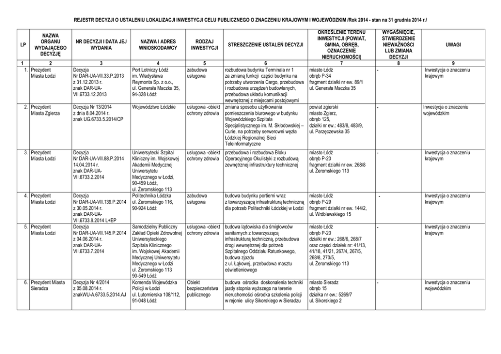 REJESTR DECYZJI O USTALENIU LOKALIZACJI INWESTYCJI CELU PUBLICZNEGO O ZNACZENIU KRAJOWYM I WOJEWÓDZKIM /Rok 2014 - stan na 31 grudnia 2014 r./ LP 1 NAZWA ORGANU WYDAJĄCEGO DECYZJĘ NR DECYZJI I DATA JEJ WYDANIA NAZWA I ADRES WNIOSKODAWCY RODZAJ INWESTYCJI STRESZCZENIE USTALEŃ DECYZJI UWAGI 3 Decyzja Nr DAR-UA-VII.33.P.2013 z 31.12.2013 r. znak DAR-UAVII.6733.12.2013 4 Port Lotniczy Łódź im. Władysława Reymonta Sp. z o.o., ul. Generała Maczka 35, 94-328 Łódź 2. Prezydent Miasta Zgierza Decyzja Nr 13/2014 z dnia 8.04.2014 r. znak UG.6733.5.2014/CP Województwo Łódzkie 3. Prezydent Miasta Łodzi Decyzja Nr DAR-UA-VII.88.P.2014 14.04.2014 r. znak DAR-UAVII.6733.2.2014 usługowa -obiekt przebudowa i rozbudowa Bloku ochrony zdrowia Operacyjnego Okulistyki z rozbudową zewnętrznej infrastruktury technicznej 4. Prezydent Miasta Łodzi Decyzja Nr DAR-UA-VII.139.P.2014 z 30.05.2014 r. znak DAR-UAVII.6733.8.2014 L+EP Decyzja Nr DAR-UA-VII.145.P.2014 z 04.06.2014 r. znak DAR-UAVII.6733.7.2014 Uniwersytecki Szpital Kliniczny im. Wojskowej Akademii Medycznej Uniwersytetu Medycznego w Łodzi, 90-459 Łódź, ul. Żeromskiego 113 Politechnika Łódzka ul. Żeromskiego 116, 90-924 Łódź Samodzielny Publiczny Zakład Opieki Zdrowotnej Uniwersyteckiego Szpitala Klinicznego im. Wojskowej Akademii Medycznej Uniwersytetu Medycznego w Łodzi ul. Żeromskiego 113 90-549 Łódź Komenda Wojewódzka Policji w Łodzi ul. Lutomierska 108/112, 91-048 Łódź usługowa -obiekt budowa lądowiska dla śmigłowców ochrony zdrowia sanitarnych z towarzyszącą infrastrukturą techniczną, przebudowa drogi wewnętrznej dla potrzeb Szpitalnego Oddziału Ratunkowego, budowa zjazdu z ul. Łąkowej, przebudowa masztu oświetleniowego miasto Łódź obręb P-20 działki nr ew.: 268/6, 268/7 oraz części działek nr: 41/13, 41/18, 41/21, 267/4, 267/5, 268/8, 270/5, ul. Żeromskiego 113 - Inwestycja o znaczeniu krajowym Obiekt bezpieczeństwa publicznego miasto Sieradz obręb 15 działka nr ew.: 5269/7 ul. Sikorskiego 2 - Inwestycja o znaczeniu wojewódzkim 6. Prezydent Miasta Sieradza Decyzja Nr 4/2014 z 05.08.2014 r. znakWU-A.6733.5.2014.AJ 6 rozbudowa budynku Terminala nr 1 za zmianą funkcji części budynku na potrzeby utworzenia Cargo, przebudowa i rozbudowa urządzeń budowlanych, przebudowa układu komunikacji wewnętrznej z miejscami postojowymi usługowa -obiekt zmiana sposobu użytkowania ochrony zdrowia pomieszczenia biurowego w budynku Wojewódzkiego Szpitala Specjalistycznego im. M. Skłodowskiej – Curie, na potrzeby serwerowni węzła Łódzkiej Regionalnej Sieci Teleinformatyczne WYGAŚNIĘCIE, STWIERDZENIE NIEWAŻNOŚCI LUB ZMIANA DECYZJI 8 2 1. Prezydent Miasta Łodzi 5. Prezydent Miasta Łodzi 5 zabudowa usługowa OKREŚLENIE TERENU INWESTYCJI (POWIAT, GMINA, OBRĘB, OZNACZENIE NIERUCHOMOŚCI) 7 miasto Łódź obręb P-34 fragment działki nr ew. 89/1 ul. Generała Maczka 35 zabudowa usługowa - powiat zgierski miasto Zgierz, obręb 125, działki nr ew.: 483/8, 483/9, ul. Parzęczewska 35 - miasto Łódź obręb P-20 fragment działki nr ew. 268/8 ul. Żeromskiego 113 - budowa ośrodka doskonalenia techniki jazdy stopnia wyższego na terenie nieruchomości ośrodka szkolenia policji w rejonie ulicy Sikorskiego w Sieradzu Inwestycja o znaczeniu wojewódzkim Inwestycja o znaczeniu krajowym - budowa budynku portierni wraz miasto Łódź z towarzyszącą infrastrukturą techniczną obręb P-29 dla potrzeb Politechniki Łódzkiej w Łodzi fragment działki nr ew. 144/2, ul. Wróblewskiego 15 9 Inwestycja o znaczeniu krajowym Inwestycja o znaczeniu krajowym 7. Prezydent Miasta Łodzi Decyzja Nr DAR-UA-VII.236.P.2014 z 19.09.2014 r. znak DAR-UAVII.6733.10.2014 8. Prezydent Miasta Łodzi Decyzja Nr DAR-UA-IX.280.P.2014 z 12.11.2014 r. znak DAR-UAIX.6733.6.2014 9. Prezydent Miasta Łodzi DECYZJA Nr DAR-UA-V. 301 .2014 z dnia 09.12.2014 znak DAR-UAV.6733.232.2014 Samodzielny Publiczny Zakład Opieki Zdrowotnej Uniwersyteckiego Szpitala Klinicznego im. Wojskowej Akademii Medycznej Uniwersytetu Medycznego w Łodzi ul. Żeromskiego 113, 90-549 Łódź Łódzki Oddział Wojewódzki Narodowego Funduszu Zdrowia ul. Kopcińskiego 58 90-032 Łódź usługowa -obiekt budowa budynku Regionalnego ochrony zdrowia Zintegrowanego Centrum Zabiegowego z zapleczem łóżkowym i diagnostycznym oraz na budowie/przebudowie towarzyszących tej inwestycji urządzeń budowlanych miasto Łódź obręb P-20 fragment działki nr ew.: 268/8, ul. Żeromskiego 113 - Inwestycja o znaczeniu krajowym zabudowa usługowa (administracyjno -biurowa) miasto Łódź obręb W-23 działka nr ew.:17/18, ul. Kopcińskiego 58 - Inwestycja o znaczeniu krajowym PGE Dystrybucja S.A. Oddział Łódź-Miasto ul. Tuwima 58, 90-021 Łódź infrastruktura techniczna miasto Łódź obręb P-2: działki 23/11, 1/5, 23/15, 23/12, 53/8, 24/9, obręb P-3: działki 88/1, 88/2 (dawniej dz.88), 89, 53/5, 53/7, 53/8, obręb P-4: działki 5/5,1/2 rejon ulic: Rąbieńskiej, Podchorążych i Złotno - Inwestycja o znaczeniu wojewódzkim przebudowa ze zmianą sposobu użytkowania części poddasza nieużytkowego na cele biurowe Łódzkiego Oddziału Wojewódzkiego Narodowego Funduszu Zdrowia budowa doziemnych linii kablowych wysokiego napięcia wraz z siecią światłowodową oraz niezbędną infrastrukturą w ramach zadania, pn.”Domknięcie Łódzkiego Ringu Energetycznego 110kV-Budowa linii kablowej 110kV. Etap II B”
