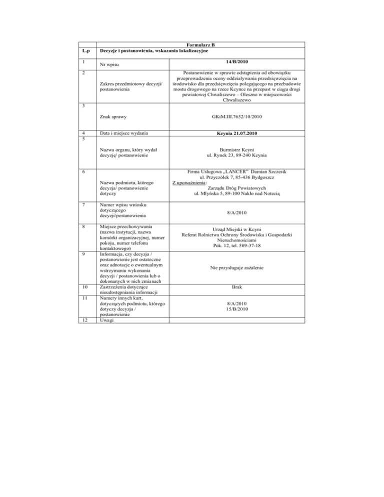 L.p 1 Formularz B Decyzje i postanowienia, wskazania lokalizacyjne Nr wpisu 2 Zakres przedmiotowy decyzji/ postanowienia 14/B/2010 Postanowienie w sprawie odstąpienia od obowiązku przeprowadzenia oceny oddziaływania przedsięwzięcia na środowisko dla przedsięwzięcia polegającego na przebudowie mostu drogowego na rzece Kcynce na przepust w ciągu drogi powiatowej Chwaliszewo – Oleszno w miejscowości Chwaliszewo 3 Znak sprawy 4 5 Data i miejsce wydania Nazwa organu, który wydał decyzję/ postanowienie 6 Nazwa podmiotu, którego decyzja/ postanowienie dotyczy 7 8 9 10 11 12 Numer wpisu wniosku dotyczącego decyzji/postanowienia Miejsce przechowywania (nazwa instytucji, nazwa komórki organizacyjnej, numer pokoju, numer telefonu kontaktowego) Informacja, czy decyzja / postanowienie jest ostateczne oraz adnotacje o ewentualnym wstrzymaniu wykonania decyzji / postanowienia lub o dokonanych w nich zmianach Zastrzeżenia dotyczące nieudostępniania informacji Numery innych kart, dotyczących podmiotu, którego dotyczy decyzja / postanowienie Uwagi GKiM.III.7632/10/2010 Kcynia 21.07.2010 Burmistrz Kcyni ul. Rynek 23, 89-240 Kcynia Firma Usługowa „LANCER” Damian Szczesik ul. Przyczółek 7, 85-436 Bydgoszcz Z upoważnienia: Zarządu Dróg Powiatowych ul. Młyńska 5, 89-100 Nakło nad Notecią 8/A/2010 Urząd Miejski w Kcyni Referat Rolnictwa Ochrony Środowiska i Gospodarki Nieruchomościami Pok. 12, tel. 589-37-18 Nie przysługuje zażalenie Brak 8/A/2010 15/B/2010