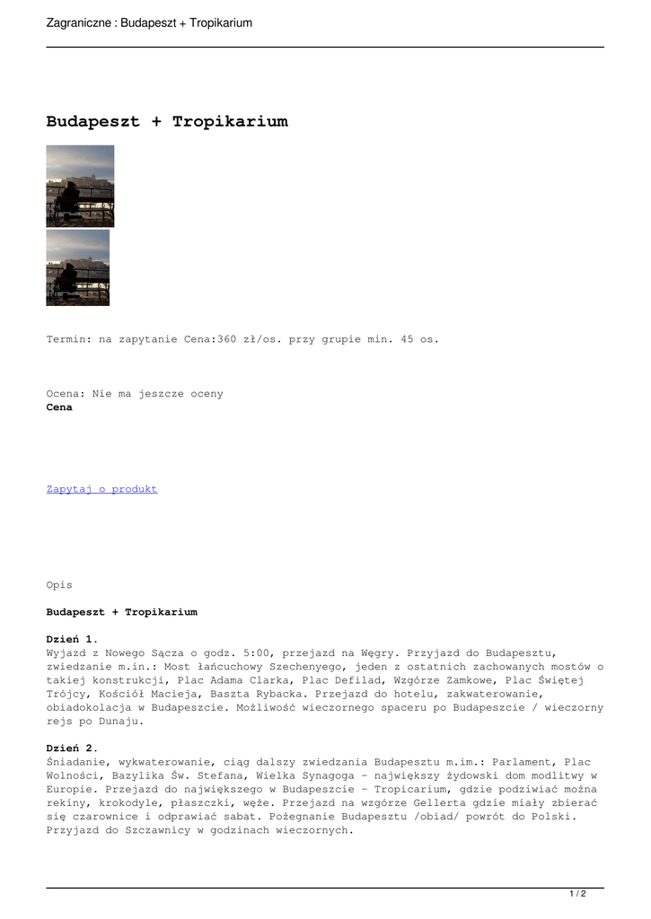 Zagraniczne : Budapeszt + Tropikarium Budapeszt + Tropikarium Termin: na zapytanie Cena:360 zł/os. przy grupie min. 45 os. Ocena: Nie ma jeszcze oceny Cena Zapytaj o produkt Opis Budapeszt + Tropikarium Dzień 1. Wyjazd z Nowego Sącza o godz. 5:00, przejazd na Węgry. Przyjazd do Budapesztu, zwiedzanie m.in.: Most łańcuchowy Szechenyego, jeden z ostatnich zachowanych mostów o takiej konstrukcji, Plac Adama Clarka, Plac Defilad, Wzgórze Zamkowe, Plac Świętej Trójcy, Kościół Macieja, Baszta Rybacka. Przejazd do hotelu, zakwaterowanie, obiadokolacja w Budapeszcie. Możliwość wieczornego spaceru po Budapeszcie / wieczorny rejs po Dunaju. Dzień 2. Śniadanie, wykwaterowanie, ciąg dalszy zwiedzania Budapesztu m.im.: Parlament, Plac Wolności, Bazylika Św. Stefana, Wielka Synagoga – największy żydowski dom modlitwy w Europie. Przejazd do największego w Budapeszcie – Tropicarium, gdzie podziwiać można rekiny, krokodyle, płaszczki, węże. Przejazd na wzgórze Gellerta gdzie miały zbierać się czarownice i odprawiać sabat. Pożegnanie Budapesztu /obiad/ powrót do Polski. Przyjazd do Szczawnicy w godzinach wieczornych. 1/2 Zagraniczne : Budapeszt + Tropikarium CENA: 360zł/grupa 45os Cena zawiera: przejazd autokarem Cafe Bar, DVD/Mp3, WC, Klimatyzacja; 1 nocleg w hotelu **/*** + wyżywienie HB (śniadanie i obiadokolacja ) opieka pilota/przewodnika; Obiad 10 euro ubezpieczenie KL, KR,NWI,NWS; bilety wstępu do: Tropicarium. Cena nie zawiera: - Rejs po Dunaju (opcjonalnie) 8 euro Na ewentualne dodatkowe wydatki związane z podróżą (np. toalet, pamiątki), prosimy przeznaczyć kwotę ok. 5.000HUF (ok. 65zl). Organizator wyjazdu zastrzega sobie prawo do zmian w programie zwiedzania, który może wyniknąć z indywidualnych życzeń grupy lub z niedostępności do tych miejsc. UWAGA! Wymagany dokument: tymczasowy dowód osobisty lub paszport. 2/2 Powered by TCPDF (www.tcpdf.org)