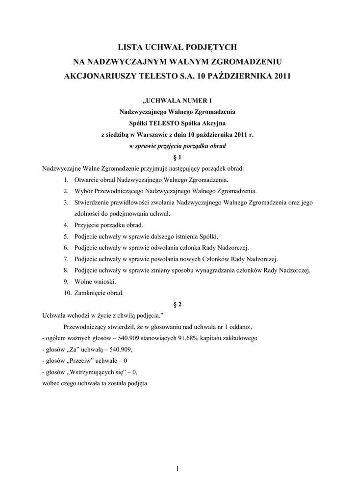 LISTA UCHWAŁ PODJĘTYCH NA NADZWYCZAJNYM WALNYM ZGROMADZENIU AKCJONARIUSZY TELESTO S.A. 10 PAŹDZIERNIKA 2011 „UCHWAŁA NUMER 1 Nadzwyczajnego Walnego Zgromadzenia Spółki TELESTO Spółka Akcyjna z siedzibą w Warszawie z dnia 10 października 2011 r. w sprawie przyjęcia porządku obrad §1 Nadzwyczajne Walne Zgromadzenie przyjmuje następujący porządek obrad: 1. Otwarcie obrad Nadzwyczajnego Walnego Zgromadzenia. 2. Wybór Przewodniczącego Nadzwyczajnego Walnego Zgromadzenia. 3. Stwierdzenie prawidłowości zwołania Nadzwyczajnego Walnego Zgromadzenia oraz jego zdolności do podejmowania uchwał. 4. Przyjęcie porządku obrad. 5. Podjecie uchwały w sprawie dalszego istnienia Spółki. 6. Podjęcie uchwały w sprawie odwołania członka Rady Nadzorczej. 7. Podjecie uchwały w sprawie powołania nowych Członków Rady Nadzorczej. 8. Podjęcie uchwały w sprawie zmiany sposobu wynagradzania członków Rady Nadzorczej. 9. Wolne wnioski. 10. Zamknięcie obrad. §2 Uchwała wchodzi w życie z chwilą podjęcia.” Przewodniczący stwierdził, że w głosowaniu nad uchwała nr 1 oddano:, - ogółem ważnych głosów – 540.909 stanowiących 91,68% kapitału zakładowego - głosów „Za” uchwałą – 540.909, - głosów „Przeciw” uchwale – 0 - głosów „Wstrzymujących się” – 0, wobec czego uchwała ta została podjęta. 1 „UCHWAŁA NUMER 2 Nadzwyczajnego Walnego Zgromadzenia Spółki TELESTO Spółka Akcyjna z siedzibą w Warszawie z dnia 10 października 2011 r. w sprawie podjęcia decyzji o dalszym istnieniu spółki Działając na podstawie art. 397 Kodeksu spółek handlowych, Nadzwyczajne Walne Zgromadzenie spółki TELESTO Spółka Akcyjna uchwala, co następuje: §1 W związku z treścią art. 397 Kodeksu spółek handlowych oraz faktem, iż z przedstawionej przez Zarząd sytuacji finansowej Spółki na dzień 30 czerwca 2011 wynika strata przewyższająca sumę kapitałów zapasowego i rezerwowych oraz 1/3 kapitału zakładowego, Nadzwyczajne Walne Zgromadzenie spółki TELESTO Spółka Akcyjna postanawia, iż Spółka będzie nadal istniała. Powyższa strata zostanie pokryta z zysków uzyskanych w przyszłych okresach. §2 Nadzwyczajne Walne Zgromadzenie spółki TELESTO Spółka Akcyjna przyjmuje do wiadomości i akceptuje, że spółka TELESTO Spółka Akcyjna rozpoczęła prowadzenie działalności gospodarczej pod koniec 2009 roku i w chwili obecnej wciąż znajduje się na etapie rozwoju, a w związku z tym zobowiązana jest ponosić dalsze koszty z tym związane. Nadzwyczajne Walne Zgromadzenie spółki TELESTO Spółka Akcyjna niniejszym postanawia o dalszym istnieniu Spółki w przypadku, gdyby kolejne bilanse spółki TELESTO Spółka Akcyjna wykazały stratę kwalifikującą zwołanie Walnego Zgromadzenia w trybie art. 397 Kodeksu spółek handlowych. §3 Uchwała wchodzi w życie z chwilą podjęcia.” Przewodniczący stwierdził, że w głosowaniu nad uchwała nr 2 oddano:, - ogółem ważnych głosów – 540.909 stanowiących 91,68% kapitału zakładowego - głosów „Za” uchwałą – 540.909, - głosów „Przeciw” uchwale – 0, - głosów „Wstrzymujących się” – 0, wobec czego uchwała ta została podjęta. 2 „UCHWAŁA NUMER 3 Nadzwyczajnego Walnego Zgromadzenia Spółki TELESTO Spółka Akcyjna z siedzibą w Warszawie z dnia 10 października 2011 r. w sprawie odwołania członka Rady Nadzorczej §1 Działając na podstawie § 21 Statutu Spółki, Nadzwyczajne Walne Zgromadzenie spółki TELESTO Spółka Akcyjna odwołuje pana Jerzego Klimkowskiego ze stanowiska członka Rady Nadzorczej. §2 Uchwała wchodzi w życie z chwilą podjęcia.” Przewodniczący stwierdził, że w głosowaniu tajnym nad uchwała nr 3 oddano:, - ogółem ważnych głosów – 540.909 stanowiących 91,68% kapitału zakładowego - głosów „Za” uchwałą – 540.909, - głosów „Przeciw” uchwale – 0, - głosów „Wstrzymujących się” – 0, wobec czego uchwała ta została podjęta. „UCHWAŁA NUMER 4 Nadzwyczajnego Walnego Zgromadzenia Spółki TELESTO Spółka Akcyjna z siedzibą w Warszawie z dnia 10 października 2011 r. w sprawie powołania nowego członka Rady Nadzorczej §1 Działając na podstawie § 21 Statutu Spółki Nadzwyczajne Walne Zgromadzenie spółki TELESTO Spółka Akcyjna powołuje nowego członka Rady Nadzorczej – pana Andrzeja Polkowskiego. §2 Uchwała wchodzi w życie z chwilą podjęcia.” Przewodniczący stwierdził, że w głosowaniu tajnym nad uchwała nr 4 oddano:, - ogółem ważnych głosów – 540.909 stanowiących 91,68% kapitału zakładowego - głosów „Za” uchwałą – 540.909, - głosów „Przeciw” uchwale – 0, - głosów „Wstrzymujących się” – 0, wobec czego uchwała ta została podjęta. 3 UCHWAŁA NUMER 5 Nadzwyczajnego Walnego Zgromadzenia Spółki TELESTO Spółka Akcyjna z siedzibą w Warszawie z dnia 10 października 2011 r. w sprawie powołania nowego członka Rady Nadzorczej §1 Działając na podstawie § 21 Statutu Spółki Nadzwyczajne Walne Zgromadzenie spółki TELESTO Spółka Akcyjna powołuje nowego członka Rady Nadzorczej – pana Włodzimierza Boguckiego. §2 Uchwała wchodzi w życie z chwilą podjęcia.” Przewodniczący stwierdził, że w głosowaniu tajnym nad uchwała nr 5 oddano:, - ogółem ważnych głosów – 540.909 stanowiących 91,68% kapitału zakładowego - głosów „Za” uchwałą – 540.909, - głosów „Przeciw” uchwale – 0, - głosów „Wstrzymujących się” – 0, wobec czego uchwała ta została podjęta. „UCHWAŁA NUMER 6 Nadzwyczajnego Walnego Zgromadzenia Spółki TELESTO Spółka Akcyjna z siedzibą w Warszawie z dnia 10 października 2011 r. w sprawie zmiany sposobu wynagradzania członków Rady Nadzorczej §1 Działając na podstawie § 28 ust. 4 Statutu Spółki, Nadzwyczajne Walne Zgromadzenie spółki TELESTO Spółka Akcyjna postanawia zmienić sposób wynagradzania członków Rady Nadzorczej, w ten sposób,
