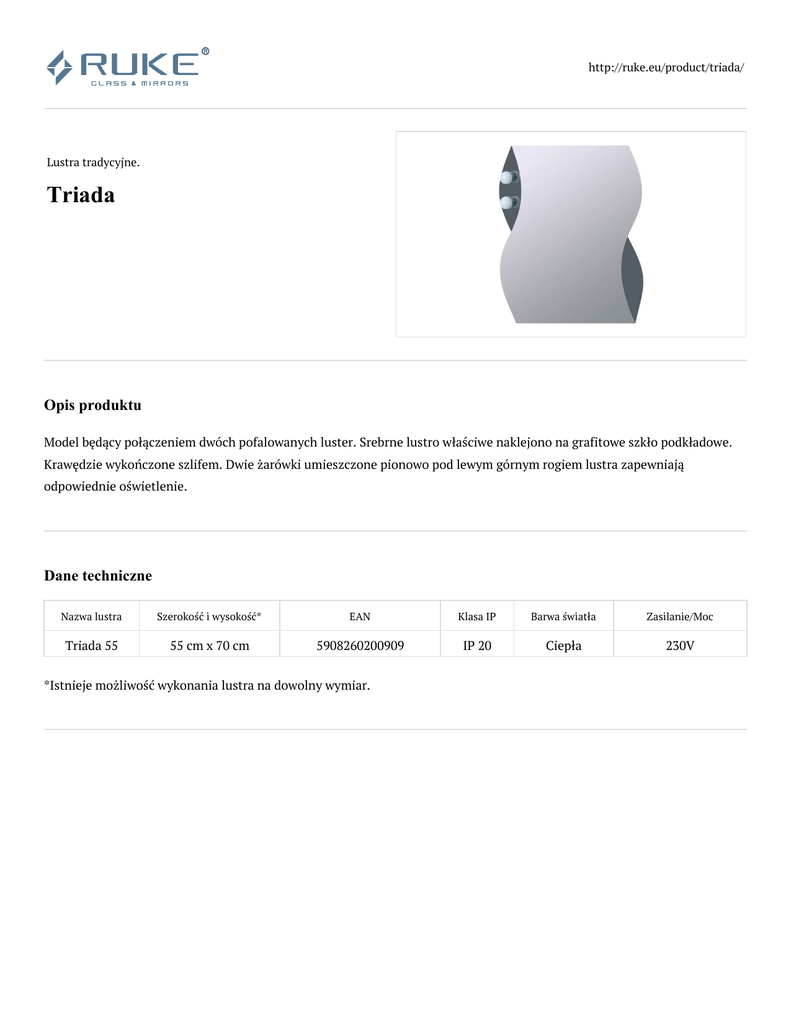 http://ruke.eu/product/triada/ Lustra tradycyjne. Triada Opis produktu Model będący połączeniem dwóch pofalowanych luster. Srebrne lustro właściwe naklejono na grafitowe szkło podkładowe. Krawędzie wykończone szlifem. Dwie żarówki umieszczone pionowo pod lewym górnym rogiem lustra zapewniają odpowiednie oświetlenie. Dane techniczne Nazwa lustra Szerokość i wysokość* EAN Klasa IP Barwa światła Zasilanie/Moc Triada 55 55 cm x 70 cm 5908260200909 IP 20 Ciepła 230V *Istnieje możliwość wykonania lustra na dowolny wymiar.