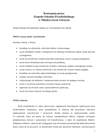 Koncepcja pracy Zespołu Szkolno-Przedszkolnego w Międzyrzeczu Górnym Zespół Szkolno-Przedszkolny składa się z Przedszkola oraz Szkoły MISJA naszej szkoły i przedszkola Jesteśmy szkołą, w której: kształtuje się obywatela, człowieka dobrze wychowanego, uczeń zdobędzie wiedzę i umiejętności do dalszego kształcenia, będzie umiał sprostać wymaganiom, uczeń ma możliwości znaleźć potrzebne informacje, nawet z pomocą komputera, uczeń może demokratycznie rozwiązywać problemy, uczeń rozbudzi swoją wrażliwość na dobro, tolerancję i piękno otaczającego świata, uczeń uwierzy we własne możliwości i ma możliwość wyrazić własne poglądy, kształtuje się człowieka odpowiedzialnego za swoje postępowanie, szanuje się prawa każdego człowieka, wykorzystuje się zdolności i zainteresowania uczniów do pełnego rozwoju, uczeń w życzliwej atmosferze rozwinie własną osobowość, zapewnia się równość szans i sprawiedliwość społeczną, uczeń ma szanse nauczyć się innego języka. WIZJA dziecka Wiek przedszkolny to okres pierwszych, regularnych doświadczeń społecznych poza środowiskiem rodzinnym, okres przedszkolny to matryca dla przyszłych sukcesów edukacyjnych, zawodowych i życiowych. Każde dziecko to niepowtarzalna osoba. To człowiek, który ma prawo do wyboru, samodzielnych odkryć, szukania rozwiązań, podejmowania decyzji i ponoszenia ich konsekwencji, a także do popełniania błędów. Zadaniem rodziców, nauczycieli i pedagogów jest stwarzanie przestrzeni dla takiej aktywności dzieci, która da im poczucie, że poznawanie świata jest procesem radosnym i przynoszącym 1 satysfakcję. Stałym zadaniem przedszkola jest tworzenie warunków do optymalnego rozwoju emocjonalnego i społecznego dzieci. Oznacza to, że nauczyciel uwzględnia indywidualność dziecka, rozpoznaje i zaspokaja jego potrzeby emocjonalne i społeczne, tworzy warunki do dobrej adaptacji, uznaje, że współpraca z rodzicami jest podstawą dobrego funkcjonowania dziecka w przedszkolu. Dziecko w oparciu o tę koncepcję programową: Czuje się bezpieczne i ma zaufanie do świata, co jest podstawą do nawiązywania więzi z osobami dorosłymi i rówieśnikami. Jest aktywne, dąży do poznawania świata, jest inicjatorem różnorodnych działań. Rozwija w sobie umiejętności współżycia z innymi osobami – dorosłymi i dziećmi. Jest samodzielne. Ma potencjał do radzenia sobie z trudnymi sytuacjami. Wzrasta w klimacie akceptacji, uznania, bezpieczeństwa i miłości. WIZJA ABSOLWENTA Absolwent naszego przedszkola na miarę swego wieku i potencjału rozwojowego jest: Ciekawy świata, samodzielny, zaradny, co oznacza, że: często zadaje pytania chcąc zaspokoić swoją ciekawość przejawia aktywność podejmując różne samodzielne zadania osiągnął optymalny dla swego potencjału rozwojowego poziom wiedzy, umiejętności, kompetencji. umie słuchać siebie i innych ma poczucie własnej wartości jest krytyczny wobec siebie i innych odróżnia fikcję od świata realnego Rozważny, odpowiedzialny, co oznacza, że: dba o swe zdrowie, higienę osobistą, wygląd, unika zagrożeń zna i respektuje własne prawa i obowiązki w grupie i w rodzinie pamięta, że jego prawa kończą się tam, gdzie zaczynają się prawa innych osób zdaje sobie sprawę z konsekwencji różnych zachowań własnych i innych osób 2 Uczciwy, prawdomówny, co oznacza, że: szanuje własność swoją i cudzą nie kłamie umie rozróżnić dobro i zło, jest wrażliwy i opiekuńczy Taktowny, szanujący innych, co oznacza, że: zna i stosuje obowiązujące normy kulturalnego zachowania, społecznie akceptowane nie używa wulgarnych słów, szanuje innych ludzi, ich odmienność /np. niepełnosprawność/ zna i szanuje uniwersalne wartości życiowe. Absolwent szkoły podstawowej umie: poprawnie posługiwać się językiem polskim a także językiem obcym w zakresie podstawowym, uczyć się samodzielnie, organizować i oceniać swoją pracę, korzystać z różnych źródeł informacji, prezentować swoje zdanie i umieć szanować poglądy innych, efektywnie pracować w zespole, wykorzystać w praktyce zdobytą wiedzę, cechować się kulturą osobistą, odznaczać się wrażliwością na piękno otaczającego świata, posiadać wiedzę i umiejętności niezbędne do dalszej nauki. Zespół Szkolno-Przedszkolny realizując wizję i misję: - wspiera rodzinę w procesie wychowania i nauczania, stwarza wychowankom optymalne warunki do prawidłowego, wszechstronnego rozwoju w poczuciu bezpieczeństwa, - pełni funkcje opiekuńcze, wychowawcze i kształcące, - wspomaga wszechstronny rozwój dziecka odpowiednio do jego indywidualnych potrzeb i możliwości, - tworzy bezpieczne warunki do wspólnej zabawy i nauki, 3 - promuje dbanie o zdrowie i zachowania przyjazne przyrodzie, - buduje poczucie tożsamości regionalnej i narodowej, - rozwija kompetencje społeczne, a także uczy odróżniania dobra od zła. Pełni również funkcję doradczą i wspierającą działania wychowawcze wobec rodziców. Obszar kształcenia Zespół Szkolno-Przedszkolny stwarza warunki do wszechstronnego rozwoju dzieci, na miarę ich potrzeb i możliwości. Zatrudnia kadrę pedagogiczną mającą wysokie kwalifikacje pedagogiczne, a także kwalifikacje specjalistyczne: psychologa, logopedę, pedagoga, oligofrenopedagoga, tyflopedagoga i surdopedagoga. Pomoc psychologiczno – pedagogiczna jest organizowana w formie: - zajęć specjalistycznych: korekcyjno – kompensacyjnych, logopedycznych oraz innych zajęć o charakterze terapeutycznym, - porad, konsultacji i warsztatów dla rodziców i nauczycieli, - tworzenie zespołów i współpraca nauczycieli. Zarządzanie i organizacja Corocznie jest przygotowywany plan nadzoru pedagogicznego. Wnioski wynikające z nadzoru służą do podejmowania odpowiednich działań na następny rok szkolny. Każdego roku w naszej placówce jest przeprowadzana ewaluacja. W tym c