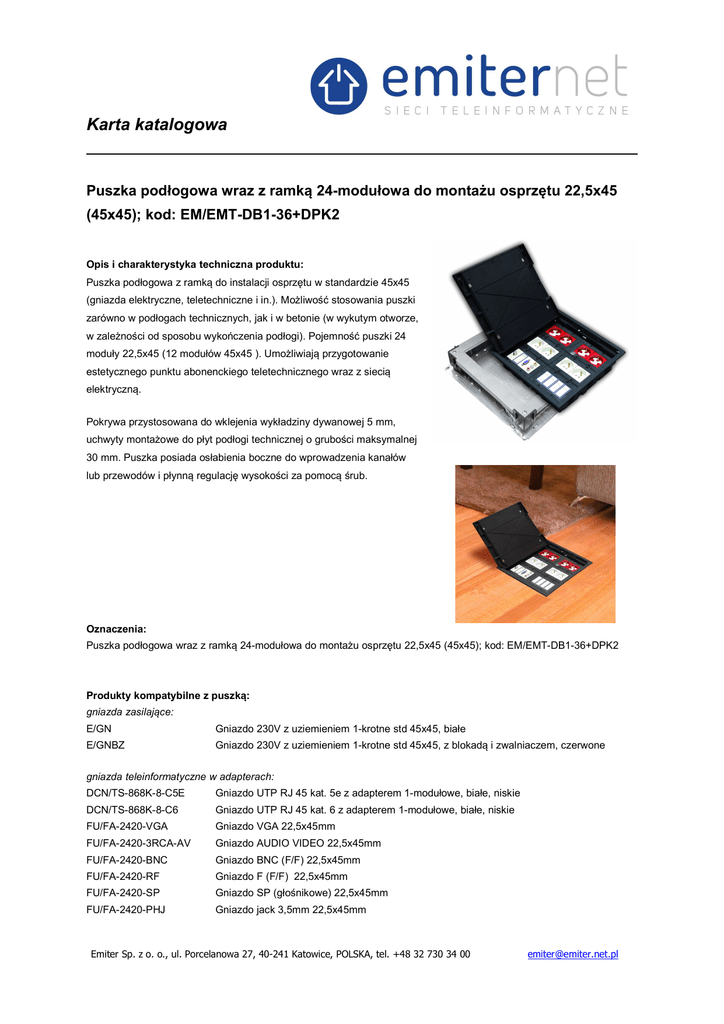 Karta katalogowa Puszka podłogowa wraz z ramką 24-modułowa do montażu osprzętu 22,5x45 (45x45); kod: EM/EMT-DB1-36+DPK2 Opis i charakterystyka techniczna produktu: Puszka podłogowa z ramką do instalacji osprzętu w standardzie 45x45 (gniazda elektryczne, teletechniczne i in.). Możliwość stosowania puszki zarówno w podłogach technicznych, jak i w betonie (w wykutym otworze, w zależności od sposobu wykończenia podłogi). Pojemność puszki 24 moduły 22,5x45 (12 modułów 45x45 ). Umożliwiają przygotowanie estetycznego punktu abonenckiego teletechnicznego wraz z siecią elektryczną. Pokrywa przystosowana do wklejenia wykładziny dywanowej 5 mm, uchwyty montażowe do płyt podłogi technicznej o grubości maksymalnej 30 mm. Puszka posiada osłabienia boczne do wprowadzenia kanałów lub przewodów i płynną regulację wysokości za pomocą śrub. Oznaczenia: Puszka podłogowa wraz z ramką 24-modułowa do montażu osprzętu 22,5x45 (45x45); kod: EM/EMT-DB1-36+DPK2 Produkty kompatybilne z puszką: gniazda zasilające: E/GN Gniazdo 230V z uziemieniem 1-krotne std 45x45, białe E/GNBZ Gniazdo 230V z uziemieniem 1-krotne std 45x45, z blokadą i zwalniaczem, czerwone gniazda teleinformatyczne w adapterach: DCN/TS-868K-8-C5E Gniazdo UTP RJ 45 kat. 5e z adapterem 1-modułowe, białe, niskie DCN/TS-868K-8-C6 Gniazdo UTP RJ 45 kat. 6 z adapterem 1-modułowe, białe, niskie FU/FA-2420-VGA Gniazdo VGA 22,5x45mm FU/FA-2420-3RCA-AV Gniazdo AUDIO VIDEO 22,5x45mm FU/FA-2420-BNC Gniazdo BNC (F/F) 22,5x45mm FU/FA-2420-RF Gniazdo F (F/F) 22,5x45mm FU/FA-2420-SP Gniazdo SP (głośnikowe) 22,5x45mm FU/FA-2420-PHJ Gniazdo jack 3,5mm 22,5x45mm Emiter Sp. z o. o., ul. Porcelanowa 27, 40-241 Katowice, POLSKA, tel. +48 32 730 34 00 [email protected] Karta katalogowa adaptery: DC/SIP-30AIN2 EM/RW-DATA-1 EM/RW-DATA-2 DC/FA-644-1SP FU/FA-644-1SP DC/FA-644-2SP FU/FA-644-9MP FU/FA-644-8MP Adapter dwumodułowy kątowy 45x45mm dla 2xRJ45 lub 2xRJ12 do gniazd kat. 6A beznarzędziowych Adapter dwumodułowy pojedynczy kątowy 1xRJ45 Adapter dwumodułowy podwójny kątowy 2xRJ45 Adapter jednomodułowy prosty 22,5x45mm dla 1xRJ45 lub 1xRJ 12 Adapter jednomodułowy prosty 22,5x45mm dla 1xRJ45 lub 1xRJ 12 do gniazd kat. 6A narzędziowych Adapter dwumodułowy prosty 45x45mm dla 1xRJ45 lub 1xRJ 12 Adapter 45x45 1xRJ45,12 biały Adapter 45x45 2xRJ45,12, biały Uwaga: Zaleca się montaż gniazd keystone w adapterach kątowych (d0tyczy gniazd keystone kompatybilnych z tego typu adapterem); Ze względu na różną głębokość gniazd oraz różne sposoby doprowadzenia i podłączenia przewodów, niektóre gniazda keystone montowane w adapterach, jak również niektóre gniazda w adapterach, mogą nie być kompatybilne. Ze względu na możliwość wystąpienia różnych kombinacji zaleca się przed instalacją sprawdzenie lub kontakt z dz.technicznym. Parametry techniczne: Mechaniczne: Puszka montażowa: wykonanie: stal, tworzywo sztuczne kolor - naturalny, czarny wymiary (dług x szer): 360X360 mm głębokość regulowana w zakresie: gł. 50-90 mm masa 2,85 kg Ramka: wykonanie: tworzywo sztuczne kolor – czarny wymiary (dług x szer x gł): 270X270x75 mm masa 1,40 kg stopień ochrony: IP 4x odporność udarowa: IK08 Wymiary otworu w podłodze technicznej pod samą ramkę: min. 255x255 mm Certyfikaty: Deklaracja Zgodnosci Nr 02/01/2013 W przypadku wątpliwości dotyczących zastosowania lub montażu prosimy o kontakt z naszym Działem Technicznym. Emiter Sp. z o. o., ul. Porcelanowa 27, 40-241 Katowice, POLSKA, tel. +48 32 730 34 00 [email protected] Karta katalogowa Uwaga: Produkt przeznaczony do podłóg niepalnych i pustych (typ H) dla zabiegów podłogowych na sucho. Produkt przeznaczony do montażu w miejscach, w których zostanie wykorzystana jego funkcjonalność i zastosowanie. Z tego powodu nie należy projektować montażu puszki podłogowej w ciągach komunikacyjnych oraz miejscach, w których stanowić będą utrudnienie lub przeszkodę dla poruszających się osób. W zależności od typu oraz ilości kabli i przewodów przyłączeniowych wpinanych do montowanych w puszce gniazd pokrywa może, ale nie musi się domykać w pełni. Odpowiednia funkcjonalność, wynikająca z cech produktu, powinna zostać przewidziana przez projektanta na etapie projektu. Dołożyliśmy wszelkich starań, aby przedstawione informacje były rzetelne i kompletne. Jednak nie ponosimy odpowiedzialności za dokładność i kompletność danych oraz w szczególności nie możemy zagwarantować, że niniejsza specyfikacja nie zawiera błędów lub pomyłek. Informacje zawarte w niniejszej specyfikacji mogą zostać zmienione w każdej chwili bez powiadomienia. Emiter Sp. z o. o., ul. Porcelanowa 27, 40-241 Katowice, POLSKA, tel. +48 32 730 34 00 [email protected]