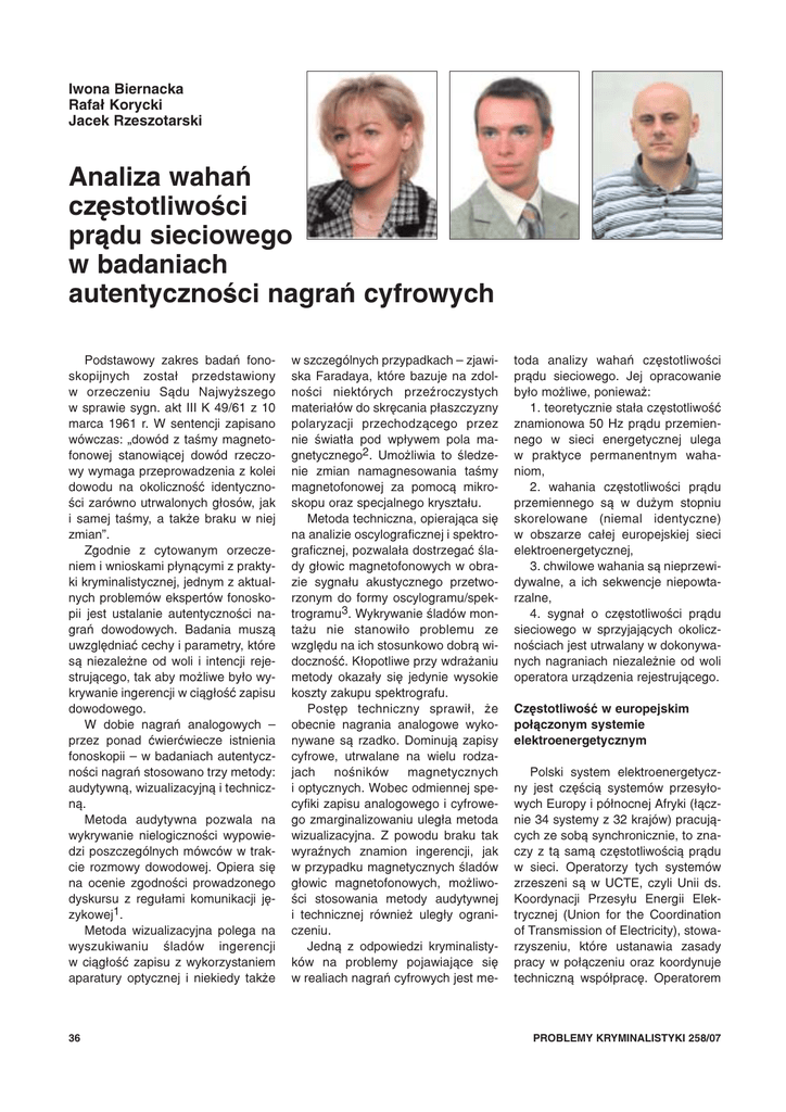 Iwona Biernacka Rafa³ Korycki Jacek Rzeszotarski Analiza wahañ czêstotliwoœci pr¹du sieciowego w badaniach autentycznoœci nagrañ cyfrowych Podstawowy zakres badañ fonoskopijnych zosta³ przedstawiony w orzeczeniu S¹du Najwy¿szego w sprawie sygn. akt III K 49/61 z 10 marca 1961 r. W sentencji zapisano wówczas: „dowód z taœmy magnetofonowej stanowi¹cej dowód rzeczowy wymaga przeprowadzenia z kolei dowodu na okolicznoœæ identycznoœci zarówno utrwalonych g³osów, jak i samej taœmy, a tak¿e braku w niej zmian”. Zgodnie z cytowanym orzeczeniem i wnioskami p³yn¹cymi z praktyki kryminalistycznej, jednym z aktualnych problemów ekspertów fonoskopii jest ustalanie autentycznoœci nagrañ dowodowych. Badania musz¹ uwzglêdniaæ cechy i parametry, które s¹ niezale¿ne od woli i intencji rejestruj¹cego, tak aby mo¿liwe by³o wykrywanie ingerencji w ci¹g³oœæ zapisu dowodowego. W dobie nagrañ analogowych – przez ponad æwieræwiecze istnienia fonoskopii – w badaniach autentycznoœci nagrañ stosowano trzy metody: audytywn¹, wizualizacyjn¹ i techniczn¹. Metoda audytywna pozwala na wykrywanie nielogicznoœci wypowiedzi poszczególnych mówców w trakcie rozmowy dowodowej. Opiera siê na ocenie zgodnoœci prowadzonego dyskursu z regu³ami komunikacji jêzykowej1. Metoda wizualizacyjna polega na wyszukiwaniu œladów ingerencji w ci¹g³oœæ zapisu z wykorzystaniem aparatury optycznej i niekiedy tak¿e 36 w szczególnych przypadkach – zjawiska Faradaya, które bazuje na zdolnoœci niektórych przeŸroczystych materia³ów do skrêcania p³aszczyzny polaryzacji przechodz¹cego przez nie œwiat³a pod wp³ywem pola magnetycznego2. Umo¿liwia to œledzenie zmian namagnesowania taœmy magnetofonowej za pomoc¹ mikroskopu oraz specjalnego kryszta³u. Metoda techniczna, opieraj¹ca siê na analizie oscylograficznej i spektrograficznej, pozwala³a dostrzegaæ œlady g³owic magnetofonowych w obrazie sygna³u akustycznego przetworzonym do formy oscylogramu/spektrogramu3. Wykrywanie œladów monta¿u nie stanowi³o problemu ze wzglêdu na ich stosunkowo dobr¹ widocznoœæ. K³opotliwe przy wdra¿aniu metody okaza³y siê jedynie wysokie koszty zakupu spektrografu. Postêp techniczny sprawi³, ¿e obecnie nagrania analogowe wykonywane s¹ rzadko. Dominuj¹ zapisy cyfrowe, utrwalane na wielu rodzajach noœników magnetycznych i optycznych. Wobec odmiennej specyfiki zapisu analogowego i cyfrowego zmarginalizowaniu uleg³a metoda wizualizacyjna. Z powodu braku tak wyraŸnych znamion ingerencji, jak w przypadku magnetycznych œladów g³owic magnetofonowych, mo¿liwoœci stosowania metody audytywnej i technicznej równie¿ uleg³y ograniczeniu. Jedn¹ z odpowiedzi kryminalistyków na problemy pojawiaj¹ce siê w realiach nagrañ cyfrowych jest me- toda analizy wahañ czêstotliwoœci pr¹du sieciowego. Jej opracowanie by³o mo¿liwe, poniewa¿: 1. teoretycznie sta³a czêstotliwoœæ znamionowa 50 Hz pr¹du przemiennego w sieci energetycznej ulega w praktyce permanentnym wahaniom, 2. wahania czêstotliwoœci pr¹du przemiennego s¹ w du¿ym stopniu skorelowane (niemal identyczne) w obszarze ca³ej europejskiej sieci elektroenergetycznej, 3. chwilowe wahania s¹ nieprzewidywalne, a ich sekwencje niepowtarzalne, 4. sygna³ o czêstotliwoœci pr¹du sieciowego w sprzyjaj¹cych okolicznoœciach jest utrwalany w dokonywanych nagraniach niezale¿nie od woli operatora urz¹dzenia rejestruj¹cego. Czêstotliwoœæ w europejskim po³¹czonym systemie elektroenergetycznym Polski system elektroenergetyczny jest czêœci¹ systemów przesy³owych Europy i pó³nocnej Afryki (³¹cznie 34 systemy z 32 krajów) pracuj¹cych ze sob¹ synchronicznie, to znaczy z t¹ sam¹ czêstotliwoœci¹ pr¹du w sieci. Operatorzy tych systemów zrzeszeni s¹ w UCTE, czyli Unii ds. Koordynacji Przesy³u Energii Elektrycznej (Union for the Coordination of Transmission of Electricity), stowarzyszeniu, które ustanawia zasady pracy w po³¹czeniu oraz koordynuje techniczn¹ wspó³pracê. Operatorem PROBLEMY KRYMINALISTYKI 258/07 systemu przesy³owego w Polsce jest PSE-Operator S.A. (www.pseoperator.pl). od wartoœci zadanej – w górê, jeœli w systemie jest nadmiar mocy wyprodukowanej, lub w dó³, jeœli zapotrze- trzebowania (od³¹czenie du¿ego odbiorcy) czêstotliwoœæ w sieci gwa³townie spada lub roœnie. Przywrócenie jej do wartoœci zadanej za pomoc¹ uruchomienia (automatycznego i/lub rêcznego) rezerw mocy nale¿y do operatora, w którego obszarze dosz³o do takiego zak³ócenia. Odchylenia czêstotliwoœci s¹ w sposób ci¹g³y monitorowane – obliczana jest œrednia wartoœæ czêstotliwoœci oraz odchylenie miêdzy czasem synchronicznym, który jest wyznaczony na podstawie czêstotliwoœci systemowej, a czasem rzeczywistym (czasem uniwersalnym, UTC). Na podstawie pomiarów czêstotliwoœci w cyklu jednosekundowym obliczany jest rozk³ad statystyczny wartoœci dla piêtnastominutowych przedzia³ów czasu – odchylenie standardowe σ, wed³ug wzoru: σ = Ryc. 1. Krajowy system elektroenergetyczny a obszary synchroniczne w Europie Fig. 1. National electric energy system and synchronous areas in Europe 1 n − 1∑i =1 ( f i − f 0 ) 2 n gdzie: Czêstotliwoœæ jest najwa¿niejszym parametrem pracy systemów, jedyn¹ wielkoœci¹ wspóln¹ dla wszystkich obszarów strefy wspó³pracy synchronicznej. Zgodnie z zasadami prowadzenia ruchu po³¹czonych systemów elektroenergetycznych4, w warunkach pracy normalnej, czêstotliwoœæ musi byæ utrzymywana w œcis³ych granicach z uwagi na bezpieczeñstwo ich pracy. Poza okresami korekty czasu synchronicznego zadana wartoœæ czêstotliwoœci w systemach UCTE wynosi 50 Hz. Odchylenie czêstotliwoœci od wartoœci zadanej spowodowane jest ró¿nic¹ miêdzy obci¹¿eniem systemu (zapotrzebowanie odbiorców) a wytwarzaniem energii elektrycznej w elektrowniach. Energia elektryczna w systemie elektroenergetycznym nie mo¿e byæ magazynowana, dl