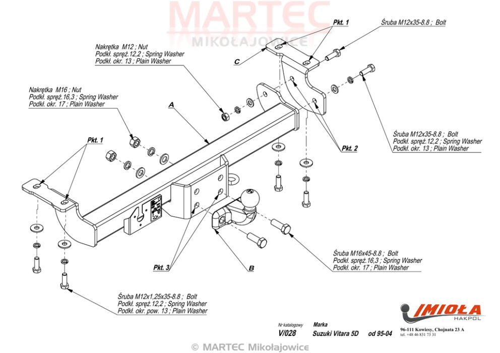 Pkt. 1 Nakrętka M12 ; Nut Podkł. spręż.12,2 ; Spring Washer Podkł. okr. 13 ; Plain Washer Nakrętka M16 ; Nut Podkł. spręż.16,3 ; Spring Washer Podkł. okr. 17 ; Plain Washer Śruba M12x35-8.8 ; Bolt C A Pkt. 1 Śruba M12x35-8.8 ; Bolt Podkł. spręż.12,2 ; Spring Washer Podkł. okr. 13 ; Plain Washer Pkt. 2 Pkt. 3 Śruba M16x45-8.8 ; Bolt Podkł. spręż.16,3 ; Spring Washer Podkł. okr. 17 ; Plain Washer B Śruba M12x1,25x35-8.8 ; Bolt Podkł. spręż.12,2 ; Spring Washer Podkł. okr. pow. 13 ; Plain Washer Nr katalogowy V/028 © MARTEC Mikołajowice Marka Suzuki Vitara 5D od 95-04 96-111 Kowiesy, Chojnata 23 A tel. +48 46 831 73 31 ZESTAW ŚRUBOWY: FASTENING MEANS: Gniazdo 7-biegunowe 12V z ruchomymi bolcami Symbol SWW 1135-812 Oznaczenie zacisku 31 L R 54 58L 58R + Zacisk do łączenia przewodów do masy pojazdu do świateł kierunku jazdy lewych do świateł kierunku jazdy prawych do świateł hamowania do świateł pozycyjnych lewych do świateł pozycyjnych prawych tylne światła przeciwmgłowe Moment skręcający dla śrub i nakrętek (8.8) Torgue settings for nuts and bolts (8.8) M8 25 Nm M12 M10 55 Nm M14 M16 195 Nm Kolory Biały , white śółty , yellow zielony, green czerwony, red czarny, black brązowy, brown niebieski , blue -M16x45 8.8 2szt 2szt -M12x35 8.8 -M12x35x1,25 4szt SUZUKI VITARA 5D 95 - 04 NO CAT.V/028 INSTRUKCJA MONTAśU: FITTING INSTRUCTION: • • • • 2szt 6szt 2szt 6szt -M16 -M12 2szt 1szt 85 Nm 135 Nm • • • • -M16 -M12 -M16 -M12 Odkręcić ucho holownicze (nie będzie juŜ wykorzystane). Do prawej podłuŜnicy przykręcić element C śrubami M12x1,25x35 8.8 (pkt 1). Do lewej podłuŜnicy przykręcić belkę haka A śrubami M12x1,25x35 8.8 (pkt 1) oraz do elementu C śrubami M12x35 8.8 (pkt 2). Dokręcić kulę i blachę gniazda elektrycznego śrubami M16x45 8.8 (pkt 3). Dokręcić wszystkie śruby z momentem wg tabeli. Podłączyć instalację elektryczną. • • • • © MARTEC Mikołajowice Unscrew the towing eye (it will not be used any more). Screw the element C to the right metal clamp with bolts M12x35x1,25 8.8 (point 1). Screw the main bar A to the left metal clamp with bolts M12x1,25x35 8.8 (point 1) and to the element C with bolts M12x35 8.8 (point 2). Fix the ball and electric plate with bolts M16x45 8.8 (point 3). Tighten all the bolts according to the torque setting- see the table. Connect the electric wires. WARUNKI EKSPLOATACJI. Zakład Produkcyjno Handlowo Usługowy 96-111 Kowiesy, Chojnata 23A tel. (0-46) 831 73 31, fax 831 74 29 www.hakpol.pl POLAND Zaczep posiada tabliczkę znamionową obowiązującą uŜytkownika w zakresie prawidłowego i bezpiecznego obciąŜenia. R = 1875 kg D = 9,20 kN ⇓ Zaczep kulowy do samochodu: S = 75 kg W czasie całej eksploatacji naleŜy poszczególne elementy zaczepu utrzymywać w naleŜytym stanie technicznym (właściwie dokręcone elementy złączone, całość konstrukcji zabezpieczona przed działaniem korozji). Przyczepa musi być połączona z zaczepem kulowym dodatkowym złączem o odpowiedniej wytrzymałości (łańcuch, linka z zapięciem). SUZUKI VITARA 5 D 95 - 04 Nr katalogowy V/028 KARTA GWARANCYJNA Warunki gwarancyjne i postępowanie reklamacyjne 1. 2. 3. 4. 5. Producent zobowiązuje się do wymiany wadliwego wyrobu w okresie 12 miesięcy od daty zakupu lub 24 miesięcy od daty produkcji, w terminie 14-dniowym. Wymianę wadliwego wyrobu dokonuje się w miejscu zakupu lub bezpośrednio u producenta. Nie podlega reklamacji gwarancyjnej zaczep kulowy, którego uszkodzenie nastąpiło: a) wskutek wypadku, b) wskutek nieprzestrzegania zasad prawidłowej obsługi, eksploatacji, konserwacji podanych w instrukcji. Karta gwarancyjna bez daty sprzedaŜy , pieczęci sklepu lub warsztatu montującego, nie moŜe słuŜyć jako podstawa do reklamacji. W skutek nie prawidłowego zamontowania zaczepu. UWAGA Uszkodzenia mechaniczne zaczepu kulowego np. w wyniku najechania, zaczepienia przeszkodę, wykluczają dalszą eksploatację zaczepu. Uszkodzony zaczep kulowy nie moŜe być naprawiany. Sprawdzić śruby mocujące zaczep kulowy po około 1000 km przebiegu eksploatacji. Nacisk pionowy na kulę zaczepu nie moŜe przekroczyć 75 kg. Po zamontowaniu zaczepu kulowego naleŜy dokonać przeglądu na stacji diagnostycznej! data sprzedaŜy............................ nr rej poj .................................... Data produkcji........-.................. m-c rok. Przeznaczenie Zaczep kulowy zamontowany do samochodu przeznaczony jest do holowania przyczep towarowych i turystycznych. Warunki zamontowania Zaczep moŜe być zamontowany i eksploatowany w samochodzie, który posiada właściwy stan techniczny elementów podwozia, poprzez które następuje podłączenie zaczepu. Elementy te nie mogą być uszkodzone mechanicznie ani poprzez działanie korozji. ............................ pieczęć sprzedawcy. Hak jest produkowany zgodnie z wytycznymi regulaminu EKG/ONZ: Nr certyfikatu zgodności: 10/09 © MARTEC Mikołajowice 10/09