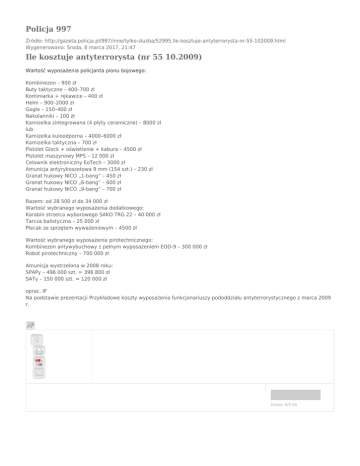 Policja 997 Źródło: http://gazeta.policja.pl/997/inne/tylko-sluzba/52995,Ile-kosztuje-antyterrorysta-nr-55-102009.html Wygenerowano: Środa, 8 marca 2017, 21:47 Ile kosztuje antyterrorysta (nr 55 10.2009) Wartość wyposażenia policjanta pionu bojowego: Kombinezon – 900 zł Buty taktyczne – 400–700 zł Kominiarka + rękawice – 400 zł Hełm – 900–2000 zł Gogle – 150–400 zł Nakolanniki – 100 zł Kamizelka zintegrowana (4 płyty ceramiczne) – 8000 zł lub Kamizelka kuloodporna – 4000–6000 zł Kamizelka taktyczna – 700 zł Pistolet Glock + oświetlenie + kabura – 4500 zł Pistolet maszynowy MP5 – 12 000 zł Celownik elektroniczny EoTech – 3000 zł Amunicja antyrykoszetowa 9 mm (154 szt.) – 230 zł Granat hukowy NICO „1-bang” – 450 zł Granat hukowy NICO „6-bang” – 600 zł Granat hukowy NICO „9-bang” – 700 zł Razem: od 28 500 zł do 34 000 zł Wartość wybranego wyposażenia dodatkowego: Karabin strzelca wyborowego SAKO TRG 22 – 40 000 zł Tarcza balistyczna – 25 000 zł Plecak ze sprzętem wyważeniowym – 4500 zł Wartość wybranego wyposażenia pirotechnicznego: Kombinezon antywybuchowy z pełnym wyposażeniem EOD‑9 – 300 000 zł Robot pirotechniczny – 700 000 zł Amunicja wystrzelona w 2008 roku: SPAPy – 496 000 szt. = 396 800 zł SATy – 150 000 szt. = 120 000 zł oprac. IF Na podstawie prezentacji Przykładowe koszty wyposażenia funkcjonariuszy pododdziału antyterrorystycznego z marca 2009 r. Ocena: 0/5 (0)