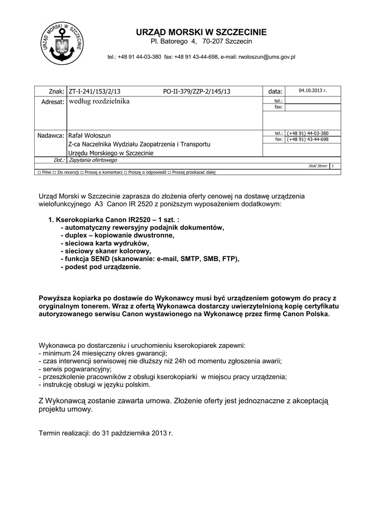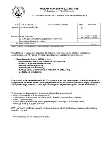 URZĄD MORSKI W SZCZECINIE Pl. Batorego 4, 70-207 Szczecin tel.: +48 91 44-03-380 fax: +48 91 43-44-698, e-mail: [email protected] Znak: ZT-I-241/153/2/13 Adresat: PO-II-379/ZZP-2/145/13 według rozdzielnika data: 04.10.2013 r. tel.: fax: Nadawca: Rafał Wołoszun Z-ca Naczelnika Wydziału Zaopatrzenia i Transportu Urzędu Morskiego w Szczecinie tel.: fax: (+48 91) 44-03-380 (+48 91) 43-44-698 Dot.: Zapytania ofertowego Ilość Stron: Pilne Do recenzji Proszę o komentarz Proszę o odpowiedź 1 Proszę przekazać dalej Urząd Morski w Szczecinie zaprasza do złożenia oferty cenowej na dostawę urządzenia wielofunkcyjnego A3 Canon IR 2520 z poniższym wyposażeniem dodatkowym: 1. Kserokopiarka Canon IR2520 – 1 szt. : - automatyczny rewersyjny podajnik dokumentów, - duplex – kopiowanie dwustronne, - sieciowa karta wydruków, - sieciowy skaner kolorowy, - funkcja SEND (skanowanie: e-mail, SMTP, SMB, FTP), - podest pod urządzenie. Powyższa kopiarka po dostawie do Wykonawcy musi być urządzeniem gotowym do pracy z oryginalnym tonerem. Wraz z ofertą Wykonawca dostarczy uwierzytelnioną kopię certyfikatu autoryzowanego serwisu Canon wystawionego na Wykonawcę przez firmę Canon Polska. Wykonawca po dostarczeniu i uruchomieniu kserokopiarek zapewni: - minimum 24 miesięczny okres gwarancji; - czas interwencji serwisowej nie dłuższy niż 24h od momentu zgłoszenia awarii; - serwis pogwarancyjny; - przeszkolenie pracowników z obsługi kserokopiarki w miejscu pracy urządzenia; - instrukcję obsługi w języku polskim. Z Wykonawcą zostanie zawarta umowa. Złożenie oferty jest jednoznaczne z akceptacją projektu umowy. Termin realizacji: do 31 października 2013 r. URZĄD MORSKI W SZCZECINIE Pl. Batorego 4, 70-207 Szczecin tel.: +48 91 44-03-380 fax: +48 91 43-44-698, e-mail: [email protected] Prosimy o ofertę zawierającą informację o: - formie dostawy (jeżeli transport nie jest wliczony w cenę towaru proszę wyraźnie to zaznaczyć), - wartości netto i brutto za w/w towar + stawka VAT, - terminie ważności oferty, - formie płatności. Jedynym kryterium wyboru oferty jest cena. Osoba upoważniona do kontaktu z Wykonawcami: Pan Rafał Wołoszun, Tel. 091 – 44 – 03 – 380, 609 – 693 – 281; e-mail: [email protected] Odpowiedź prosimy przesłać w zamkniętej kopercie do dnia 14.10.2013 r. do godz. 10.00 na adres: Urząd Morski w Szczecinie , Pl. Batorego 4, 70-207 Szczecin, Zespół ds. Zamówień Publicznych pok. 110 z dopiskiem ”Oferta na dostawę urządzenia wielofunkcyjnego Canon – Nie otwierać przed 14.10.2013 r.” Z poważaniem
