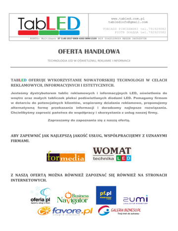 www.tabled.com.pl [email protected] TOBIASZ PINCZEWSKI tel.791929082 PIOTR DOŁĘGA tel.792925582 KONTO: Multibank 37 1140 2017 0000 4202 0890 2159 NIP 5542539459 REGON 340509708 OFERTA HANDLOWA TECHNOLOGIA LED W OŚWIETLENIU, REKLAMIE I INFORMACJI TABLED OFERUJE WYKORZYSTANIE NOWATORSKIEJ TECHNOLOGII W CELACH REKLAMOWYCH, INFORMACYJNYCH I ESTETYCZNYCH. Jesteśmy dystrybutorem tablic reklamowych i informacyjnych LED, oświetlenia do wnętrz oraz małych tabliczek pleksi podświetlanych diodami LED. Pomagamy firmom w dotarciu do potencjalnych klientów, wspieramy działania reklamowe, proponujemy alternatywną formę przekazania informacji i doradzamy najlepsze rozwiązania. Chcielibyśmy zaprosić państwa do współpracy i skorzystania z usług naszej firmy. Zapraszamy do zapoznania się z naszą ofertą. ABY ZAPEWNIĆ JAK NAJLEPSZĄ JAKOŚĆ USŁUG, WSPÓŁPRACUJEMY Z UZNANYMI FIRMAMI. Z NASZĄ OFERTĄ MOŻNA RÓWNIEŻ ZAPOZNAĆ SIĘ RÓWNIEŻ NA STRONACH INTERNETOWYCH. TABLICE REKLAMOWE LED BUDOWA Tablice, które produkuje firma WOMAT, zbudowane są ze sprawdzonych, amerykańskich podzespołów, które przechodzą testy w komorze termicznej, w temperaturze do 100st. Celsjusza. Doświadczony producent dba o każdy detal! Tablice są wykonane z blachy aluminiowej, przez co są odporne na korozję i zniszczenia, a przez to pozostają niezwykle lekkie. Wandaloodporna i hermetyzowana obudowa potrafi wytrzymać uderzenie twardym przedmiotem oraz nie straszne jej będą ekstremalne warunki atmosferyczne, jak upał, mróz czy śnieg. Grubość obudowy to zaledwie 5 cm. W każdy egzemplarz wbudowany jest termometr i zegar. KORZYŚCI Inwestując w naszą tablicę LED uzyskają Państwo możliwość wyświetlania dowolnego tekstu, grafiki lub animacji. Wielkość i właściwości tablicy dopasowujemy w zależności od potrzeb i na życzenie – to Państwo wybierają od wielkości, przez raster aż po kolor diod. Co więcej, użytkownik sam może zarządzać informacją (modyfikacja, dodawanie, usuwanie) w zależności od potrzeb, przy użyciu prostego w obsłudze programu komputerowego. Sterowanie – bezprzewodowo (GSM, Wi-Fi, Internet) oraz przewodowo (kabel USB), wybór należy do Państwa. Tablice są dobrze widoczne o każdej porze dnia i pod każdym kątem dzięki wbudowanemu czujnikowi światła. Powierzchnie tablicy można podzielić na pola i dowolnie nimi zarządzać, zapisywać zmiany w jej wewnętrznej, nieulotnej pamięci. DOSTĘPNE KOLORY DIOD: CENNIK Mogą państwo zamówić tablicę dowolnej wielkości (wysokość od 16cm, długość dowolna). Nie sprzedajmy gotowego produktu – dostosowujemy go do Państwa potrzeb. Oprócz wielkości ważny jest również tzw. raster LED, czyli rozstaw diod. Im diody na tablicy są bliżej siebie, tym lepiej są widoczne z bliższej odległości. Jeżeli rozstaw jest rzadszy – treść będzie lepiej widoczna z daleka. Oferujemy trzy kategorie rasterów: 20mm, 25mm i 30mm. Jeżeli więc szukają Państwo tablicy, która miałaby być kierowana do przechodniów, proponujemy raster 20mm i analogicznie – dla kierowców 30mm. Wartość „środkowa” jest najbardziej uniwersalna. Jeżeli będą Państwo zainteresowani wyceną wybranego rozmiaru tablicy – zapraszamy do kontaktowania się z nami telefonicznie lub za pośrednictwem poczty elektronicznej. Poniżej prezentujemy ceny przykładowych tablic o skrajnych rozmiarach (ceny netto w PLN, uwzględniają serwis, dowóz do klienta, przeszkolenie i pełne wyposażenie) oraz wizualizacje przykładowych tablic. Raster LED = 20mm Rozmiar [cm] 19 131 99 2 036 12 788 259 4 596 33 268 Raster LED = 25mm Rozmiar [cm] 42,5 122,5 102,5 3 060 8 180 285,5 7 668 22 004 Raster LED = 30mm Rozmiar [cm] 26 122 146 2 036 8 180 242 3 060 13 300 PROCEDURA ZAMAWIANIA CHĘĆ ZWIĘKSZENIA LICZBY KLIENTÓW KONTAKT Z PRZEDSTAWICIELEM TABLED DOBRANIE NAJLEPSZEJ TABLICY NA SWOJE POTRZEBY I ZŁOŻENIE ZAMÓWIENIA ZA POŚREDNICTWEM PRZEDSTAWICIELA FINANSOWANIE GOTÓWKA