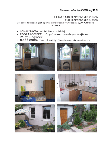 Numer oferty:028a/05 CENA: 140 PLN/doba dla 2 osób 190 PLN/doba dla 4 osób Do ceny doliczana jest opłata klimatyczna wynosząca 3,80 PLN/doba za osobę LOKALIZACJA: ul. M. Konopnickiej RODZAJ OBIEKTU: Część domu z osobnym wejściem 25 m2 + ogródek ILOŚĆ OSÓB: max. 4 osoby (dwie kanapy dwuosobowe ) Numer oferty: 028a/05 LOKALIZACJA: ul. M. Konopnickiej Lp. PRZEDMIOT OCENY UWAGI 1. Nowe/stare budownictwo Stare odrestaurowane budownictwo 2. Nowe/stare meble Nowe meble 3. Parking na posesji/GaraŜ Miejsce postojowe przed posesją 4. Balkon / taras / ogródek Ogródek 5. Telewizor (Kablówka, TV Sat), Radio TV kablowa, radio 6. Dostęp do telefonu Nie 7. Dostęp do internetu Nie 8. Dostęp do kuchni: 9. • Lodówka • Kuchenka • Czajnik bezprzewodowy • WyposaŜenie (sztućce, zastawa, garnki) Kuchnia z pełnym wyposaŜeniem, lodówka, kuchenka elektryczna z 2 panikami, czajnik bezprzewodowy Dostęp do łazienki: • • • • Wanna Kabina prysznicowa Oddzielnie WC Łazienka współuŜytkowana Łazienka z prysznicem i WC 10. Pościel, ręczniki Pościel 11. Dostęp do szafy / półek Tak 12. Pobyt ze zwierzątkiem Tak 13. Pokój zamykany na klucz 14. Niepełnosprawni (winda, podjazd) Nie 15. Plac zabaw dla dzieci Nie 16. 17. Lokalizacja • Centrum – Dworzec PKP • PlaŜa, park • Dzielnica • Komunikacja miejska Osoby palące Tak 18. Piwnica/schowek Tak 19. Faktura VAT lub Rachunek rachunek Spokojna okolica w sąsiedztwie lasu, 10 minut pieszo do centrum i dworca PKP, 20 minut do morza, 10 minut do Opery Leśnej