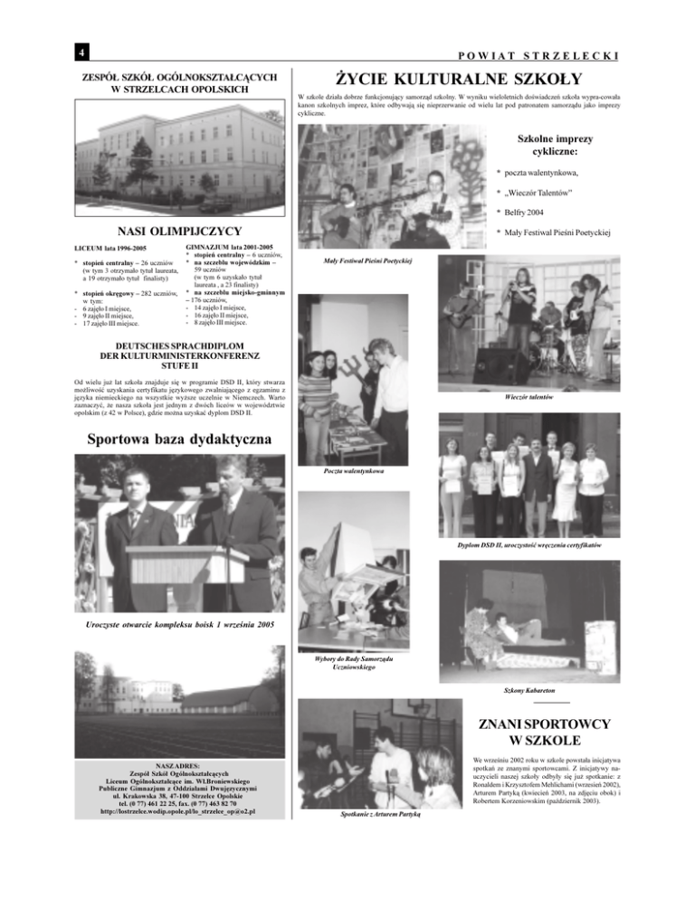 4 P O W I A T ¯YCIE KULTURALNE SZKO£Y ZESPÓ£ SZKÓ£ OGÓLNOKSZTA£C¥CYCH W STRZELCACH OPOLSKICH S T R Z E L E C K I W szkole dzia³a dobrze funkcjonuj¹cy samorz¹d szkolny. W wyniku wieloletnich dowiadczeñ szko³a wypra-cowa³a kanon szkolnych imprez, które odbywaj¹ siê nieprzerwanie od wielu lat pod patronatem samorz¹du jako imprezy cykliczne. Szkolne imprezy cykliczne: * poczta walentynkowa, * Wieczór Talentów * Belfry 2004 NASI OLIMPIJCZYCY LICEUM lata 1996-2005 GIMNAZJUM lata 2001-2005 * * * stopieñ centralny 26 uczniów Ma³y Festiwal Pieni Poetyckiej 59 uczniów (w tym 3 otrzyma³o tytu³ laureata, a 19 otrzyma³o tytu³ stopieñ centralny 6 uczniów, na szczeblu wojewódzkim * Ma³y Festiwal Pieni Poetyckiej (w tym 6 uzyska³o tytu³ finalisty) laureata , a 23 finalisty) stopieñ okrêgowy 282 uczniów, * w tym: 176 uczniów, - 6 zajê³o I miejsce, - - 9 zajê³o II miejsce, - 16 zajê³o II miejsce, - 17 zajê³o III miejsce. - 8 zajê³o III miejsce. * na szczeblu miejsko-gminnym 14 zajê³o I miejsce, DEUTSCHES SPRACHDIPLOM DER KULTURMINISTERKONFERENZ STUFE II Od wielu ju¿ lat szko³a znajduje siê w programie DSD II, który stwarza mo¿liwoæ uzyskania certyfikatu jêzykowego zwalniaj¹cego z egzaminu z Wieczór talentów jêzyka niemieckiego na wszystkie wy¿sze uczelnie w Niemczech. Warto zaznaczyæ, ¿e nasza szko³a jest jednym z dwóch liceów w województwie opolskim (z 42 w Polsce), gdzie mo¿na uzyskaæ dyplom DSD II. Sportowa baza dydaktyczna Poczta walentynkowa Dyplom DSD II, uroczystoæ wrêczenia certyfikatów Uroczyste otwarcie kompleksu boisk 1 wrzenia 2005 Wybory do Rady Samorz¹du Uczniowskiego Szkony Kabareton ZNANI SPORTOWCY W SZKOLE We wrzeniu 2002 roku w szkole powsta³a inicjatywa NASZ ADRES: spotkañ ze znanymi sportowcami. Z inicjatywy na- Zespó³ Szkó³ Ogólnokszta³c¹cych uczycieli naszej szko³y odby³y siê ju¿ spotkanie: z Liceum Ogólnokszta³c¹ce im. W³.Broniewskiego Ronaldem i Krzysztofem Mehlichami (wrzesieñ 2002), Publiczne Gimnazjum z Oddzia³ami Dwujêzycznymi Arturem Partyk¹ (kwiecieñ 2003, na zdjêciu obok) i ul. Krakowska 38, 47-100 Strzelce Opolskie Robertem Korzeniowskim (padziernik 2003). tel. (0 77) 461 22 25, fax. (0 77) 463 82 70 http://lostrzelce.wodip.opole.pl/[email protected] Spotkanie z Arturem Partyk¹